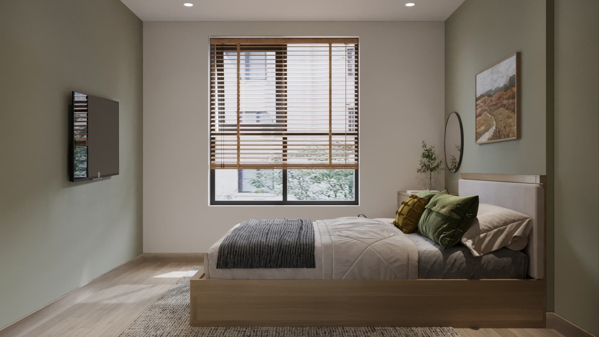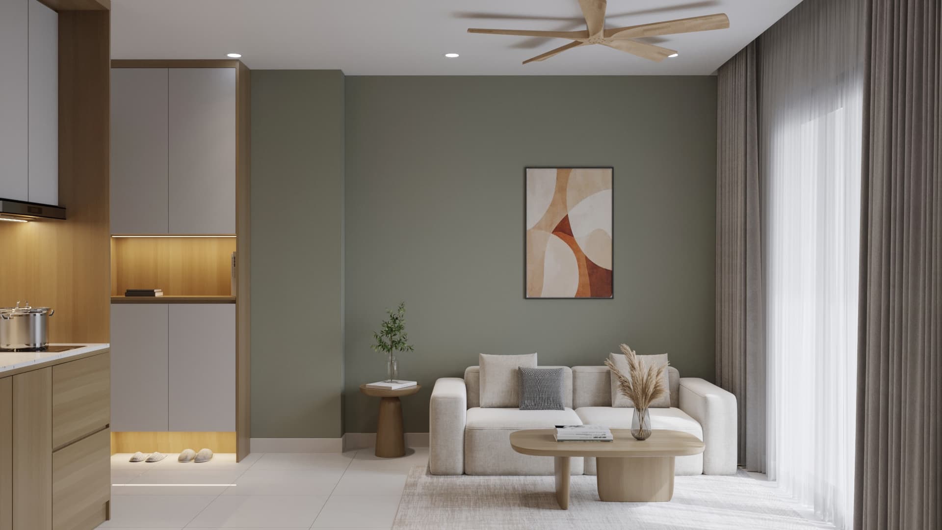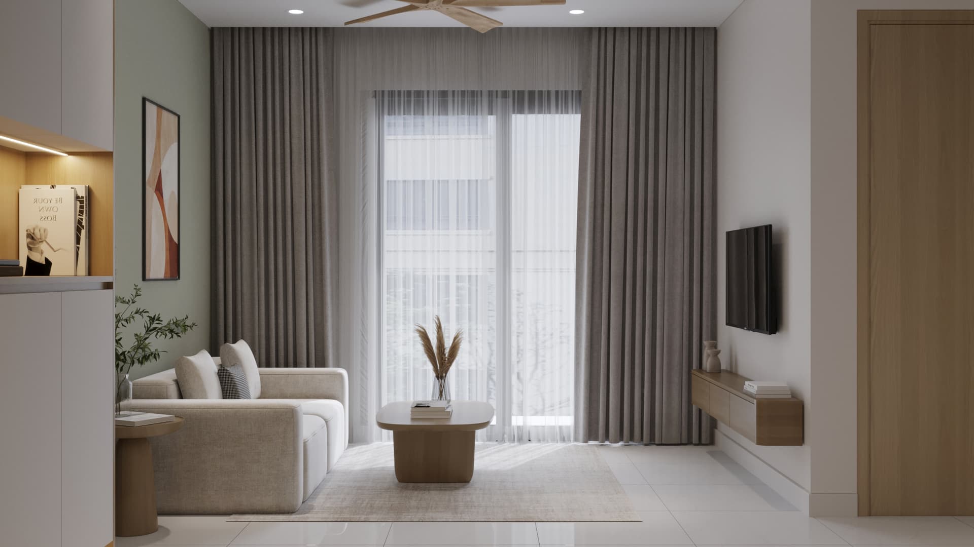 Căn hộ được thiết kế theo phong cách tối giản, nổi bật với gam màu trung tính nhẹ nhàng, đường nét gọn gàng và bố cục hài hòa. Nội thất tinh giản nhưng tiện nghi, kết hợp ánh sáng tự nhiên và vài điểm nhấn trang trí tinh tế, mang lại không gian sống thanh lịch, ấm cúng và thoáng đãng