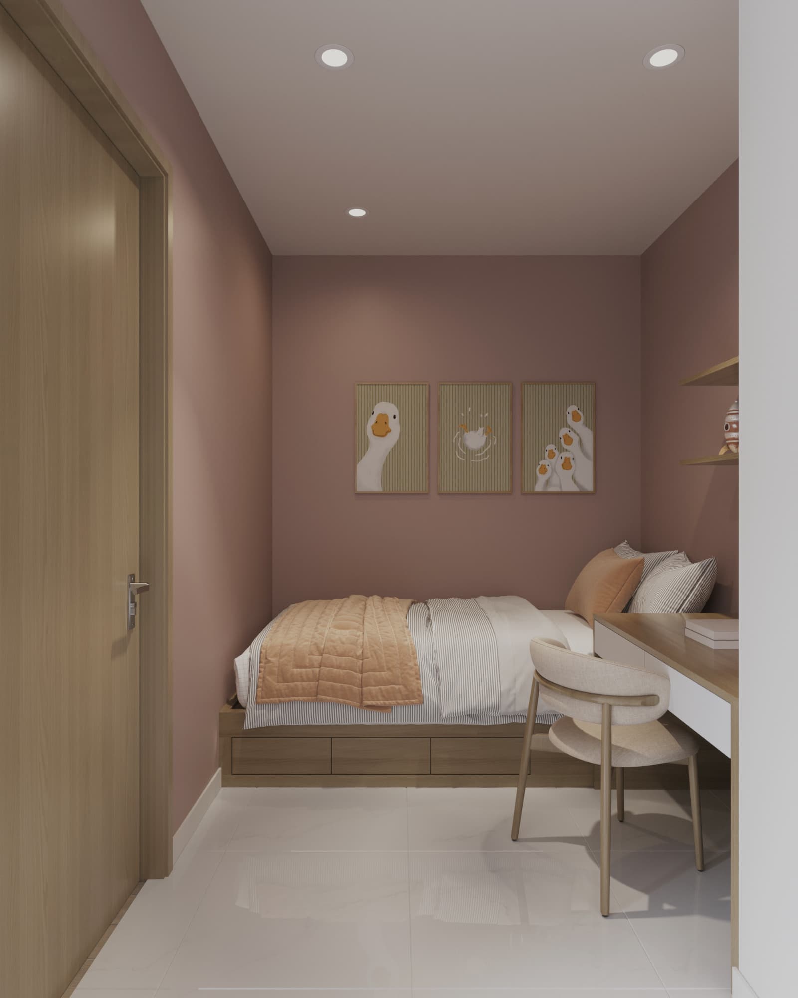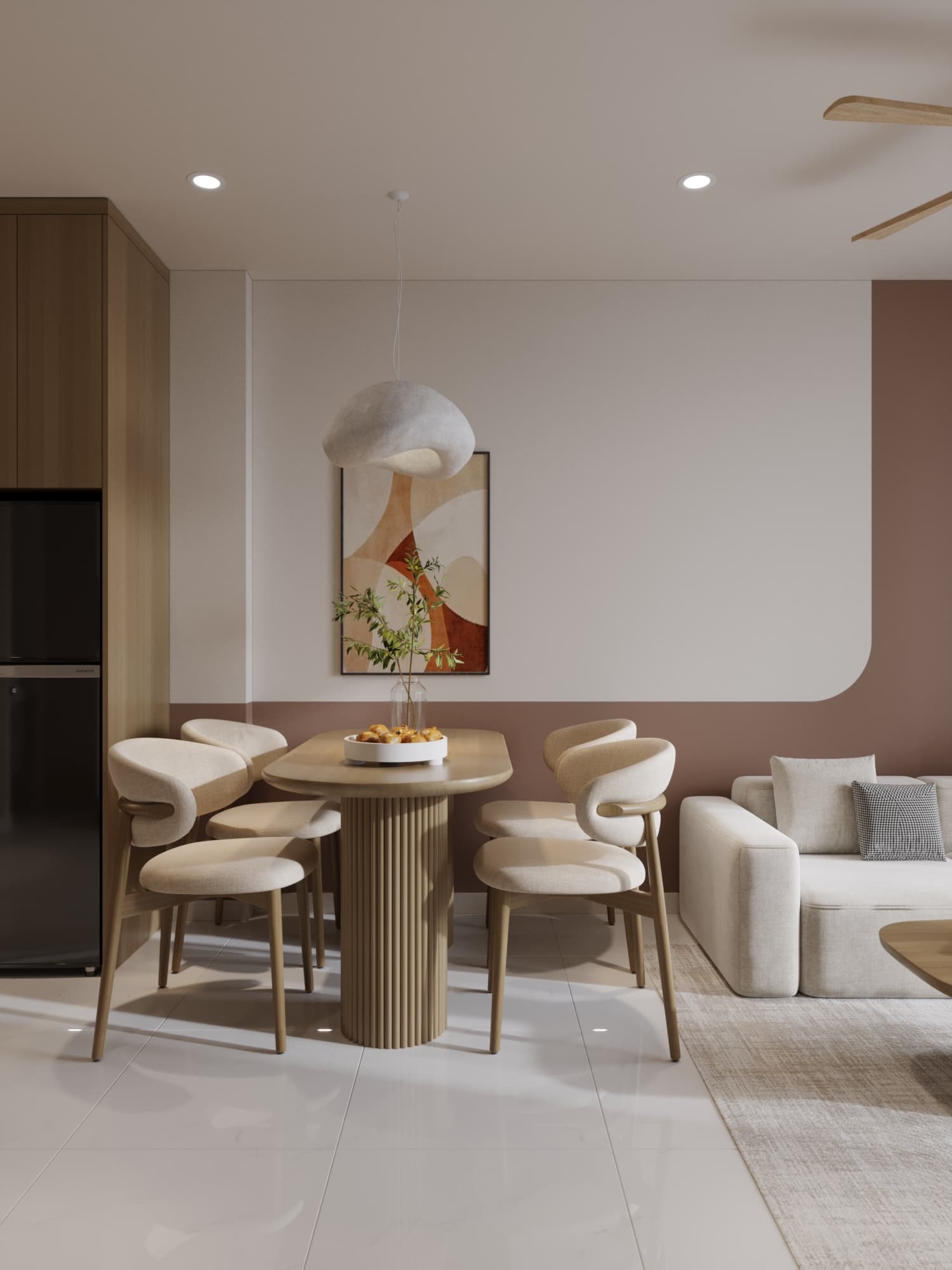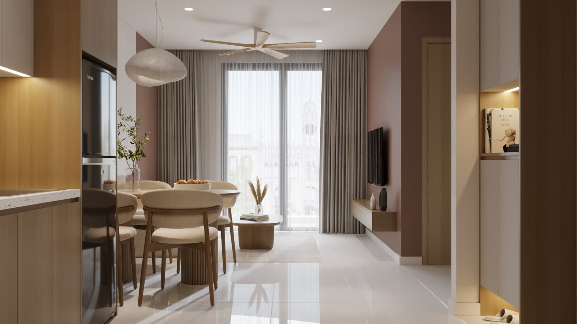Căn hộ được thiết kế theo phong cách tối giản, nổi bật với gam màu trung tính nhẹ nhàng, đường nét gọn gàng và bố cục hài hòa. Nội thất tinh giản nhưng tiện nghi, kết hợp ánh sáng tự nhiên và vài điểm nhấn trang trí tinh tế, mang lại không gian sống thanh lịch, ấm cúng và thoáng đãng