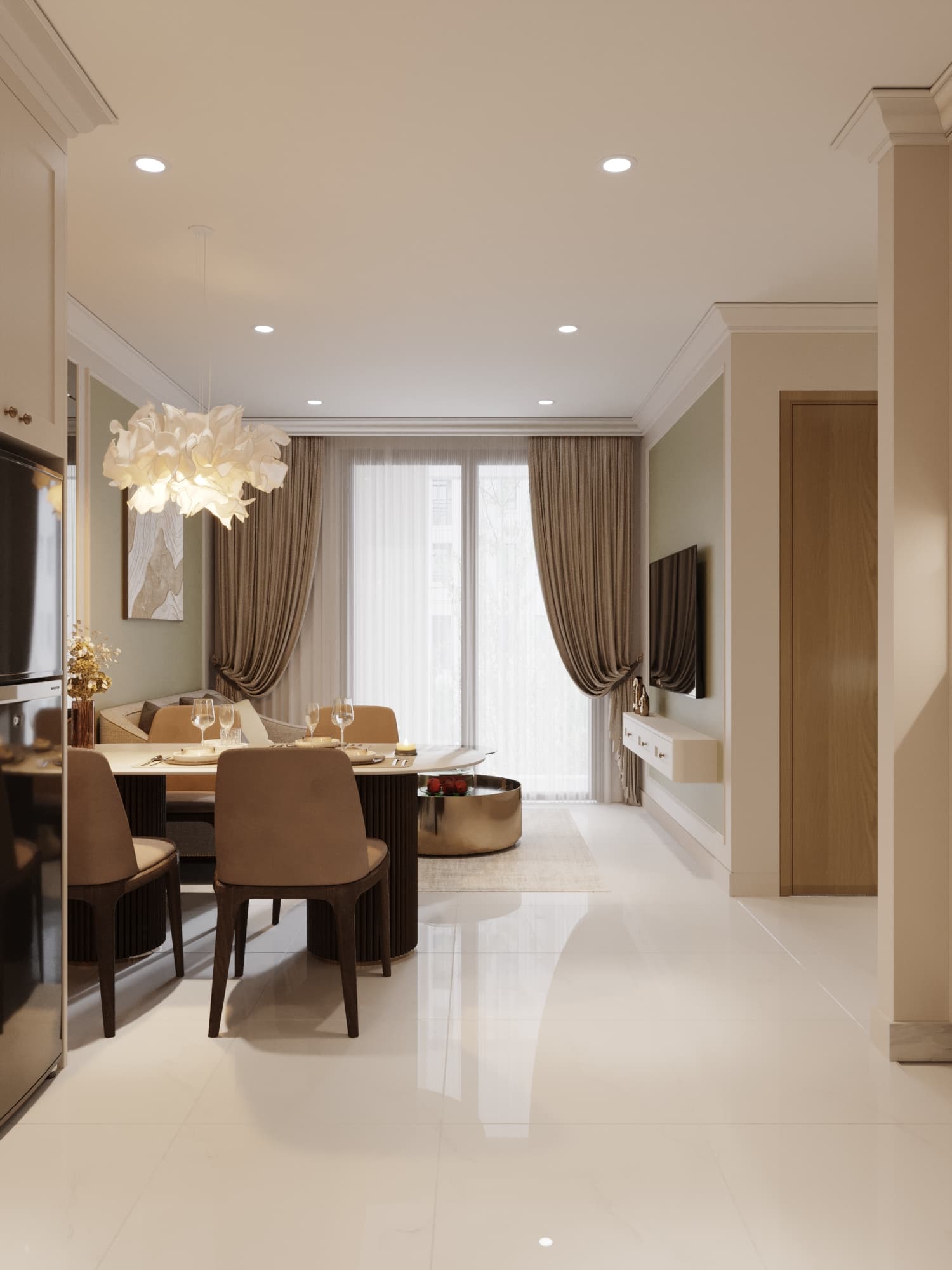 Căn hộ mang phong cách tân cổ điển, nổi bật với gam màu trung tính sang trọng, phào chỉ tinh tế và nội thất hiện đại pha chút cổ điển. Sự kết hợp hài hòa giữa đường nét mềm mại, ánh sáng ấm áp và chất liệu cao cấp tạo nên không gian sống thanh lịch, tinh tế và đầy cuốn hút