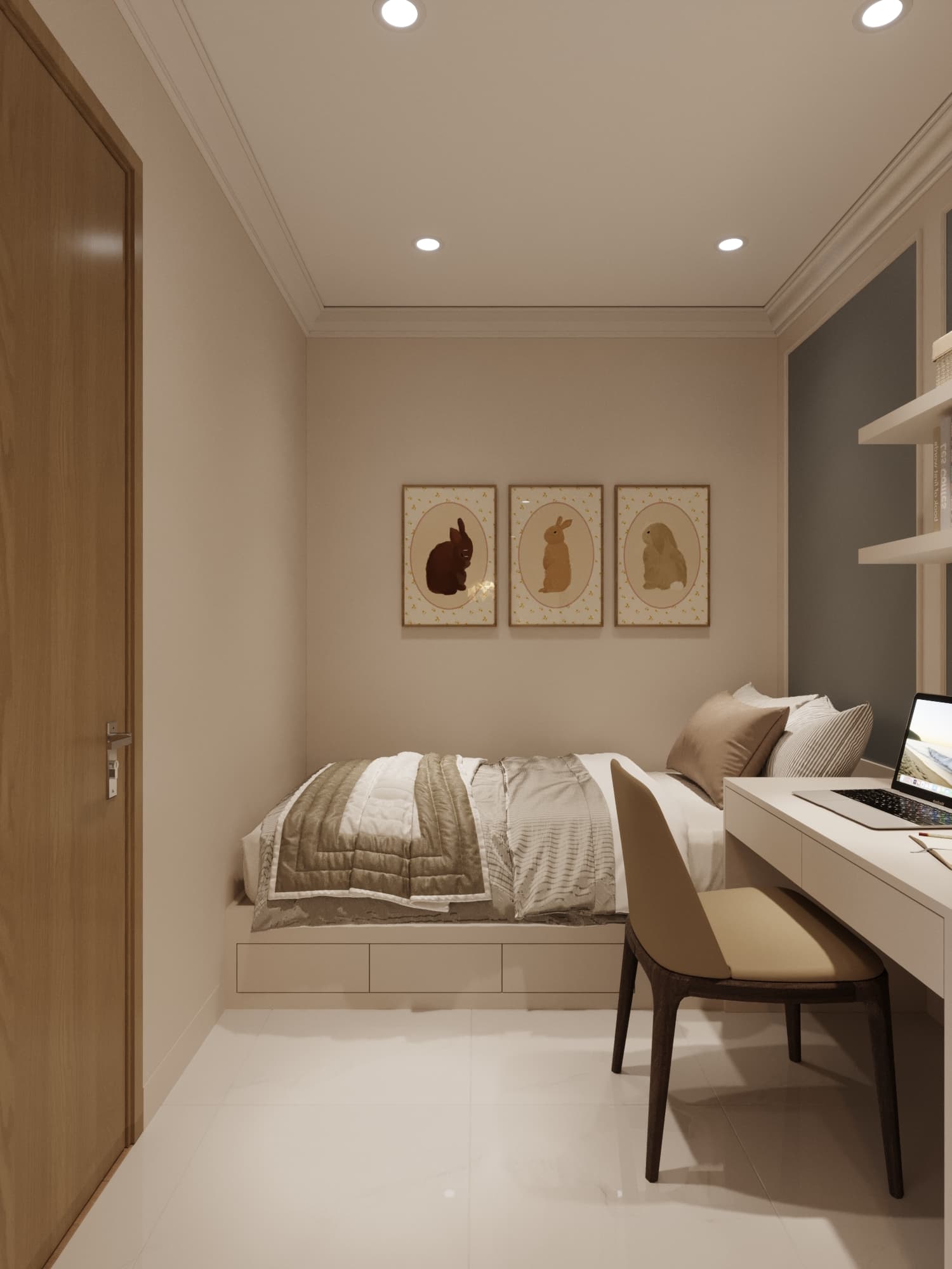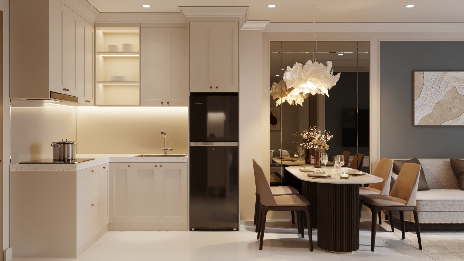 Căn hộ mang phong cách tân cổ điển, nổi bật với gam màu trung tính sang trọng, phào chỉ tinh tế và nội thất hiện đại pha chút cổ điển. Sự kết hợp hài hòa giữa đường nét mềm mại, ánh sáng ấm áp và chất liệu cao cấp tạo nên không gian sống thanh lịch, tinh tế và đầy cuốn hút
