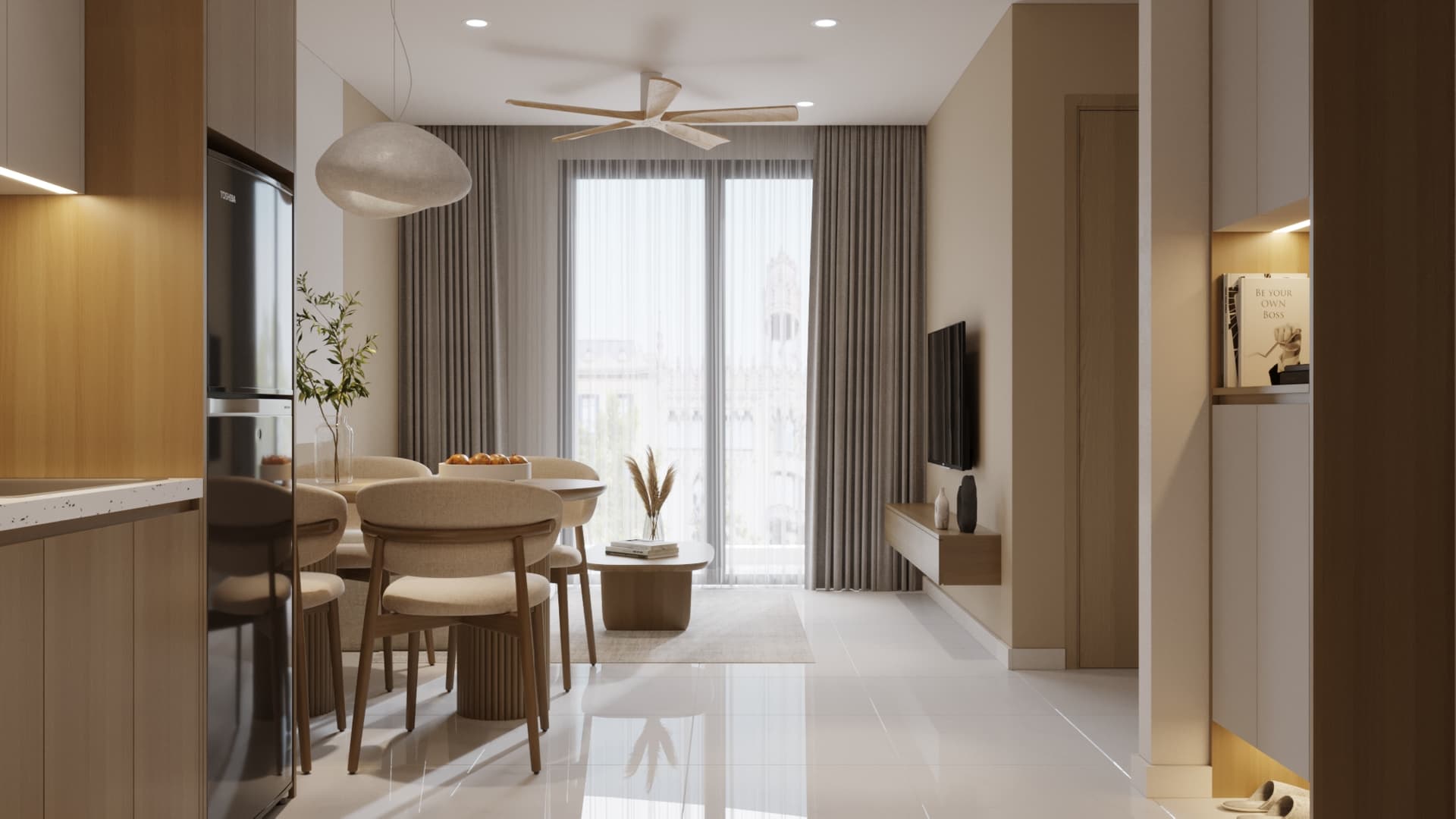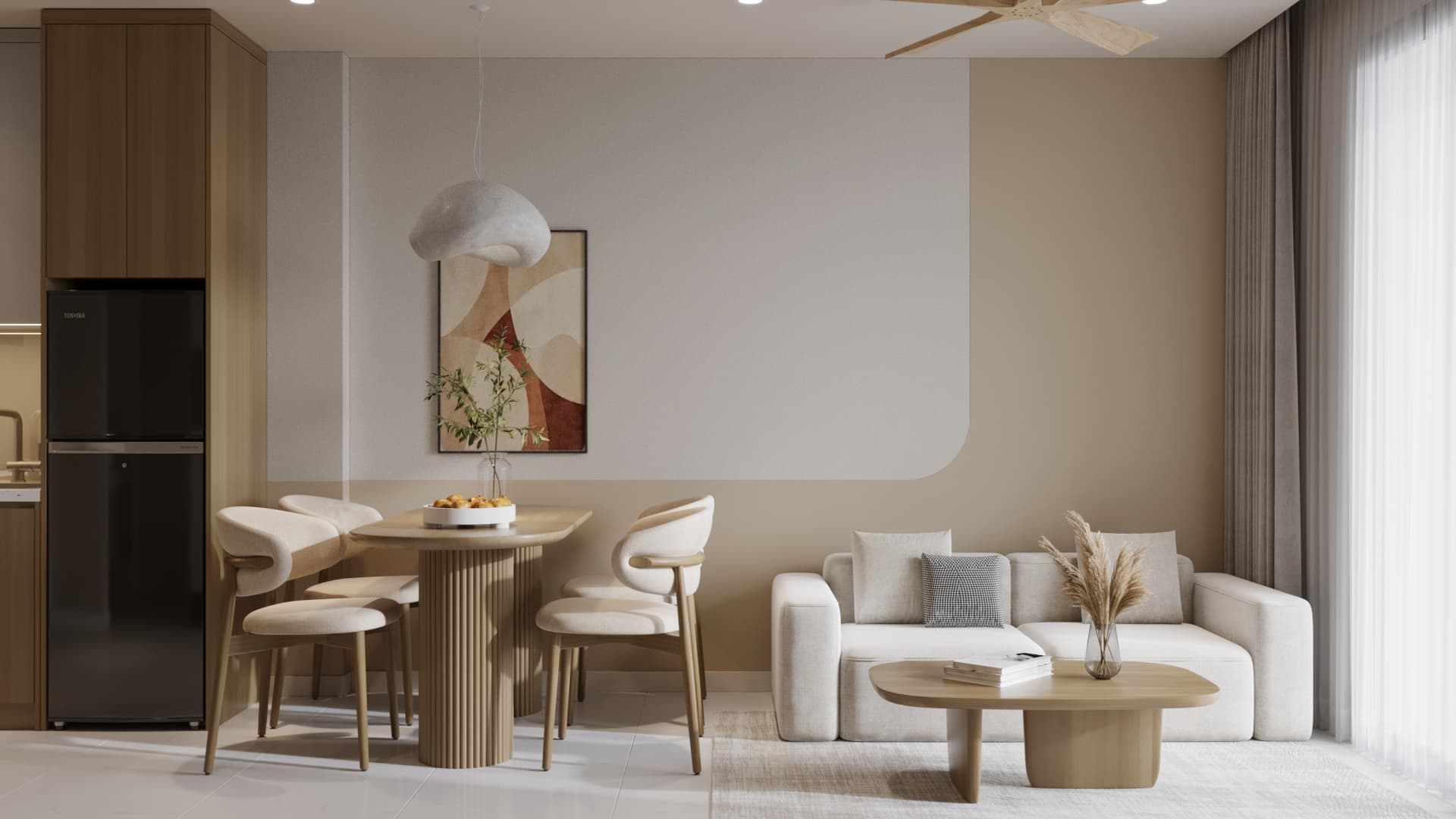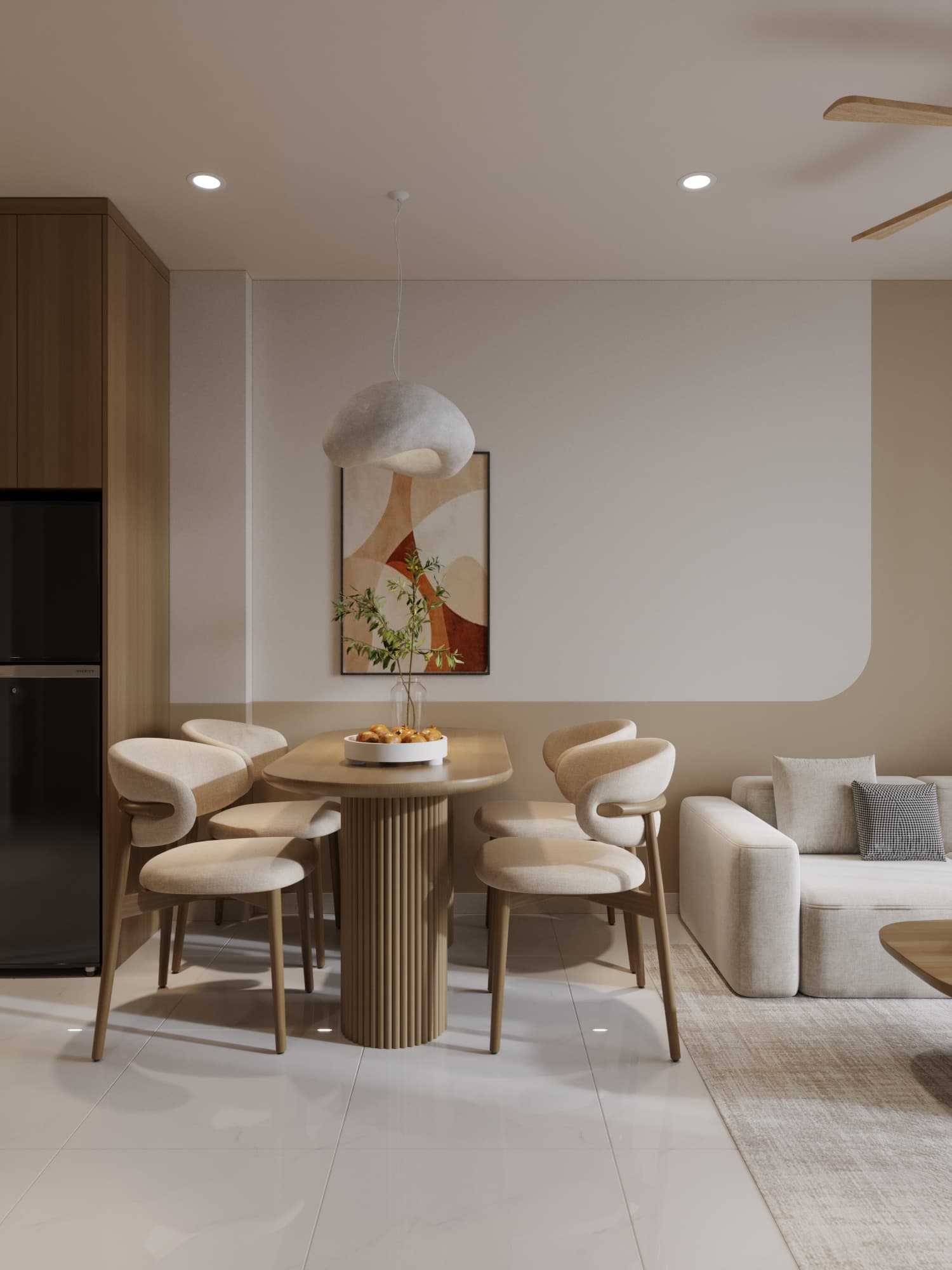 Căn hộ được thiết kế theo phong cách tối giản, nổi bật với gam màu trung tính nhẹ nhàng, đường nét gọn gàng và bố cục hài hòa. Nội thất tinh giản nhưng tiện nghi, kết hợp ánh sáng tự nhiên và vài điểm nhấn trang trí tinh tế, mang lại không gian sống thanh lịch, ấm cúng và thoáng đãng