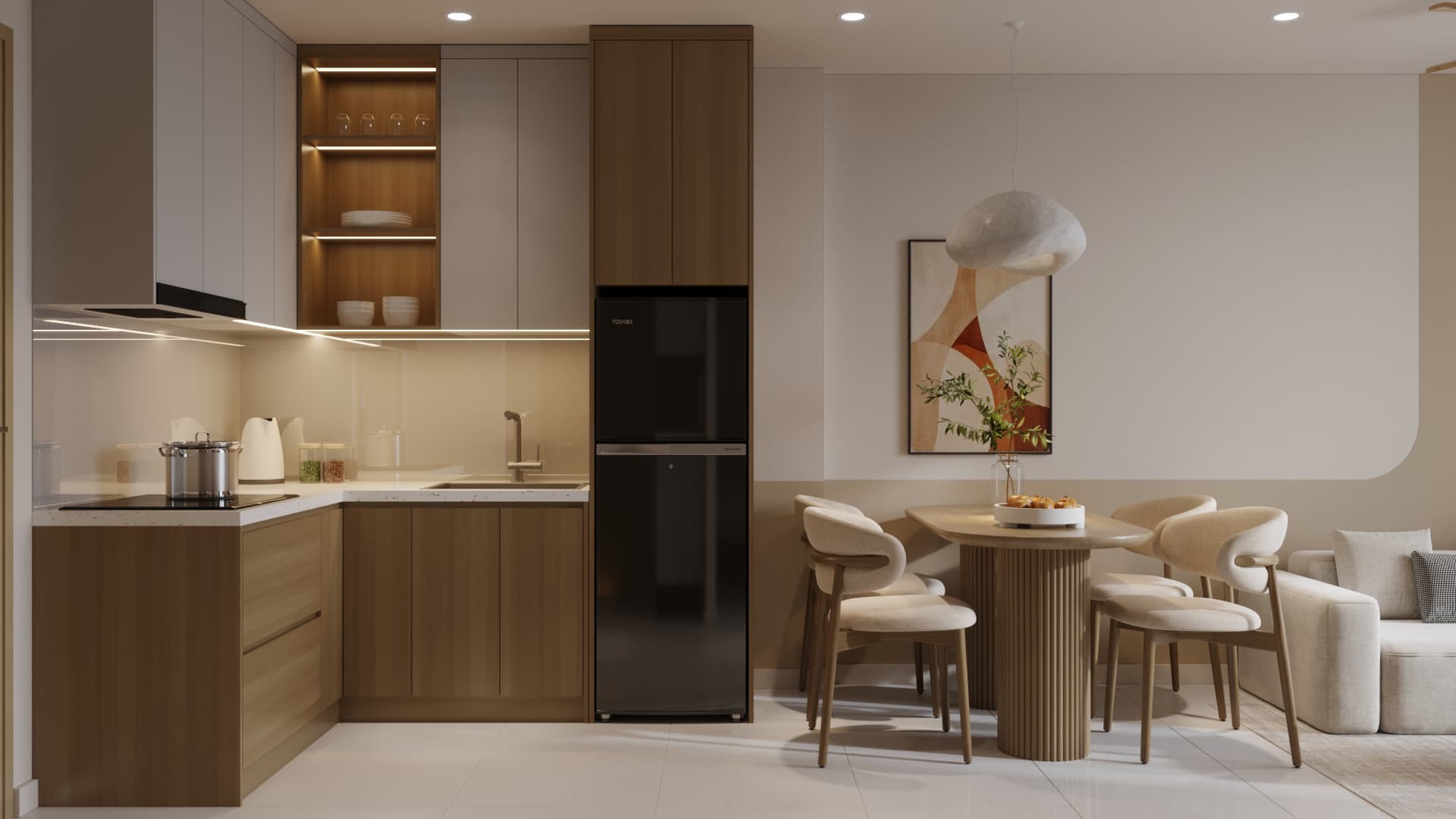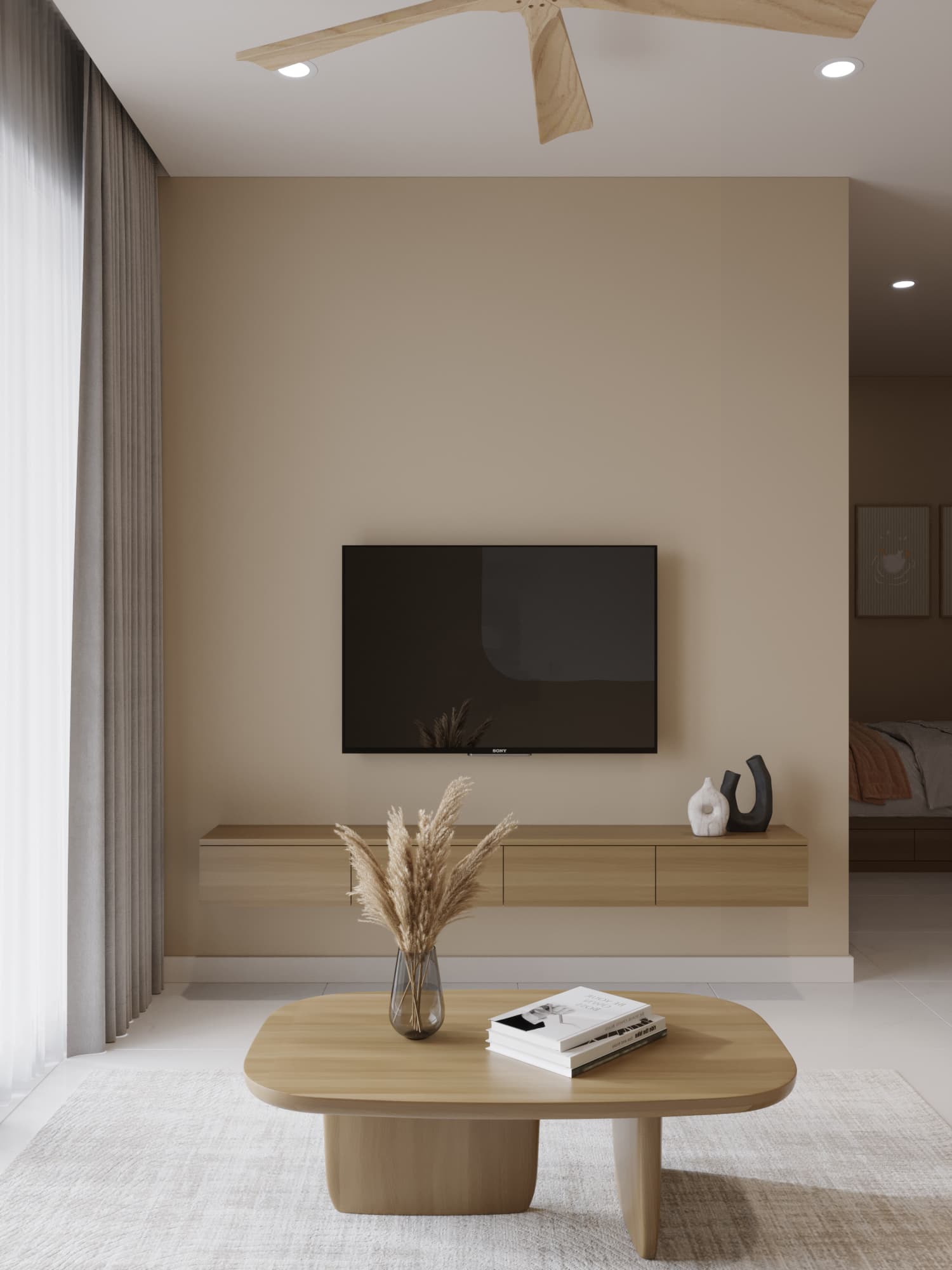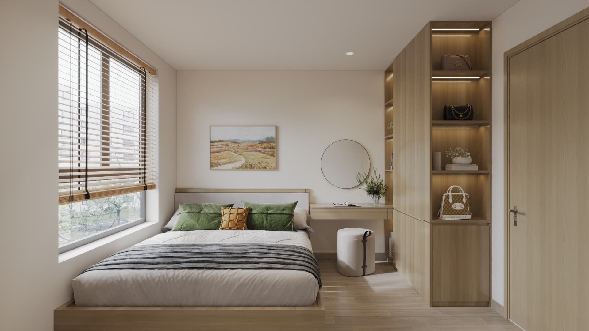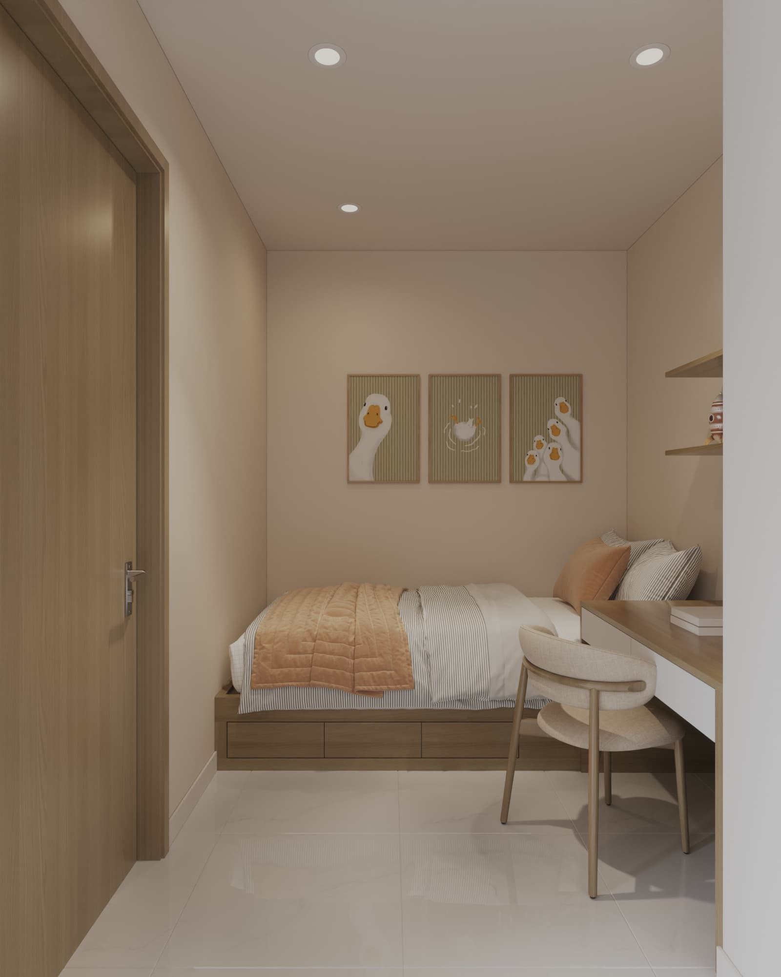 Căn hộ được thiết kế theo phong cách tối giản, nổi bật với gam màu trung tính nhẹ nhàng, đường nét gọn gàng và bố cục hài hòa. Nội thất tinh giản nhưng tiện nghi, kết hợp ánh sáng tự nhiên và vài điểm nhấn trang trí tinh tế, mang lại không gian sống thanh lịch, ấm cúng và thoáng đãng