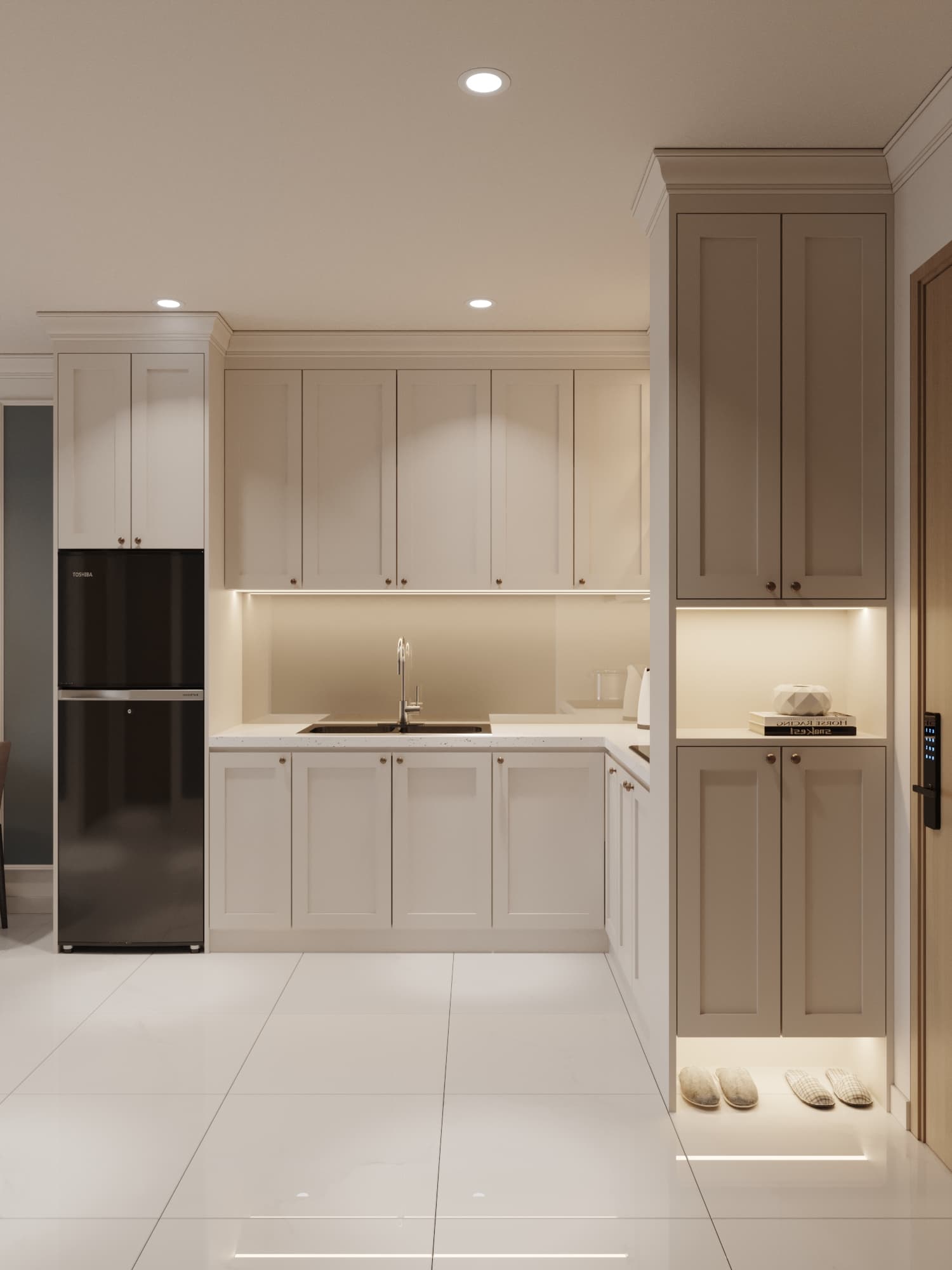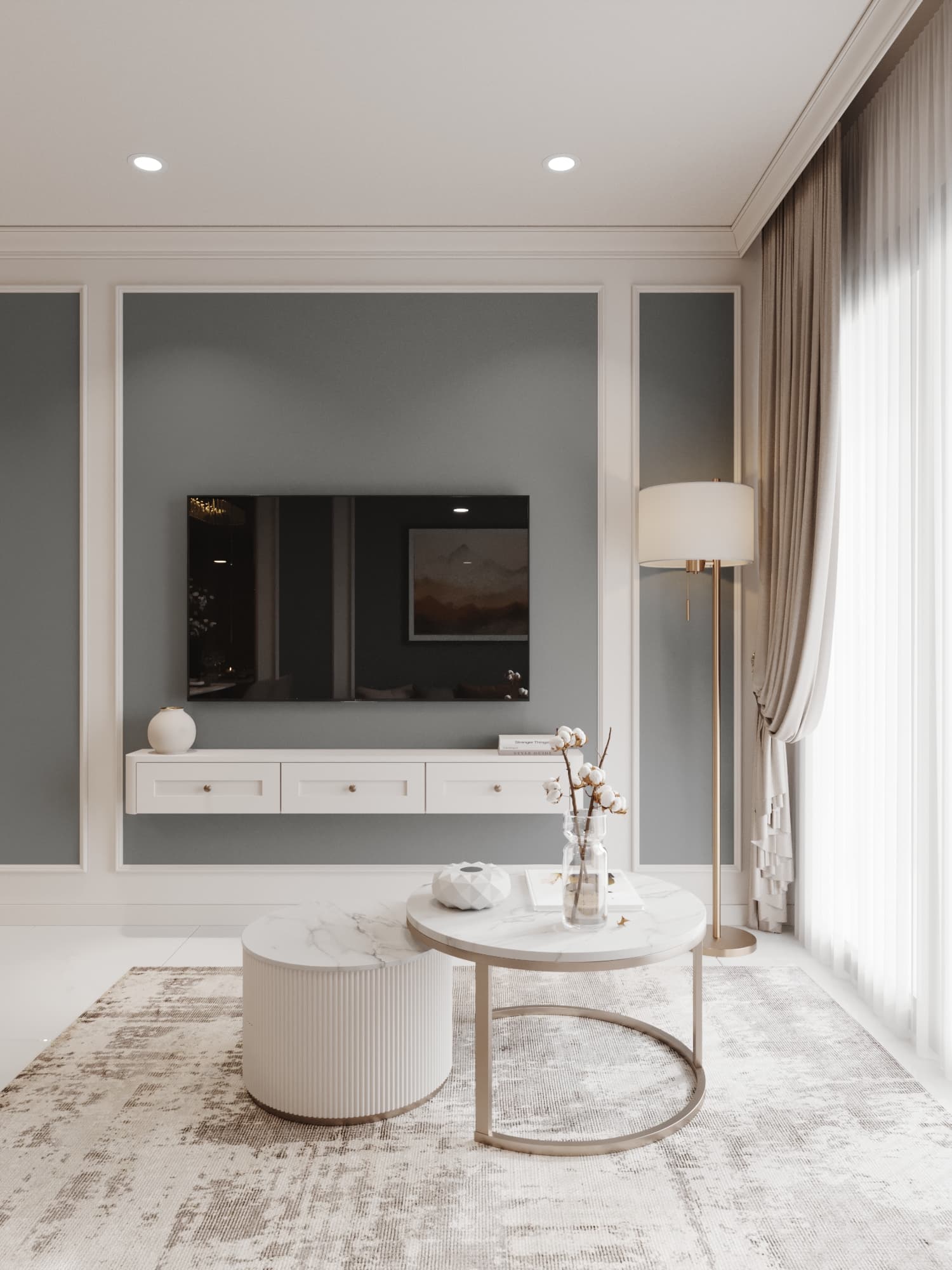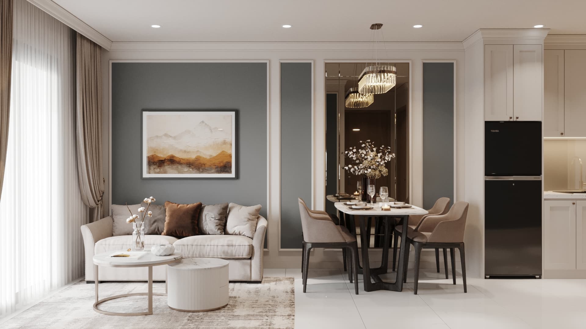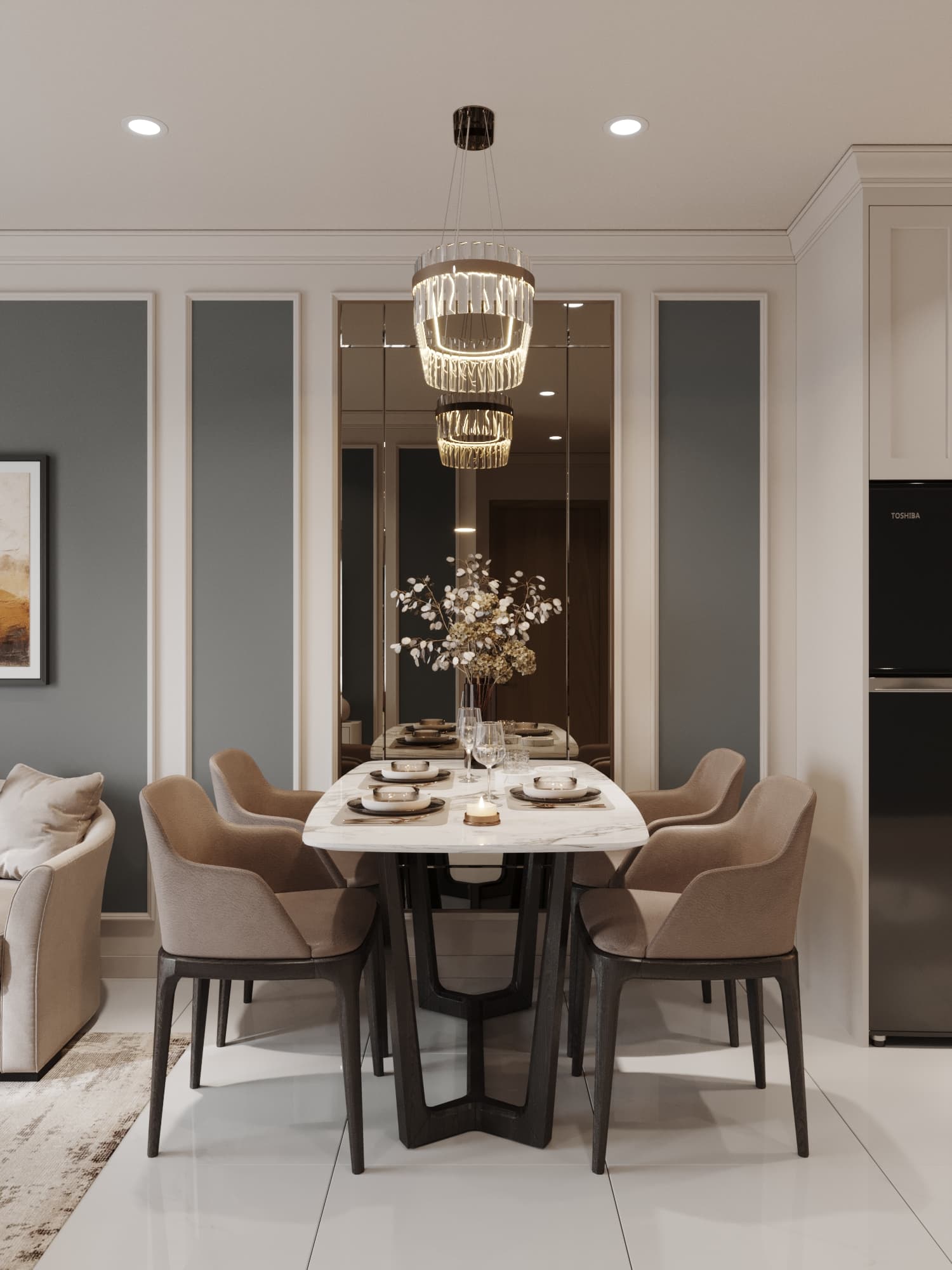 Căn hộ mang phong cách tân cổ điển, nổi bật với gam màu trung tính sang trọng, phào chỉ tinh tế và nội thất hiện đại pha chút cổ điển. Sự kết hợp hài hòa giữa đường nét mềm mại, ánh sáng ấm áp và chất liệu cao cấp tạo nên không gian sống thanh lịch, tinh tế và đầy cuốn hút
