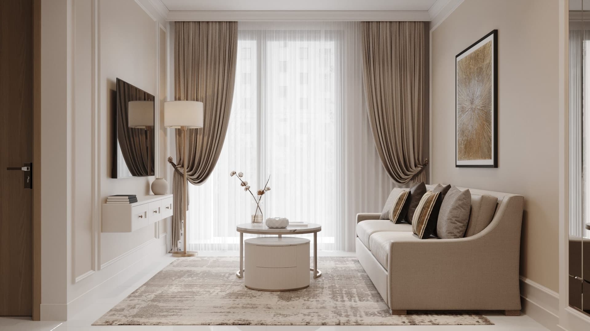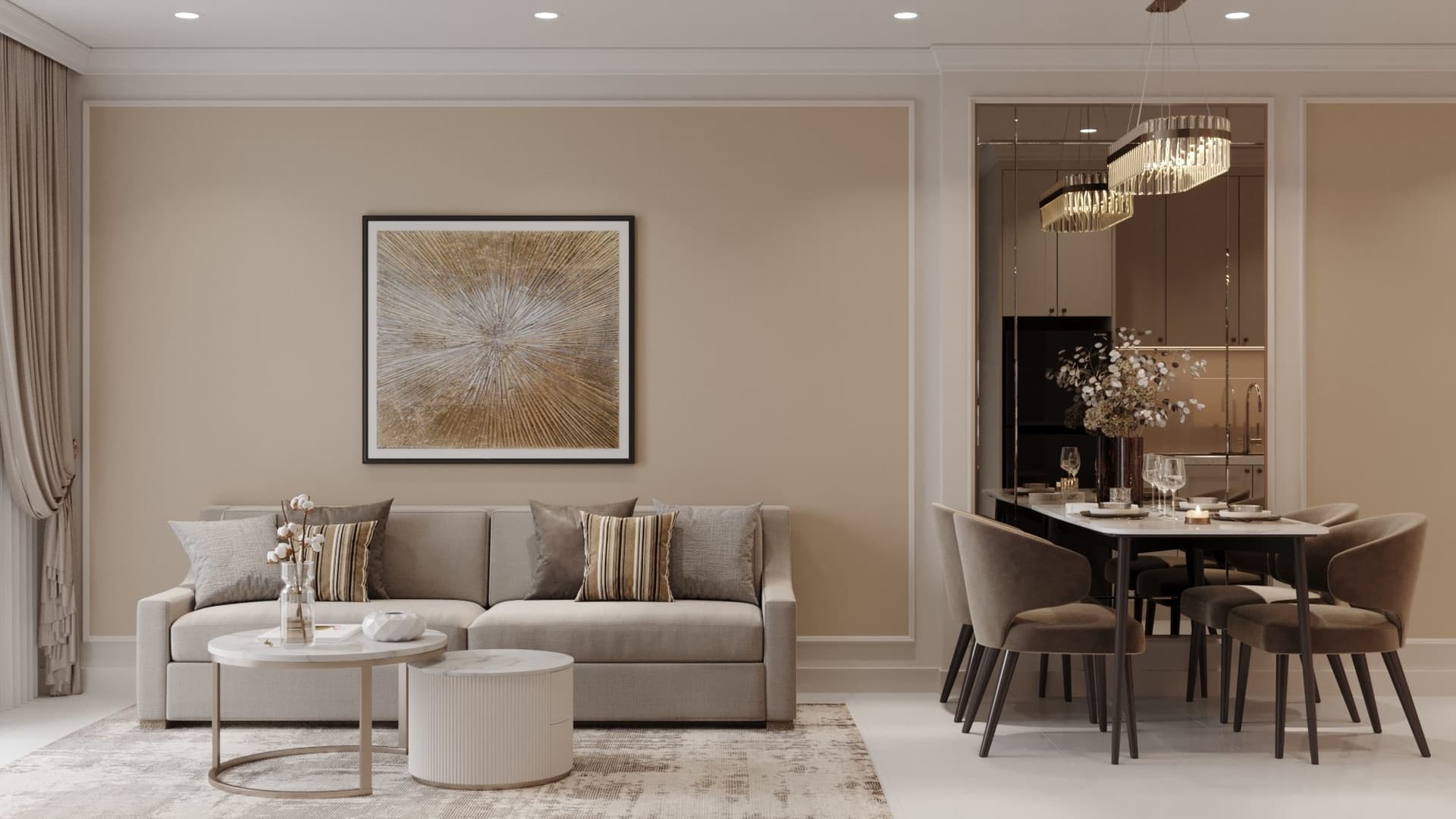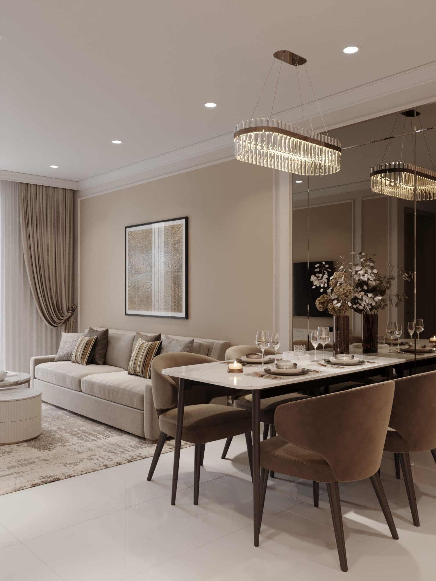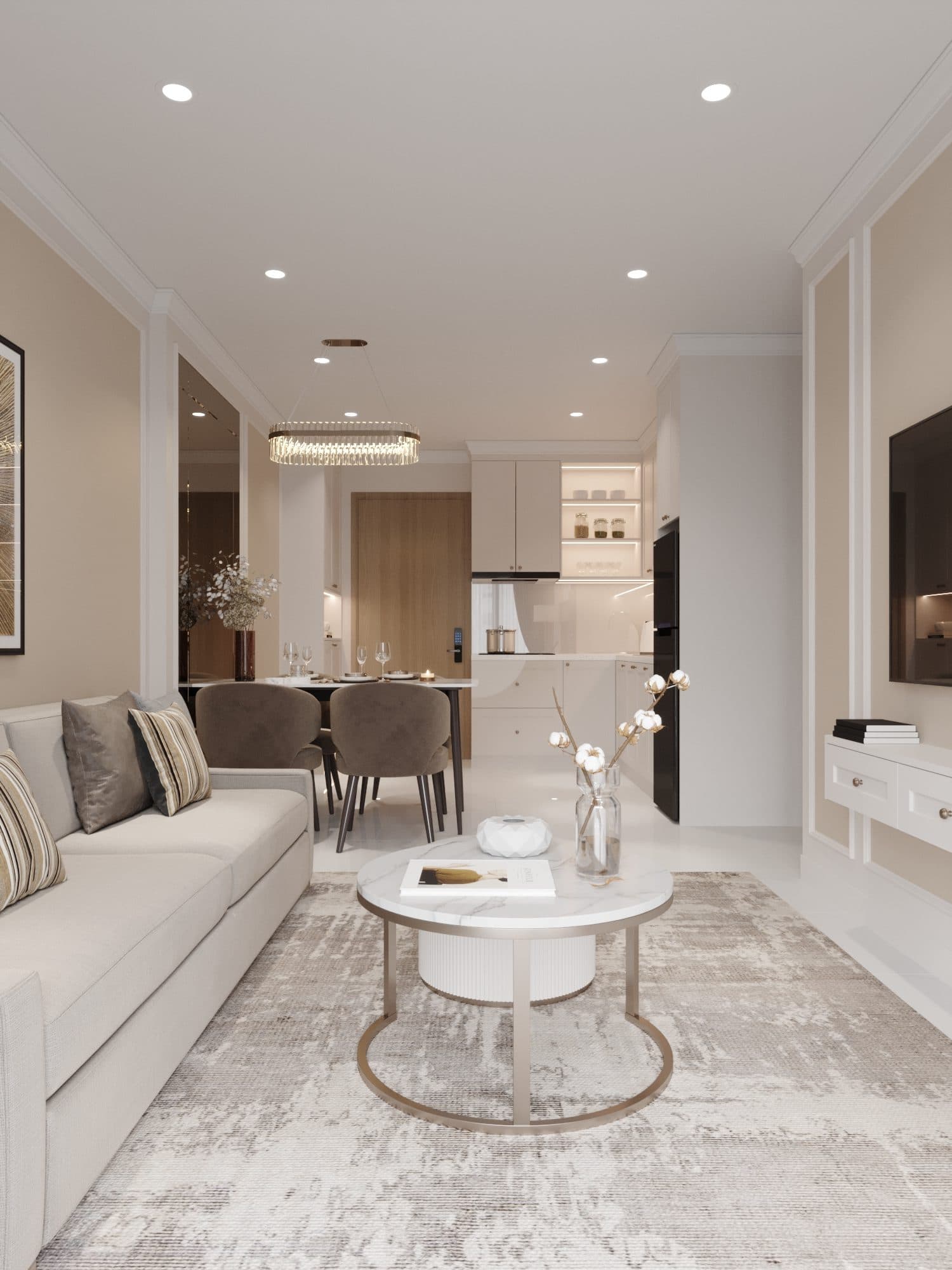 Căn hộ mang phong cách tân cổ điển, nổi bật với gam màu trung tính sang trọng, phào chỉ tinh tế và nội thất hiện đại pha chút cổ điển. Sự kết hợp hài hòa giữa đường nét mềm mại, ánh sáng ấm áp và chất liệu cao cấp tạo nên không gian sống thanh lịch, tinh tế và đầy cuốn hút