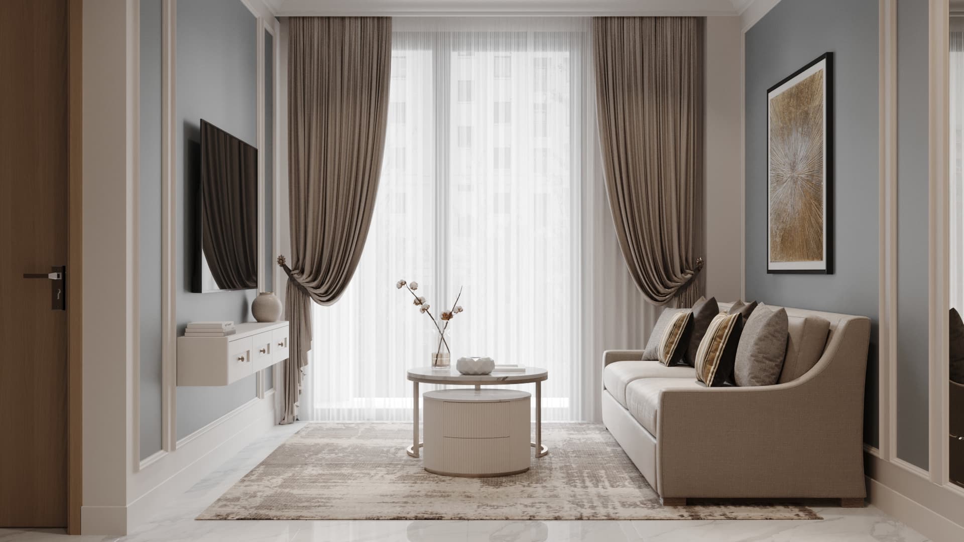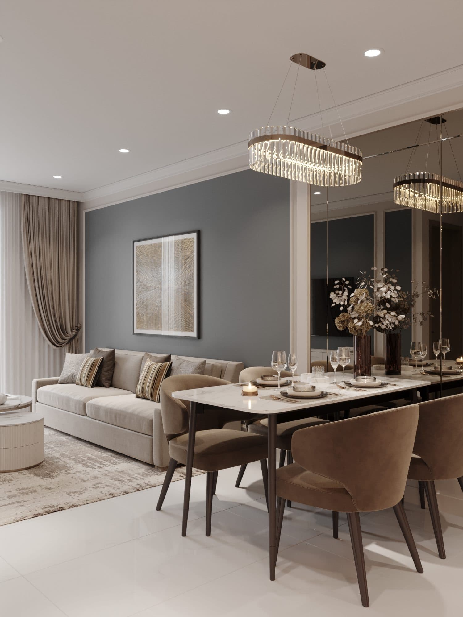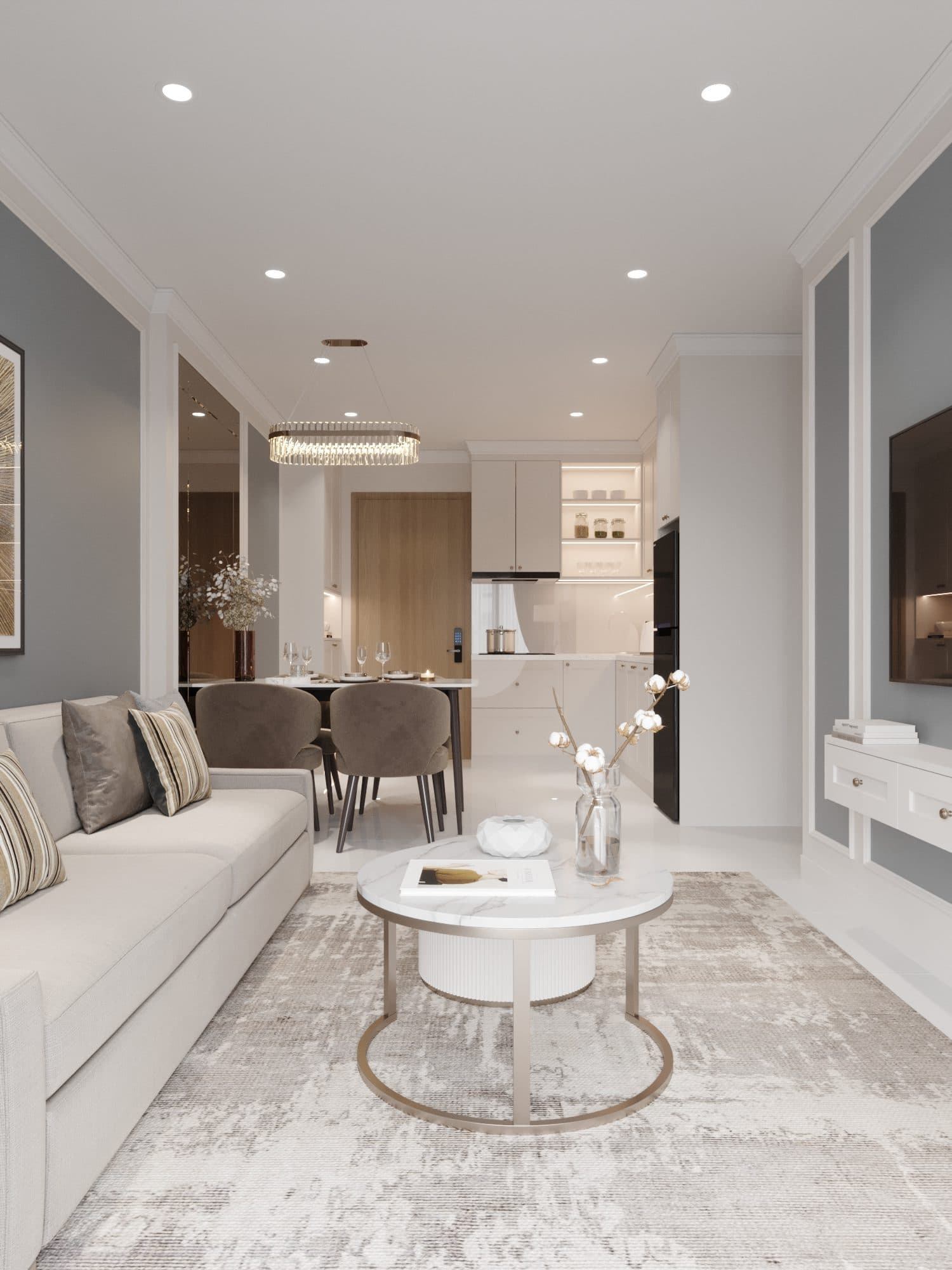 Căn hộ mang phong cách tân cổ điển, nổi bật với gam màu trung tính sang trọng, phào chỉ tinh tế và nội thất hiện đại pha chút cổ điển. Sự kết hợp hài hòa giữa đường nét mềm mại, ánh sáng ấm áp và chất liệu cao cấp tạo nên không gian sống thanh lịch, tinh tế và đầy cuốn hút