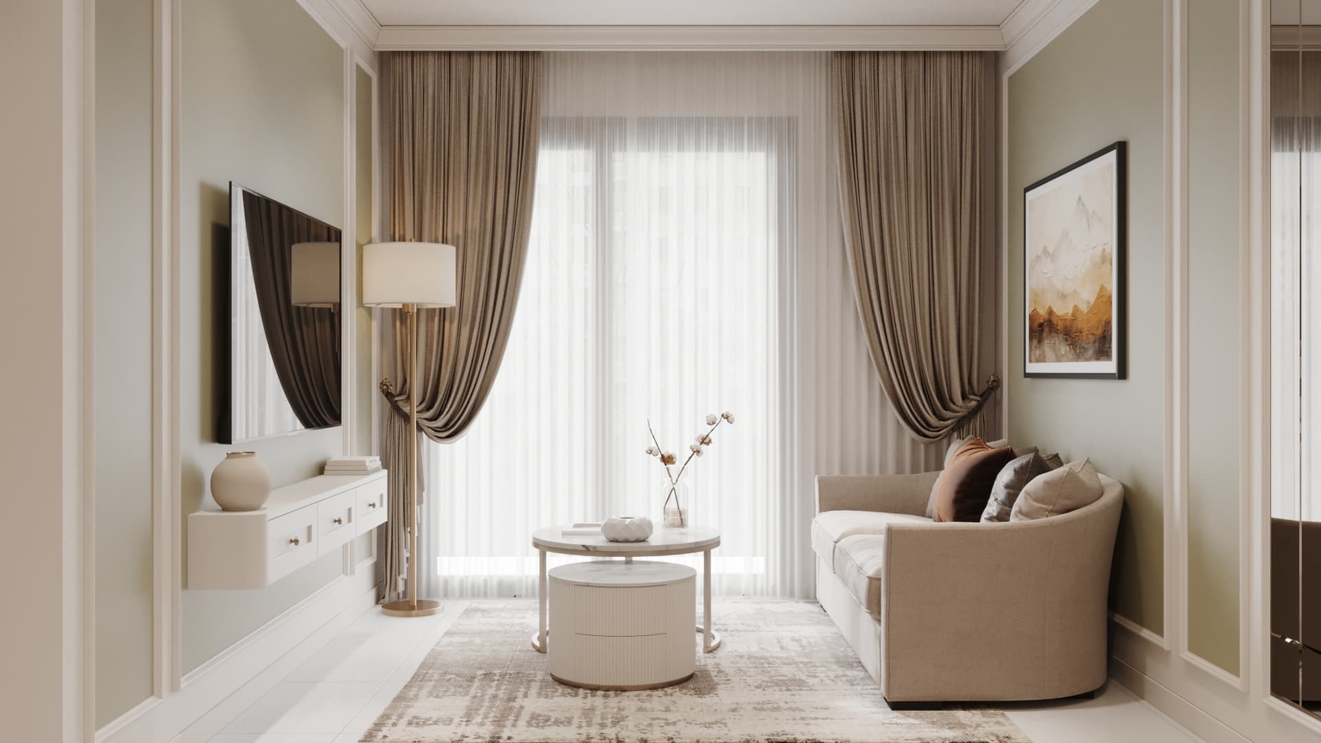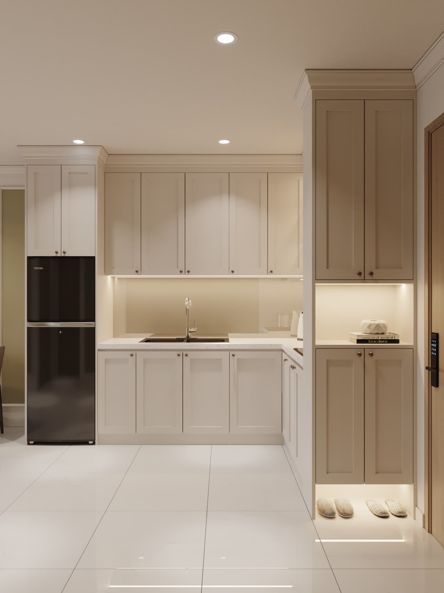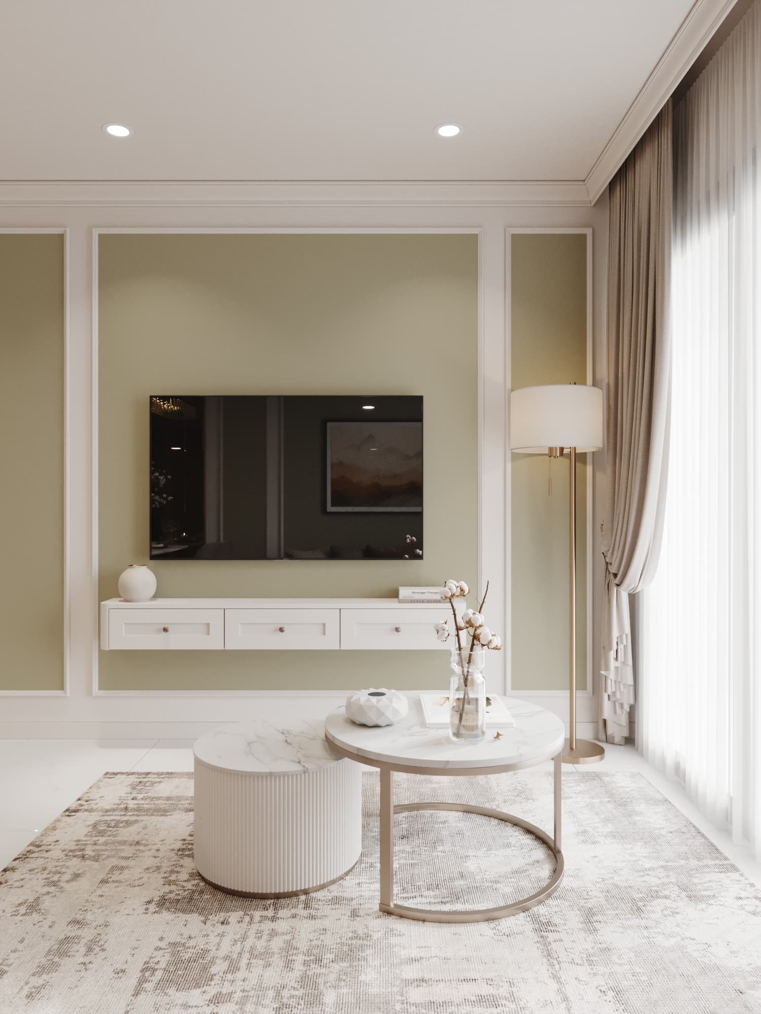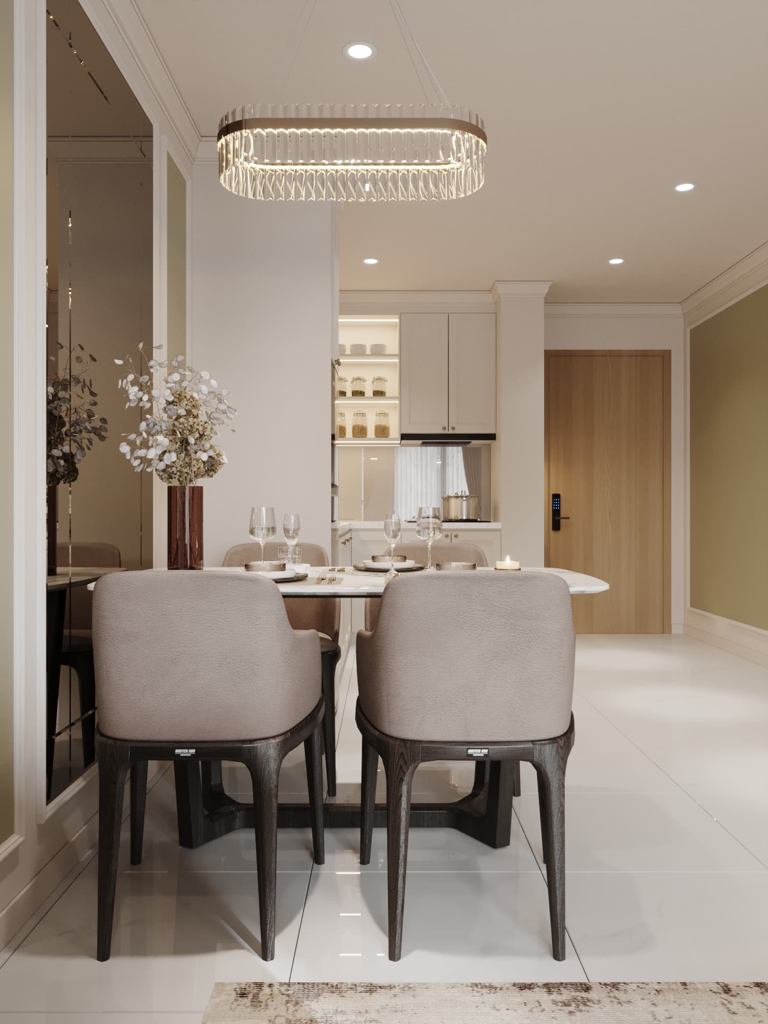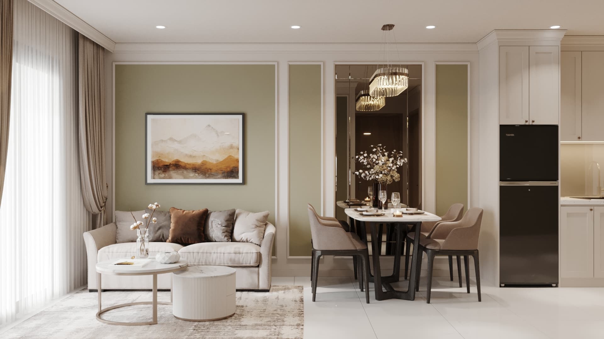 Căn hộ mang phong cách tân cổ điển, nổi bật với gam màu trung tính sang trọng, phào chỉ tinh tế và nội thất hiện đại pha chút cổ điển. Sự kết hợp hài hòa giữa đường nét mềm mại, ánh sáng ấm áp và chất liệu cao cấp tạo nên không gian sống thanh lịch, tinh tế và đầy cuốn hút
