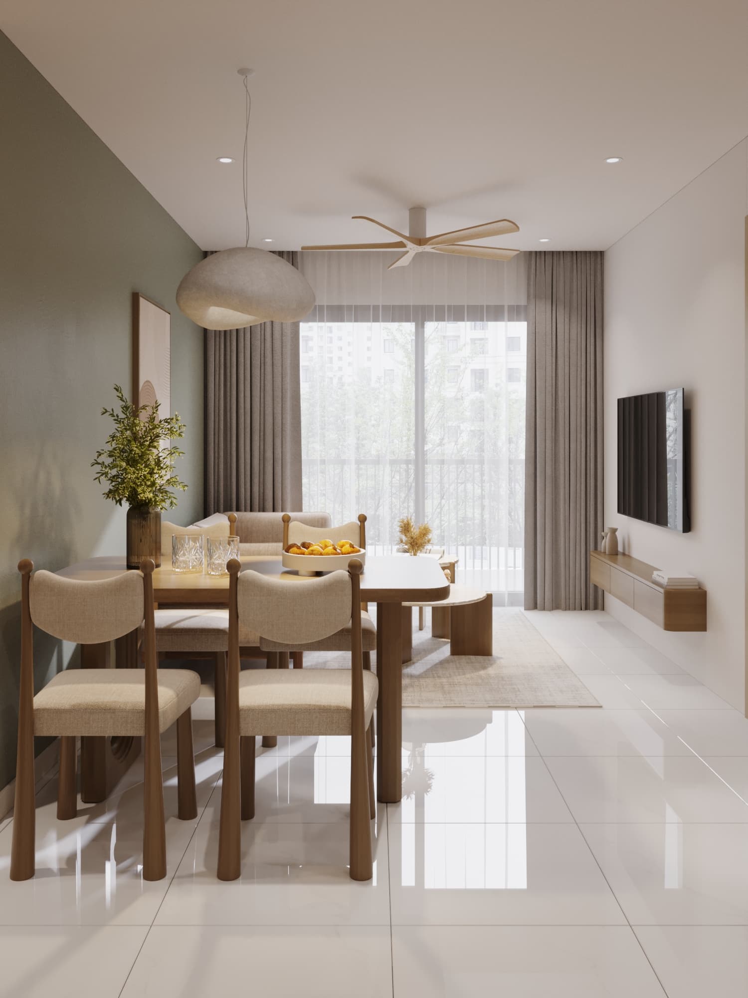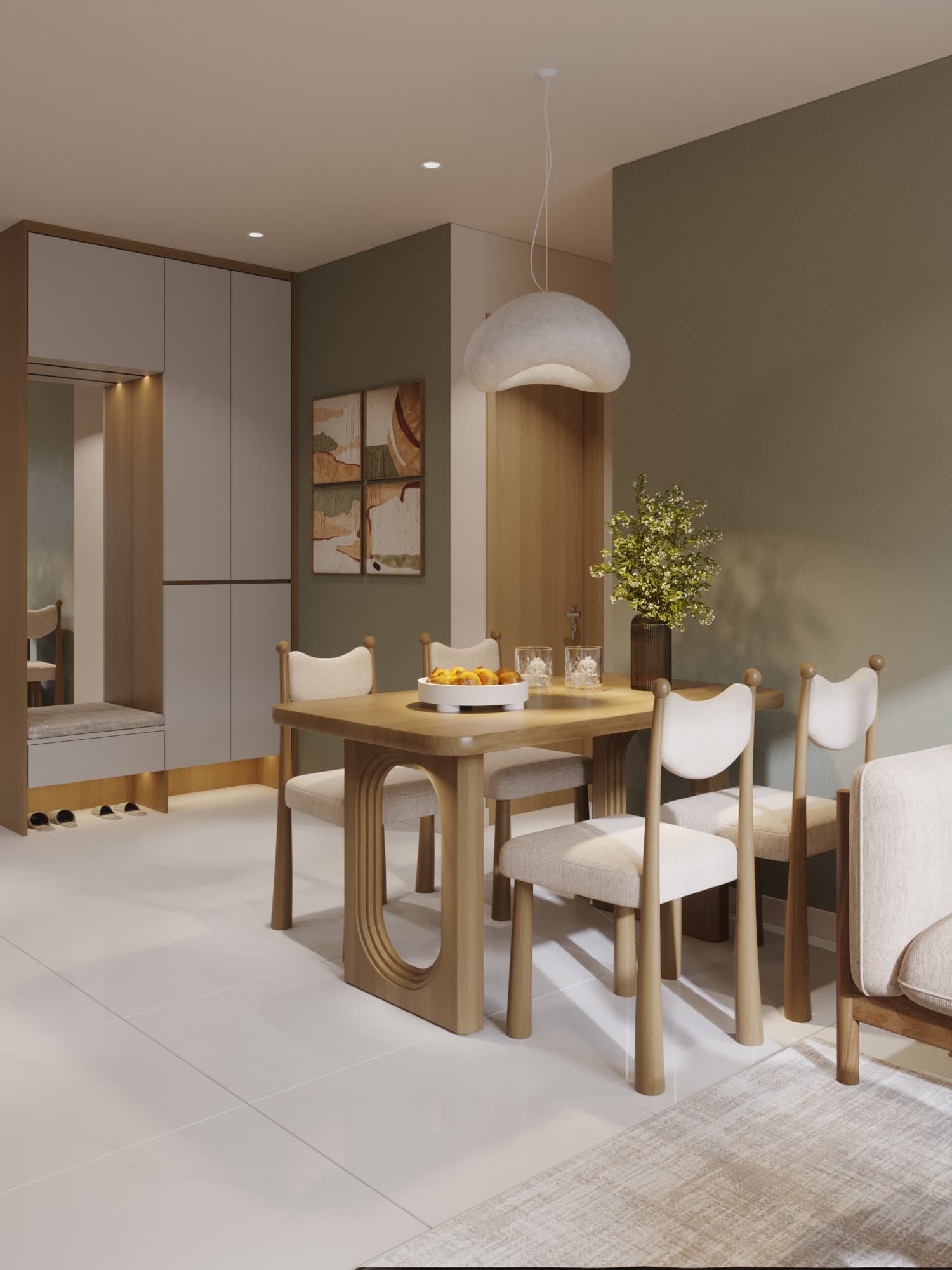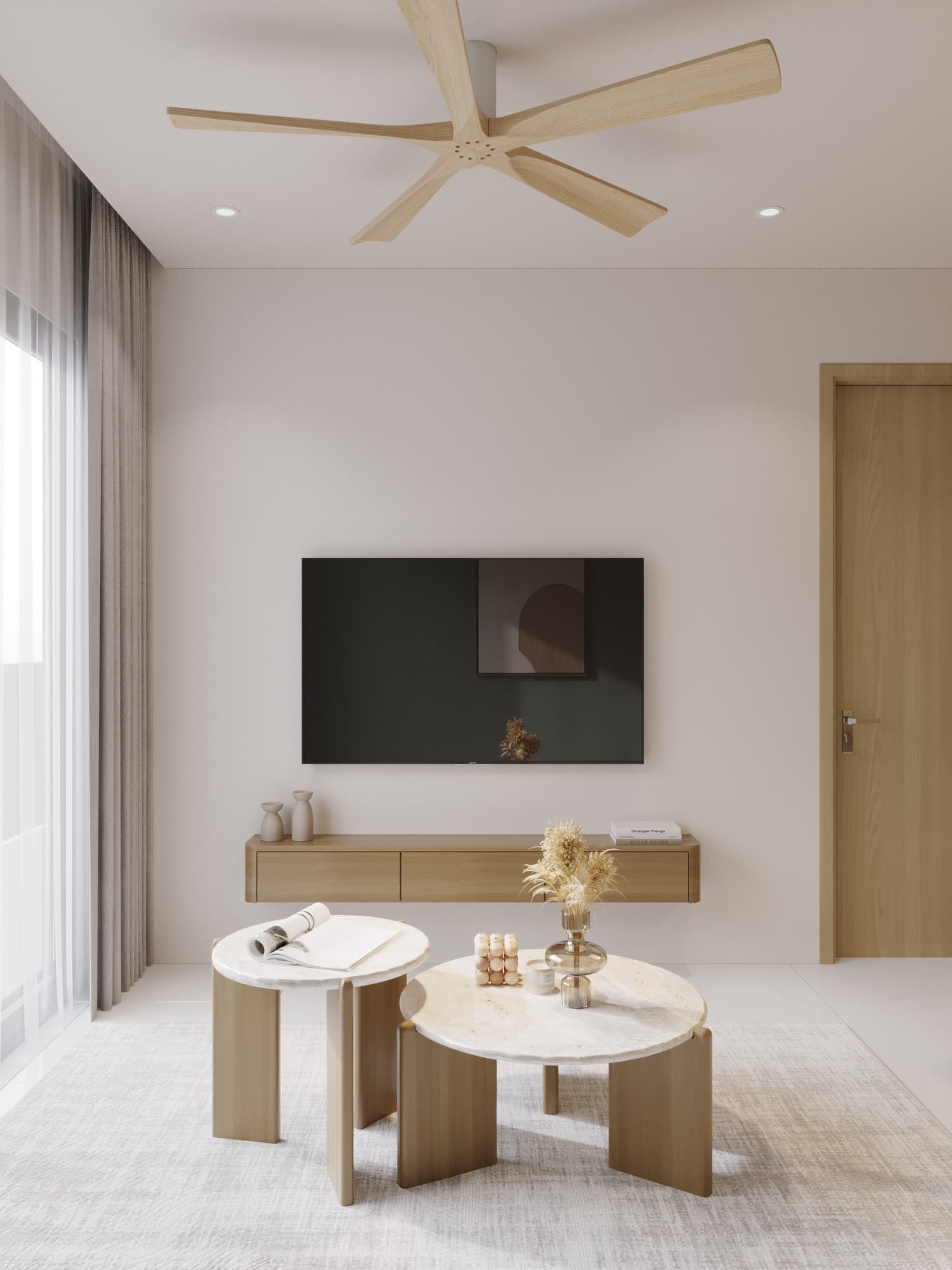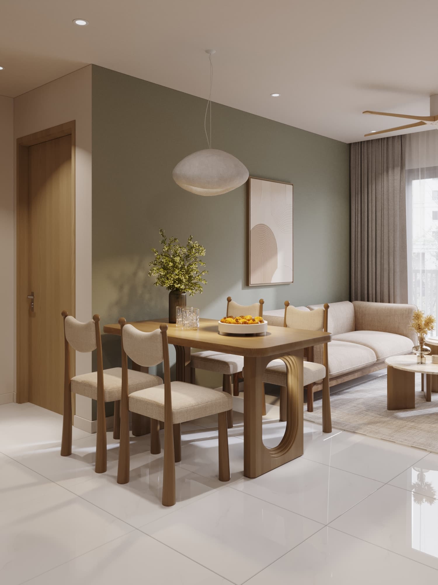 Căn hộ được thiết kế theo phong cách tối giản, nổi bật với gam màu trung tính nhẹ nhàng, đường nét gọn gàng và bố cục hài hòa. Nội thất tinh giản nhưng tiện nghi, kết hợp ánh sáng tự nhiên và vài điểm nhấn trang trí tinh tế, mang lại không gian sống thanh lịch, ấm cúng và thoáng đãng