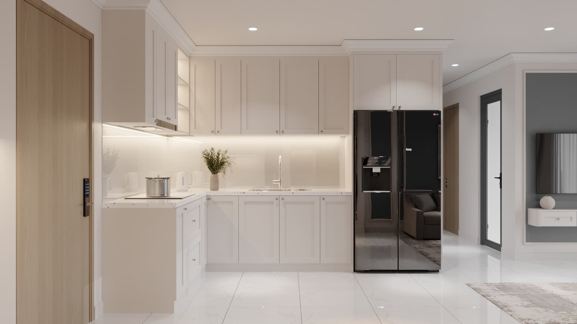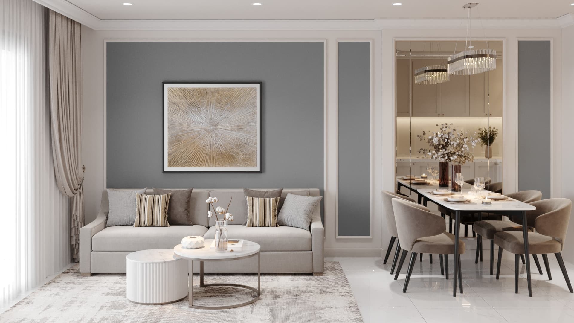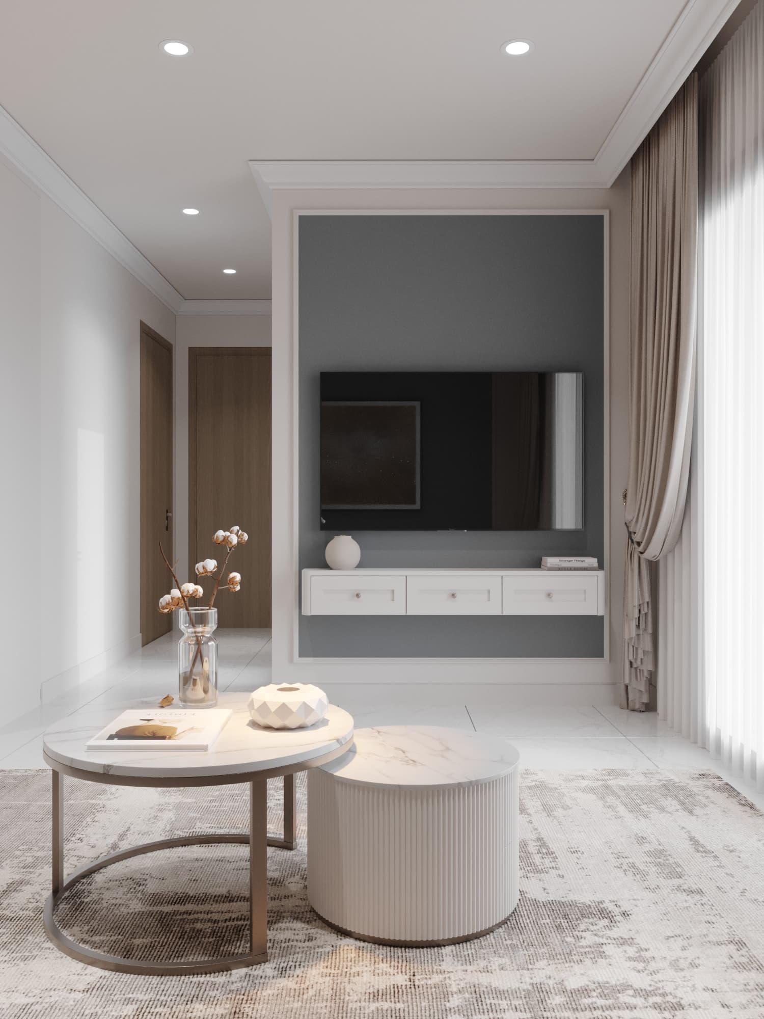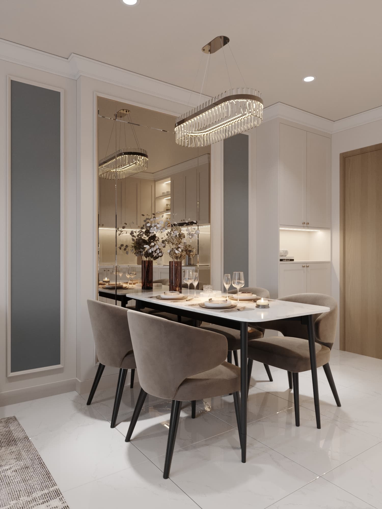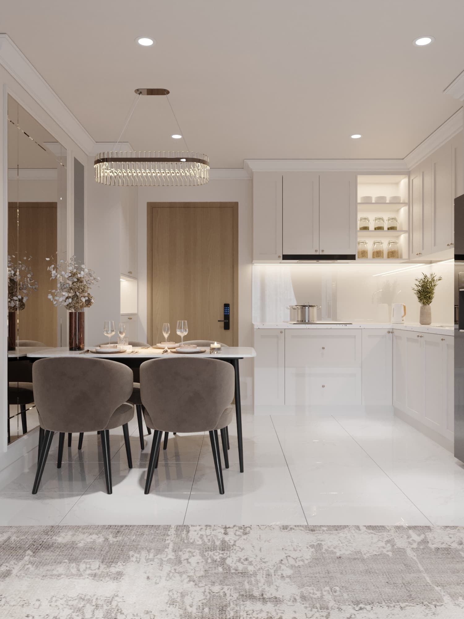 Căn hộ mang phong cách tân cổ điển, nổi bật với gam màu trung tính sang trọng, phào chỉ tinh tế và nội thất hiện đại pha chút cổ điển. Sự kết hợp hài hòa giữa đường nét mềm mại, ánh sáng ấm áp và chất liệu cao cấp tạo nên không gian sống thanh lịch, tinh tế và đầy cuốn hút