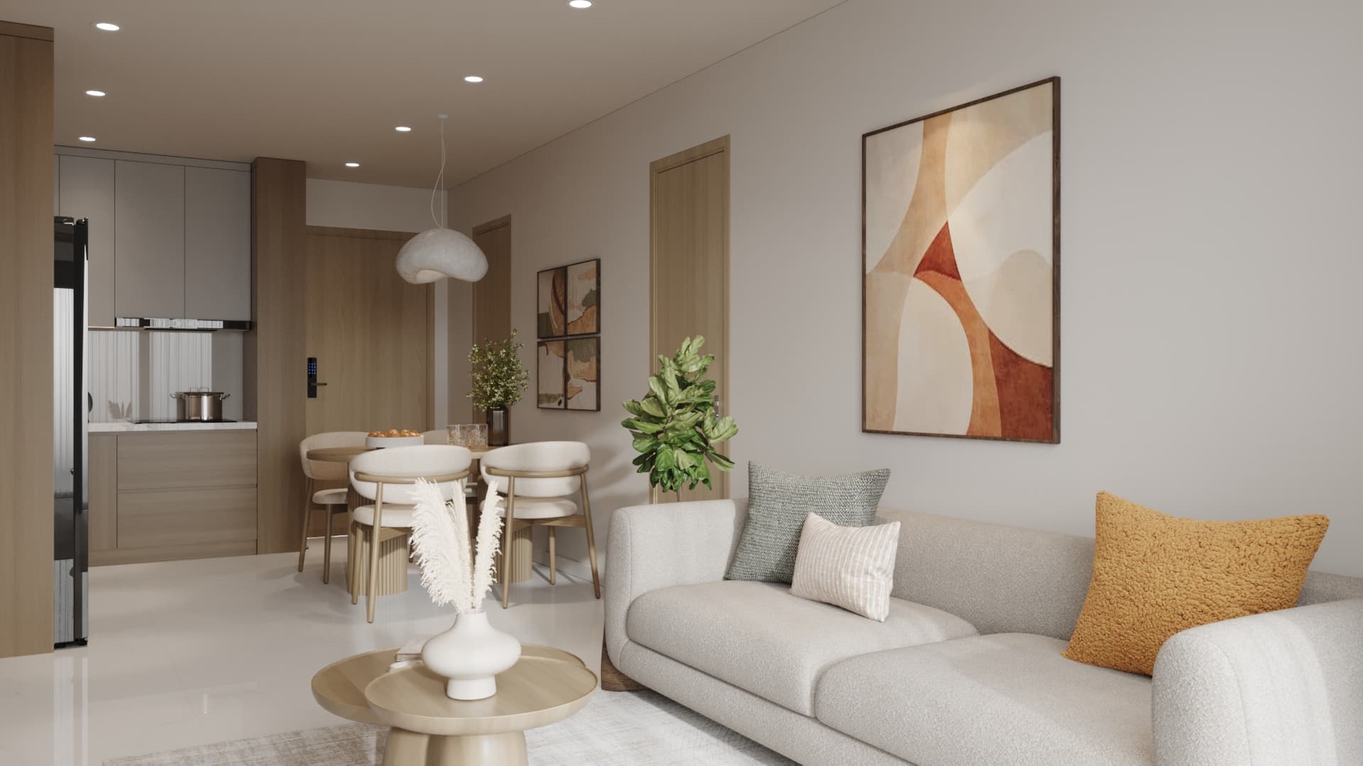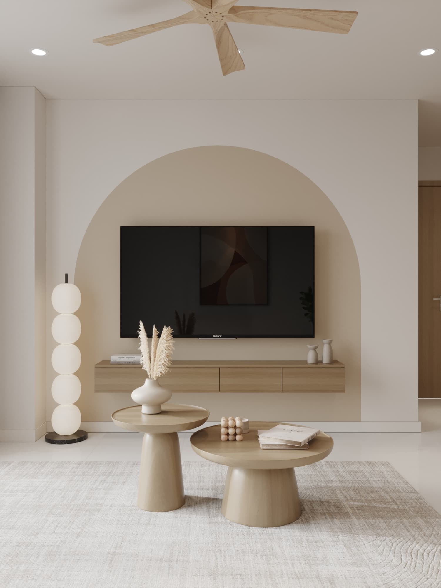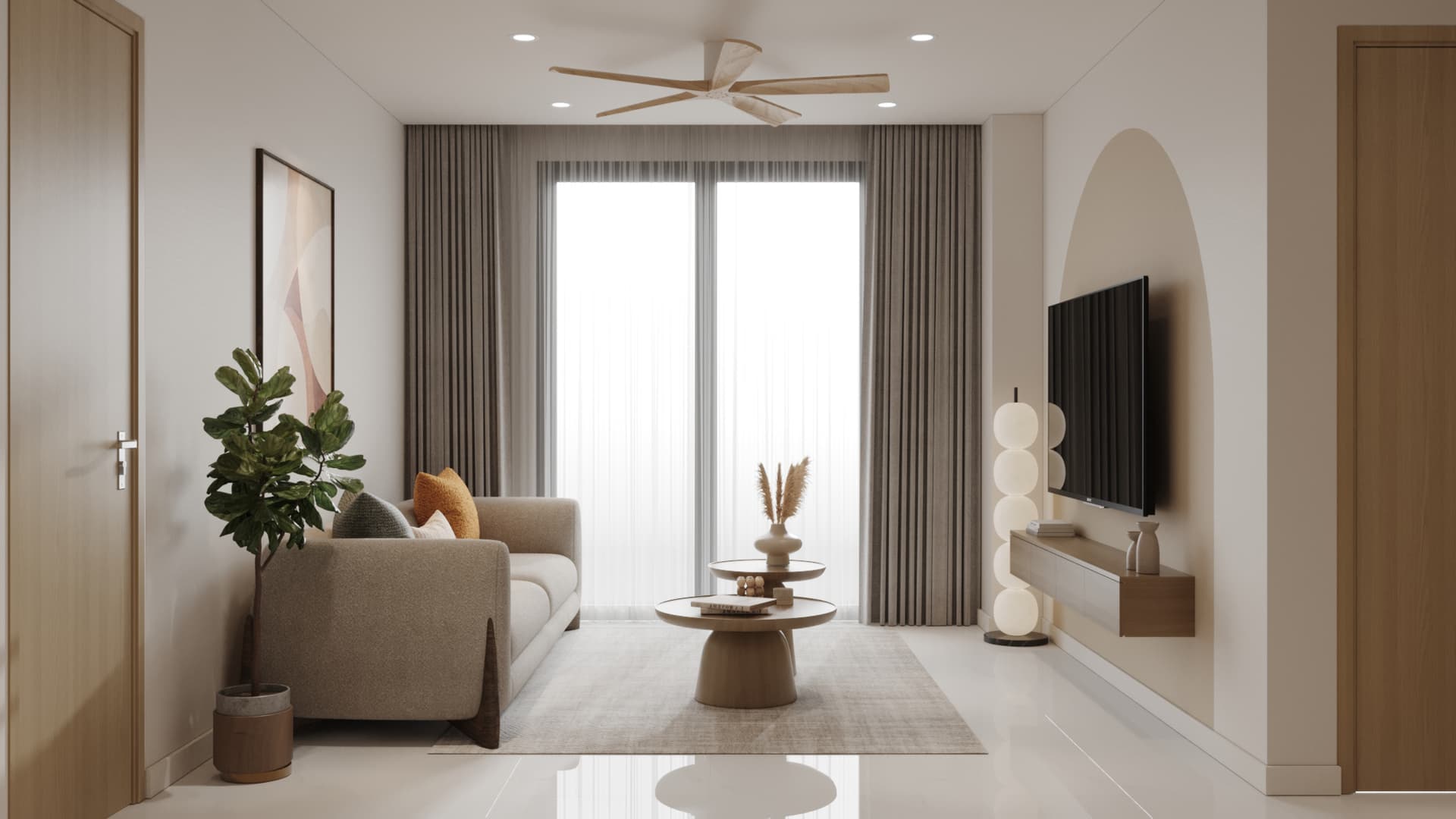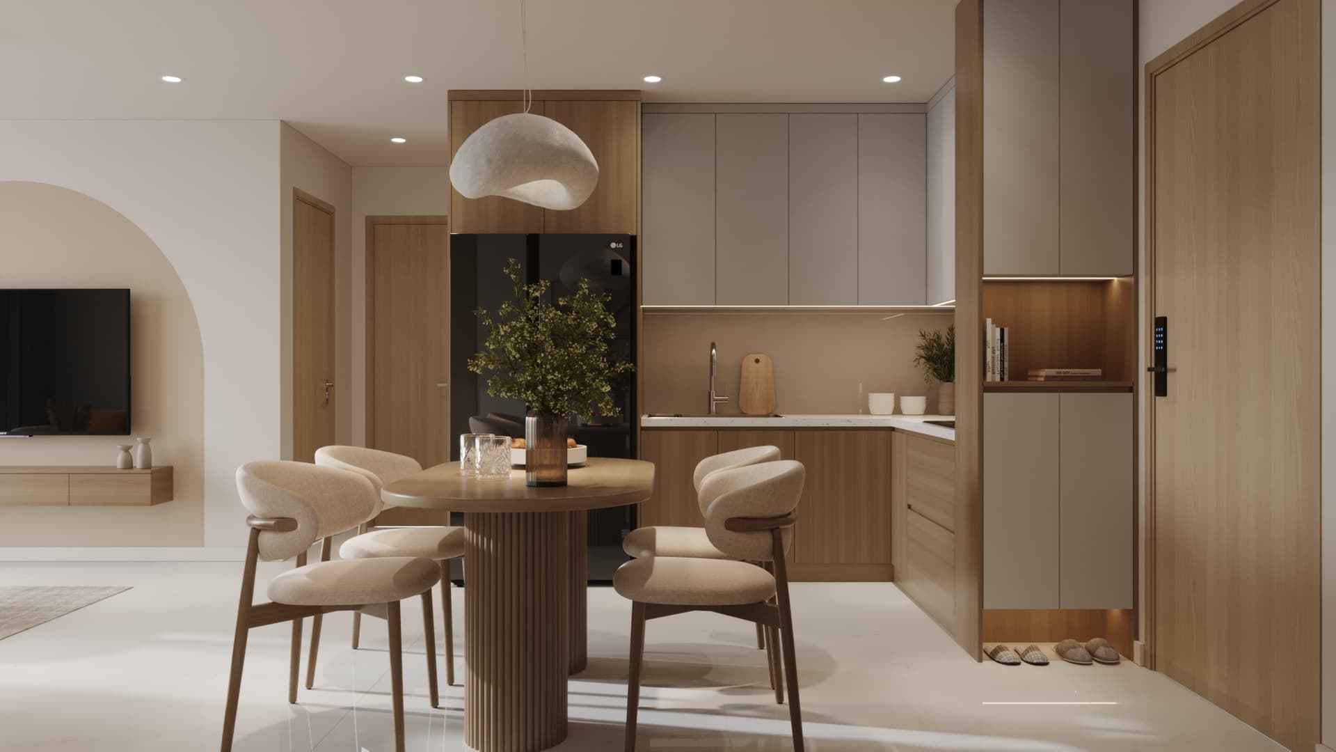 Căn hộ được thiết kế theo phong cách tối giản, nổi bật với gam màu trung tính nhẹ nhàng, đường nét gọn gàng và bố cục hài hòa. Nội thất tinh giản nhưng tiện nghi, kết hợp ánh sáng tự nhiên và vài điểm nhấn trang trí tinh tế, mang lại không gian sống thanh lịch, ấm cúng và thoáng đãng