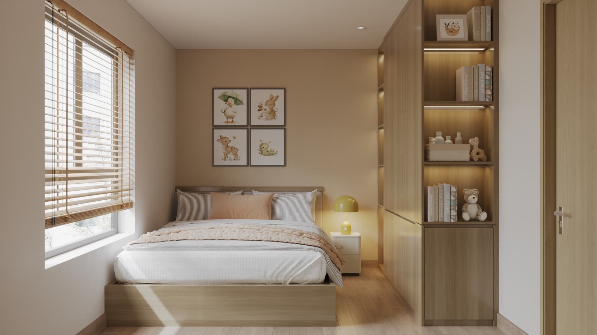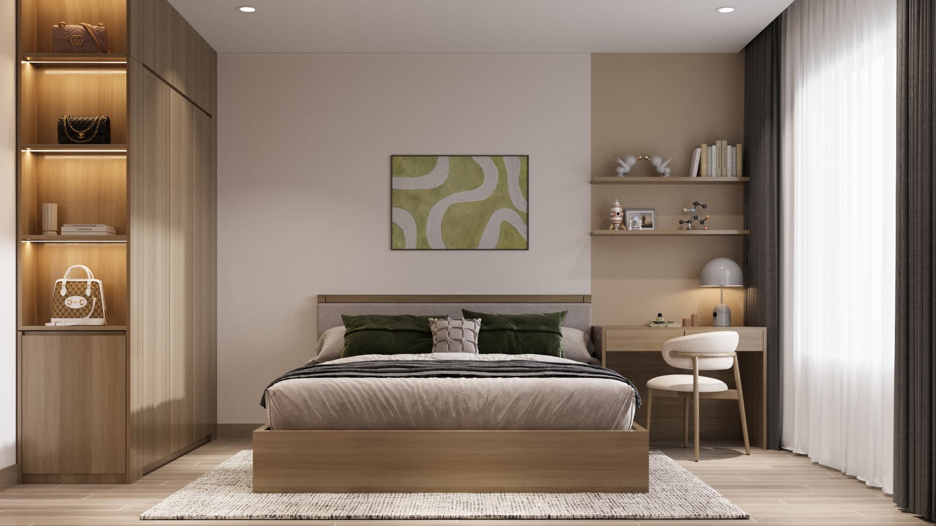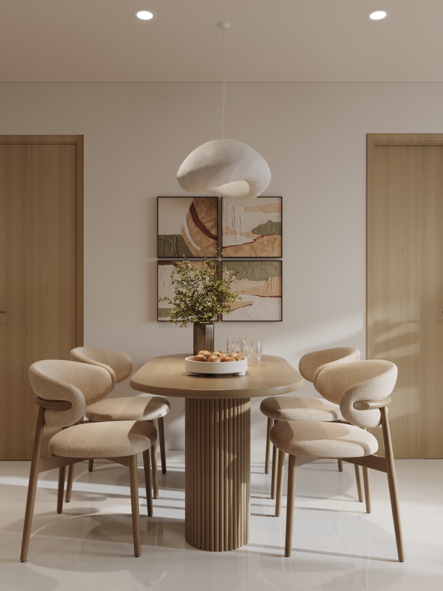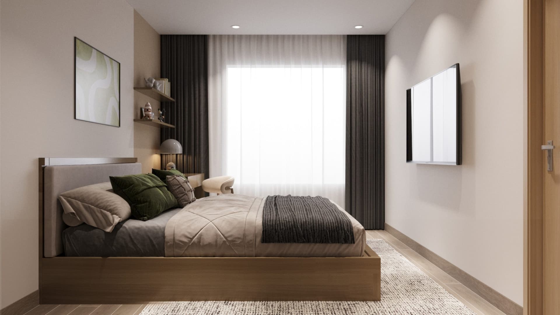 Căn hộ được thiết kế theo phong cách tối giản, nổi bật với gam màu trung tính nhẹ nhàng, đường nét gọn gàng và bố cục hài hòa. Nội thất tinh giản nhưng tiện nghi, kết hợp ánh sáng tự nhiên và vài điểm nhấn trang trí tinh tế, mang lại không gian sống thanh lịch, ấm cúng và thoáng đãng