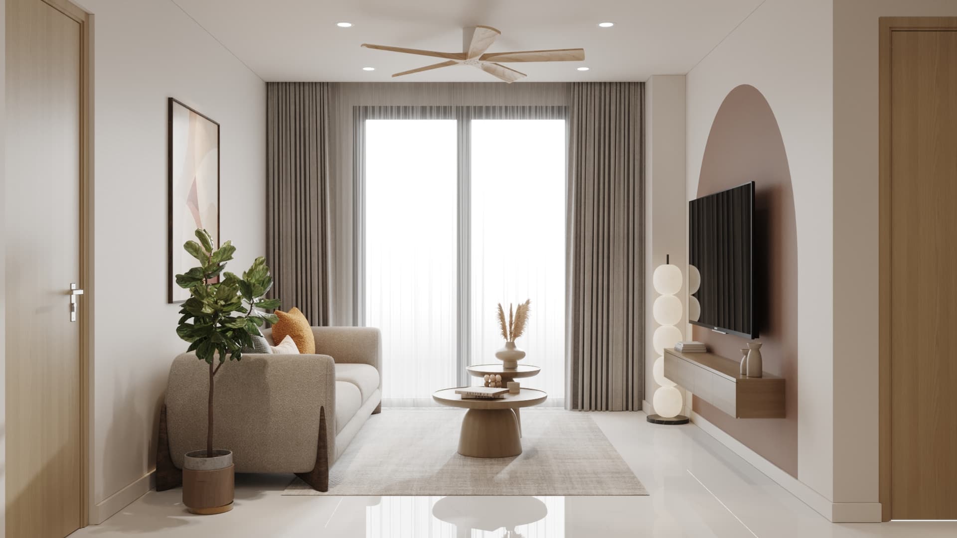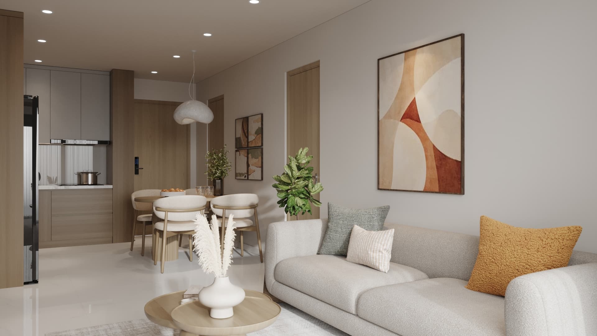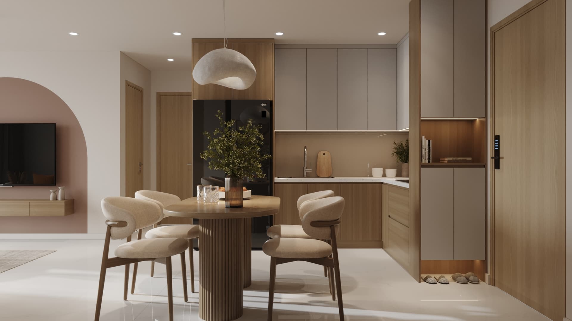 Căn hộ được thiết kế theo phong cách tối giản, nổi bật với gam màu trung tính nhẹ nhàng, đường nét gọn gàng và bố cục hài hòa. Nội thất tinh giản nhưng tiện nghi, kết hợp ánh sáng tự nhiên và vài điểm nhấn trang trí tinh tế, mang lại không gian sống thanh lịch, ấm cúng và thoáng đãng
