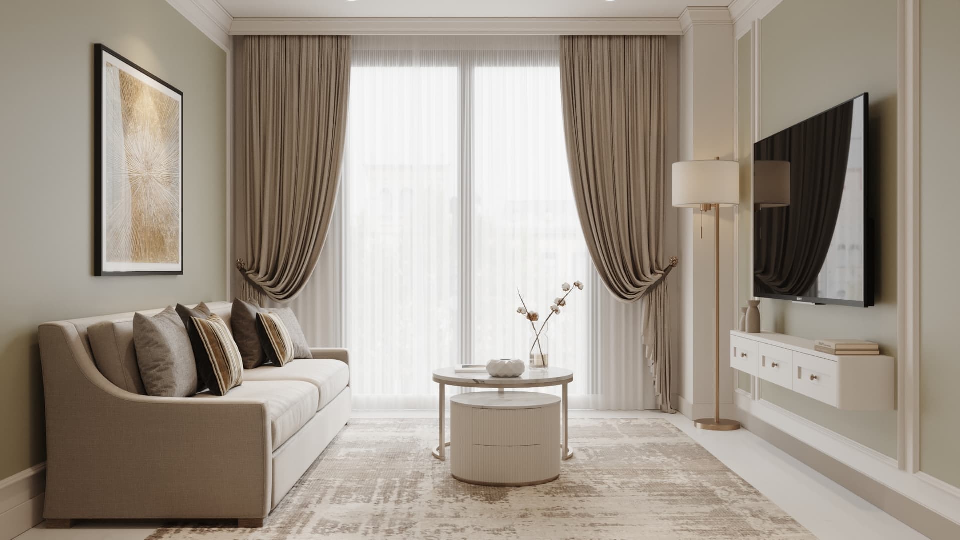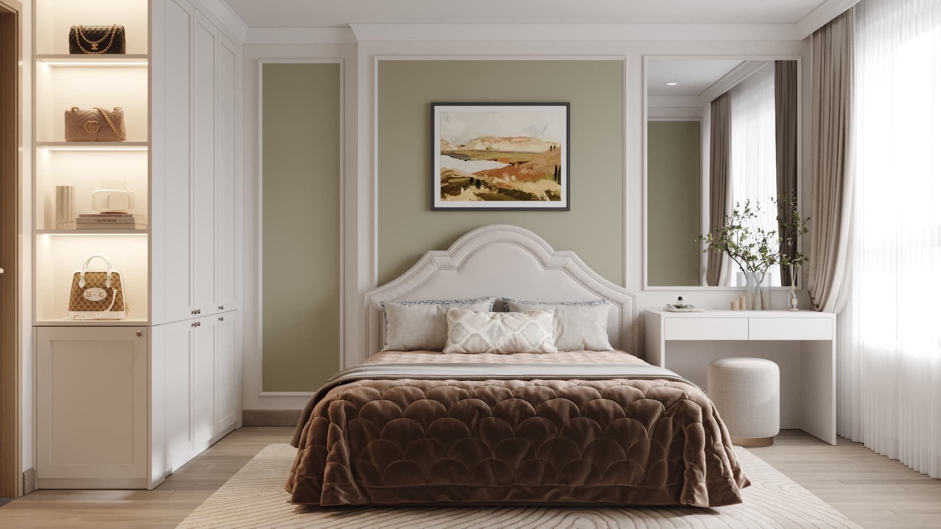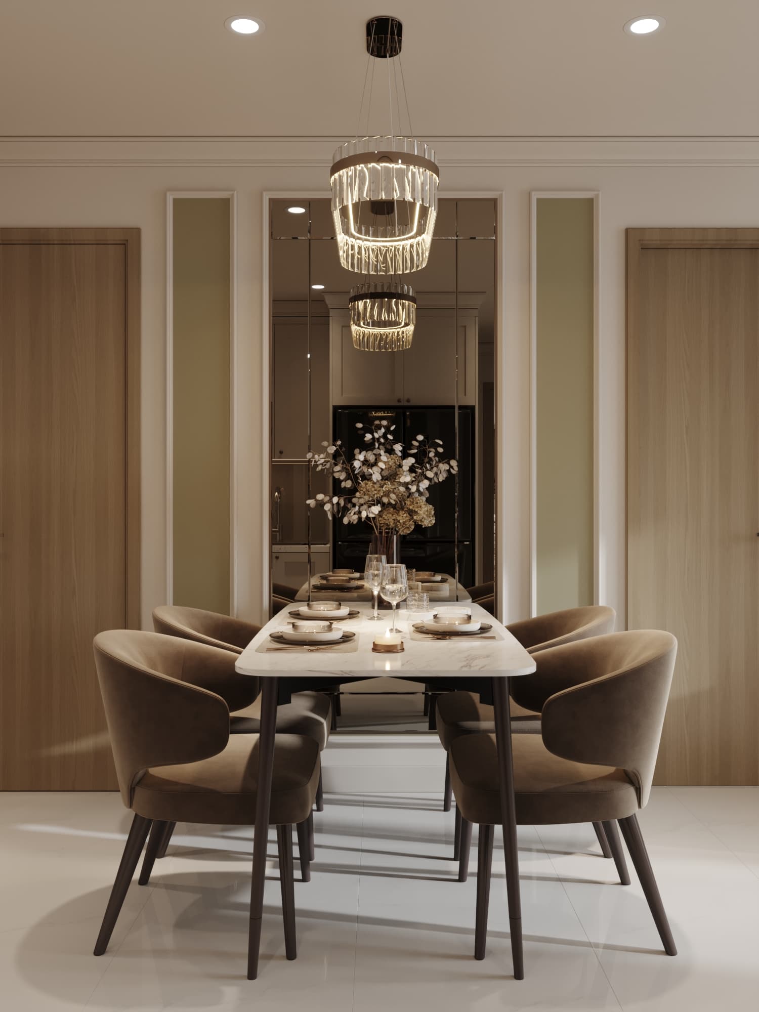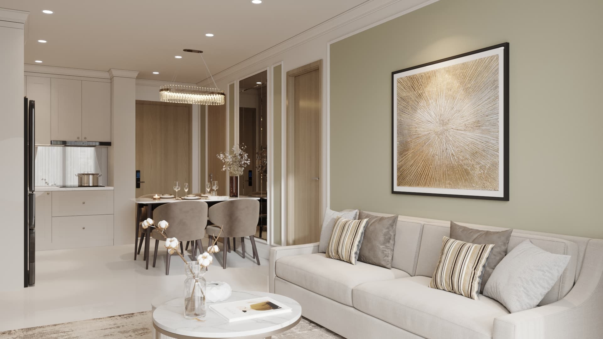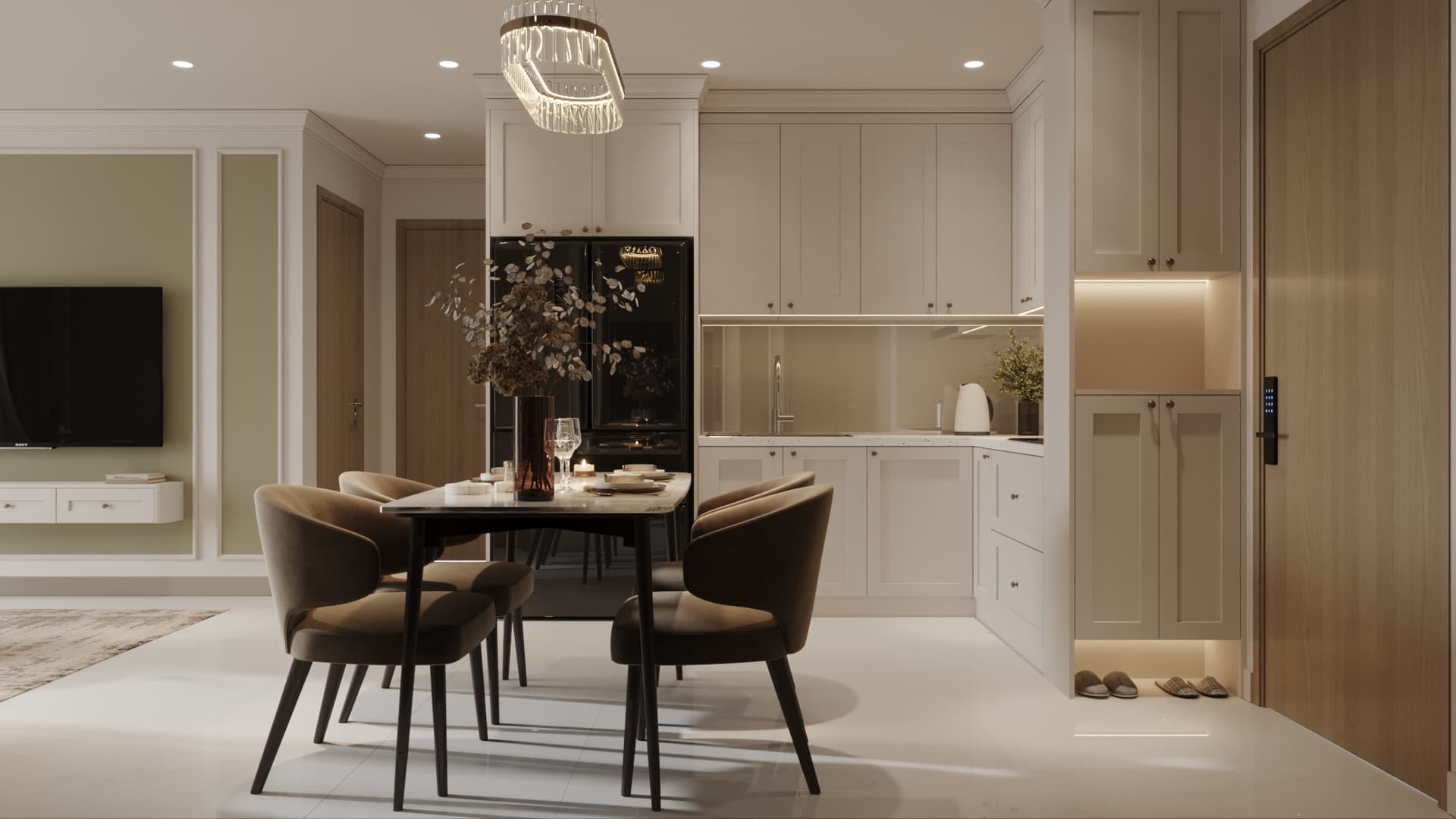 Căn hộ mang phong cách tân cổ điển, nổi bật với gam màu trung tính sang trọng, phào chỉ tinh tế và nội thất hiện đại pha chút cổ điển. Sự kết hợp hài hòa giữa đường nét mềm mại, ánh sáng ấm áp và chất liệu cao cấp tạo nên không gian sống thanh lịch, tinh tế và đầy cuốn hút