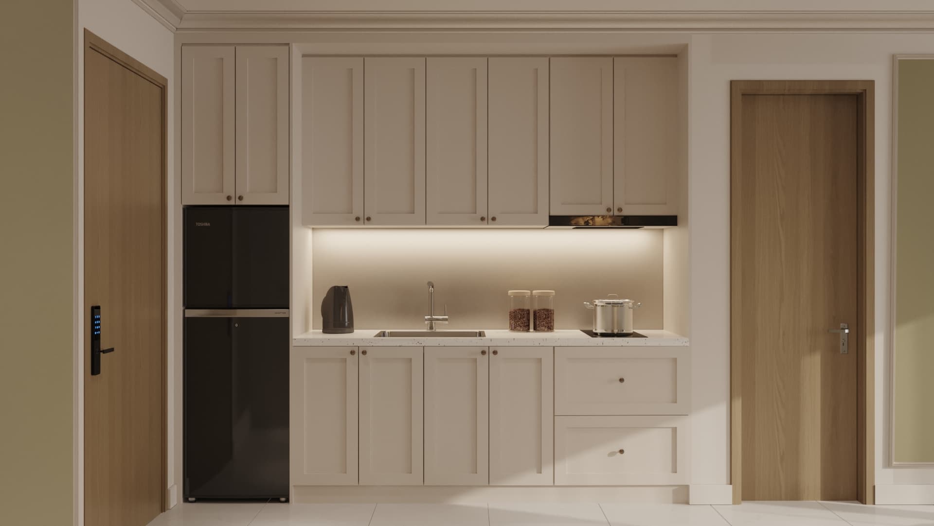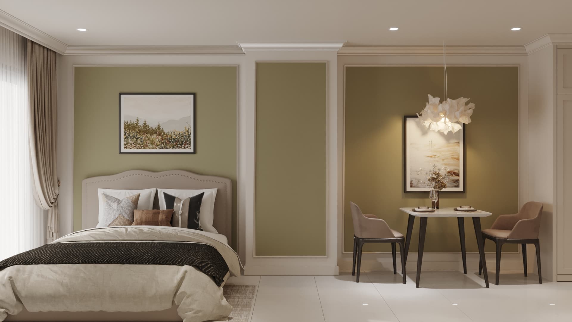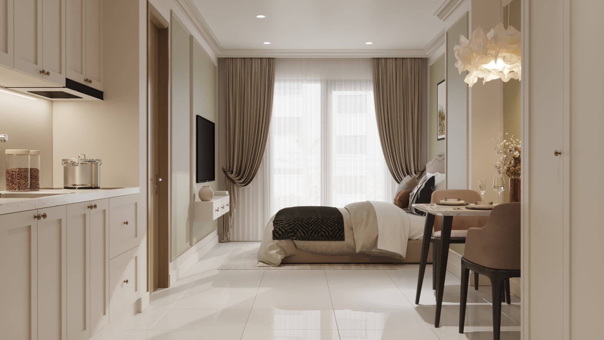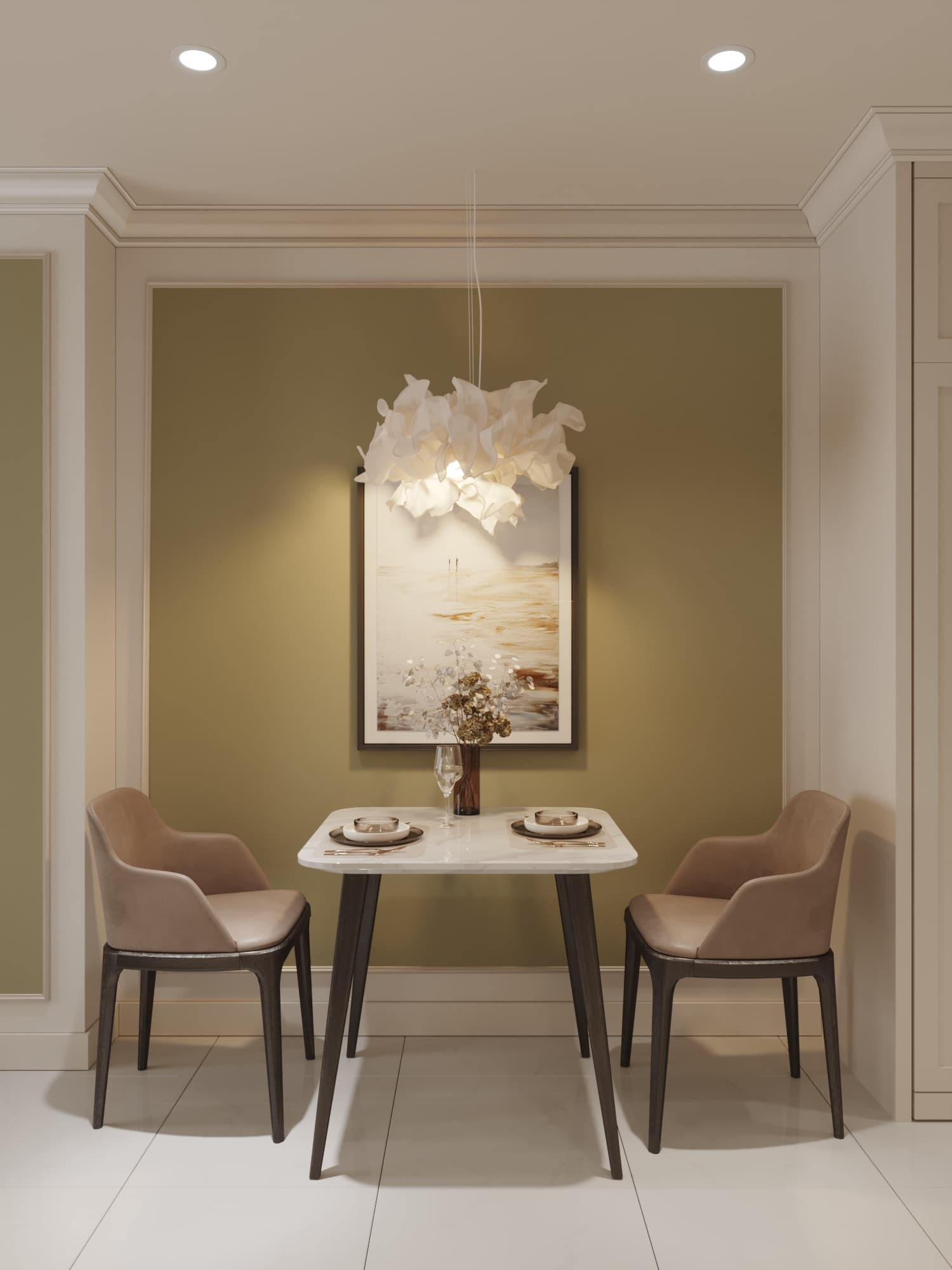Căn hộ mang phong cách tân cổ điển, nổi bật với gam màu trung tính sang trọng, phào chỉ tinh tế và nội thất hiện đại pha chút cổ điển. Sự kết hợp hài hòa giữa đường nét mềm mại, ánh sáng ấm áp và chất liệu cao cấp tạo nên không gian sống thanh lịch, tinh tế và đầy cuốn hút