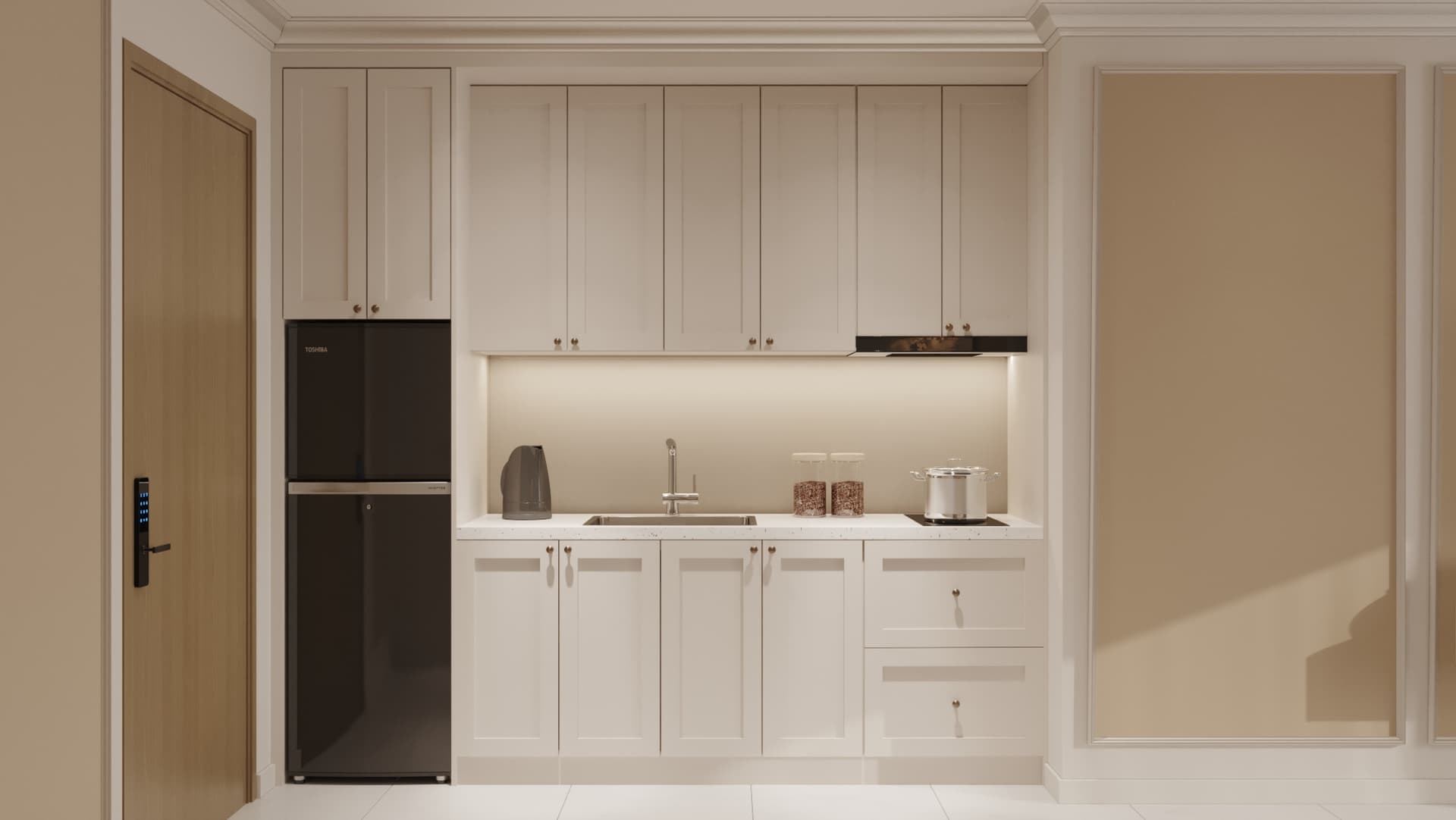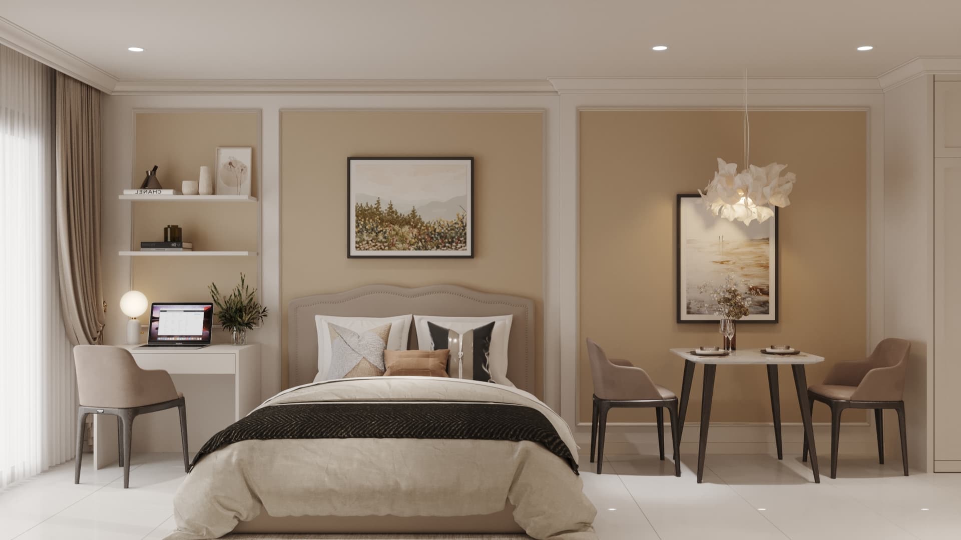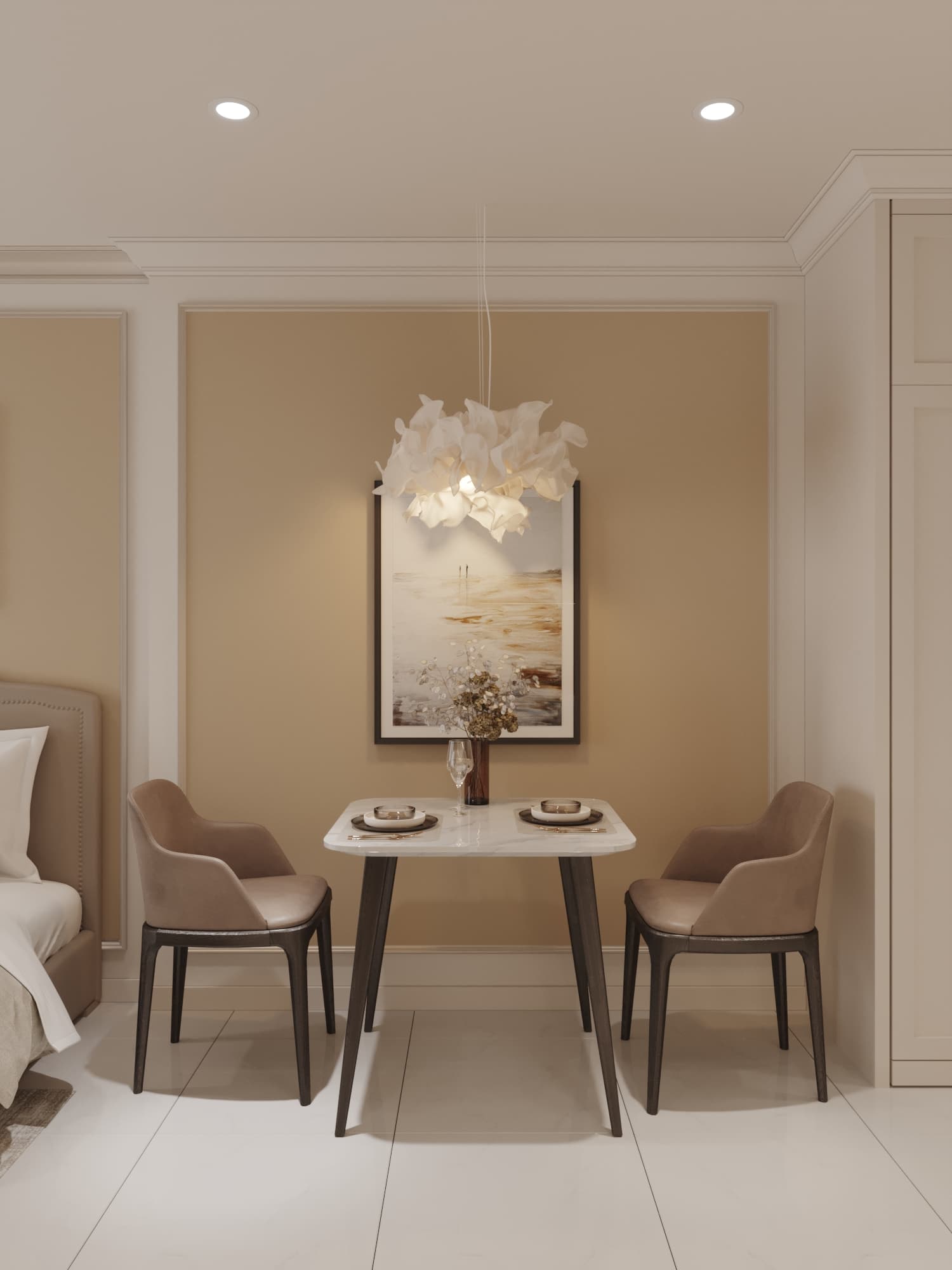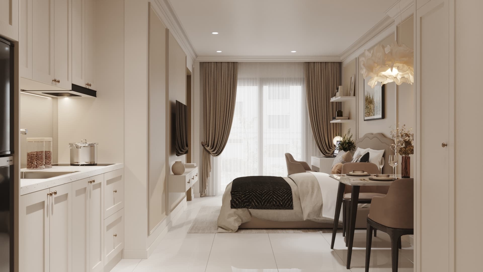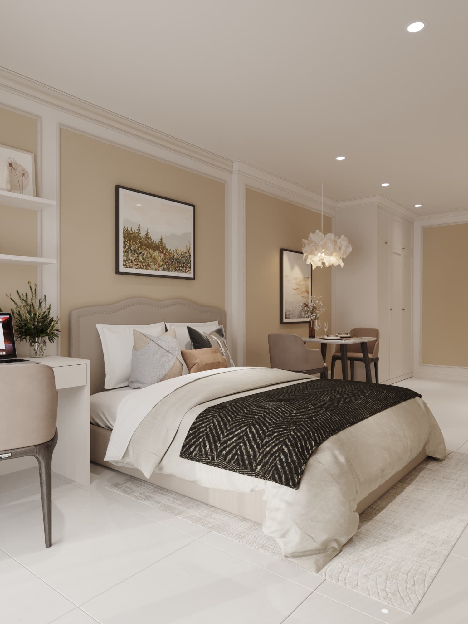 Căn hộ mang phong cách tân cổ điển, nổi bật với gam màu trung tính sang trọng, phào chỉ tinh tế và nội thất hiện đại pha chút cổ điển. Sự kết hợp hài hòa giữa đường nét mềm mại, ánh sáng ấm áp và chất liệu cao cấp tạo nên không gian sống thanh lịch, tinh tế và đầy cuốn hút