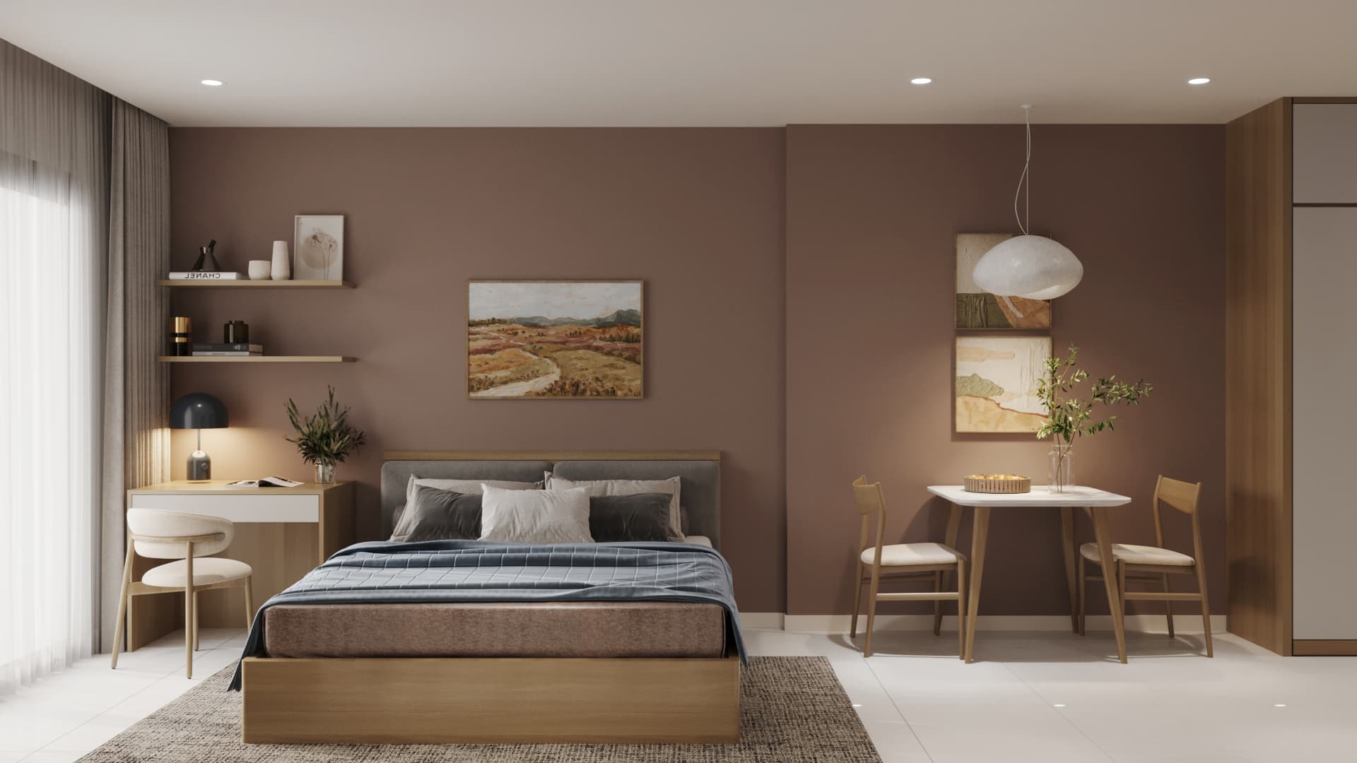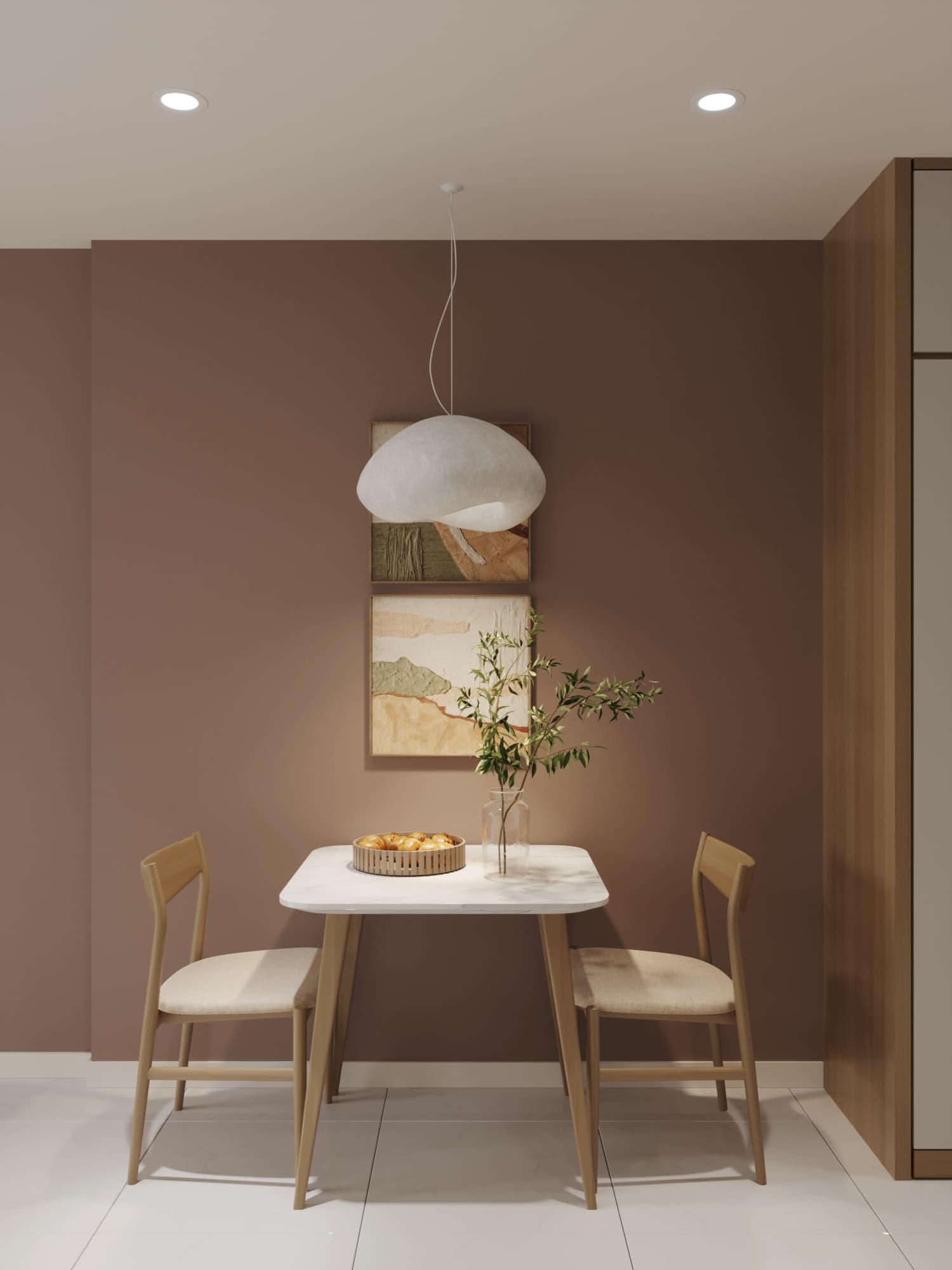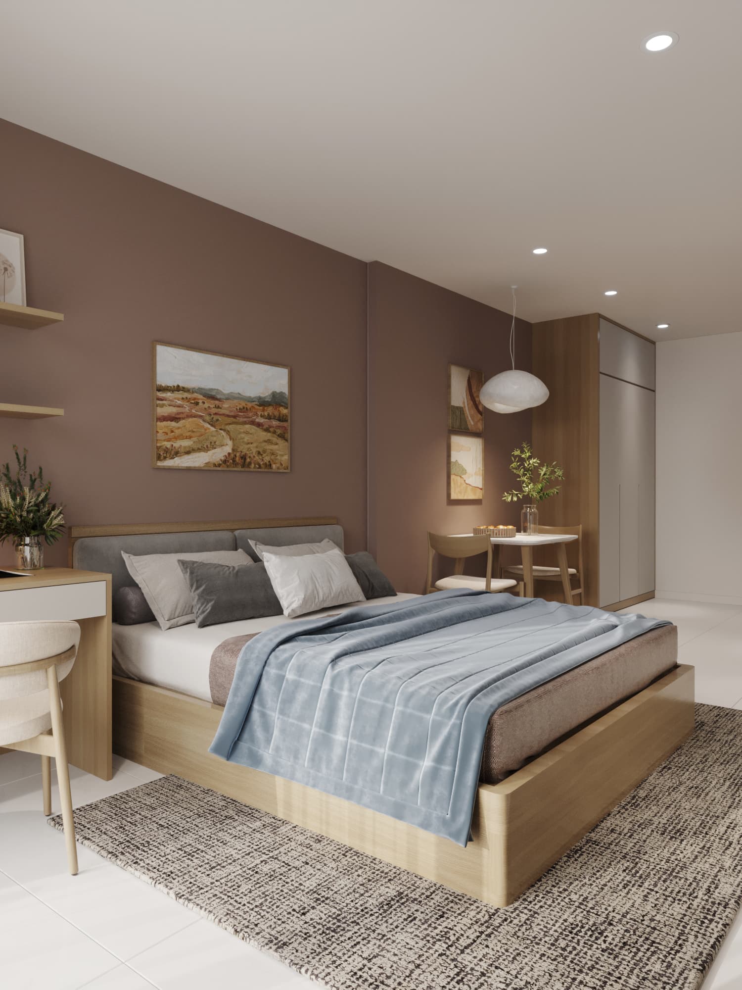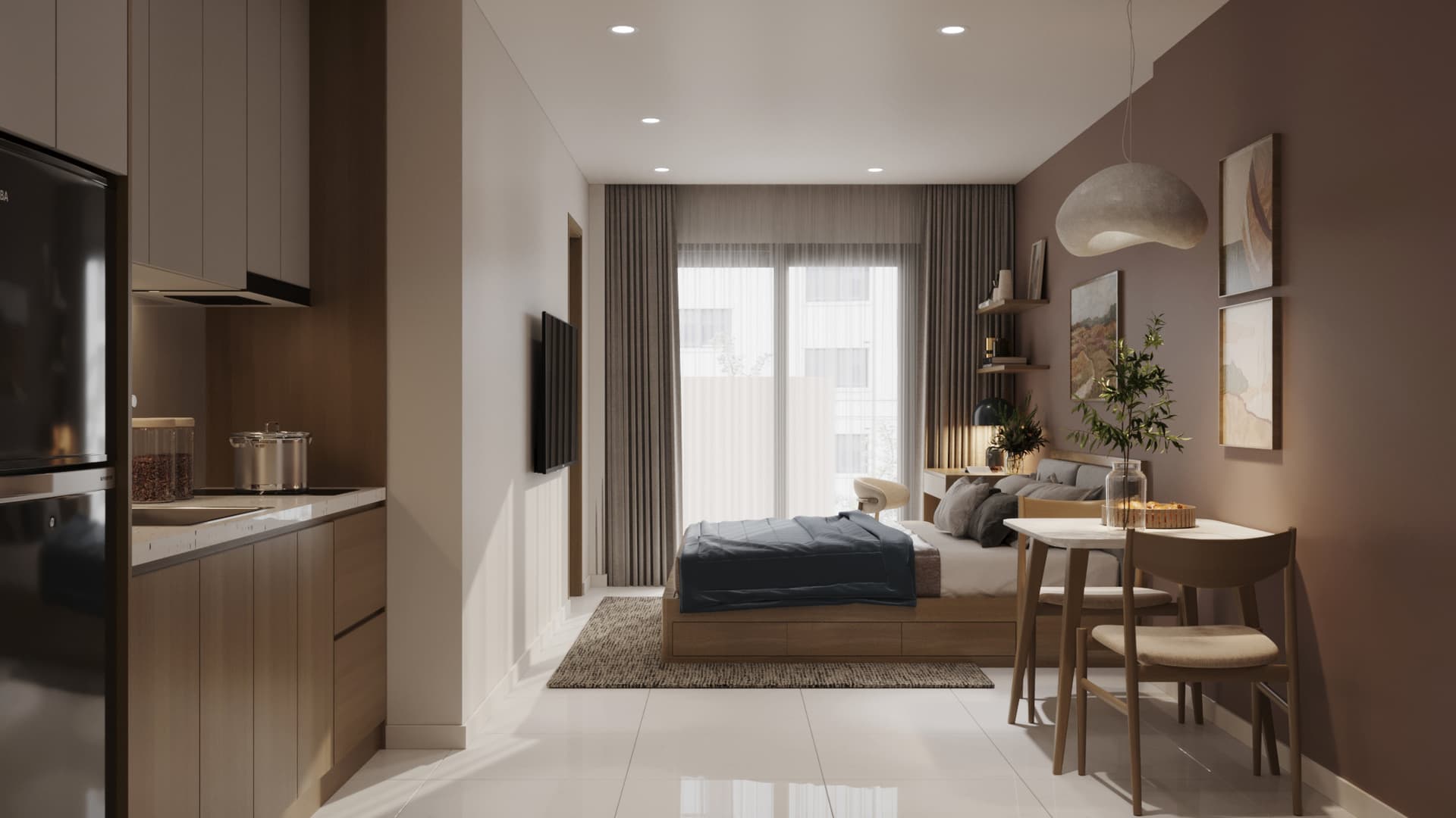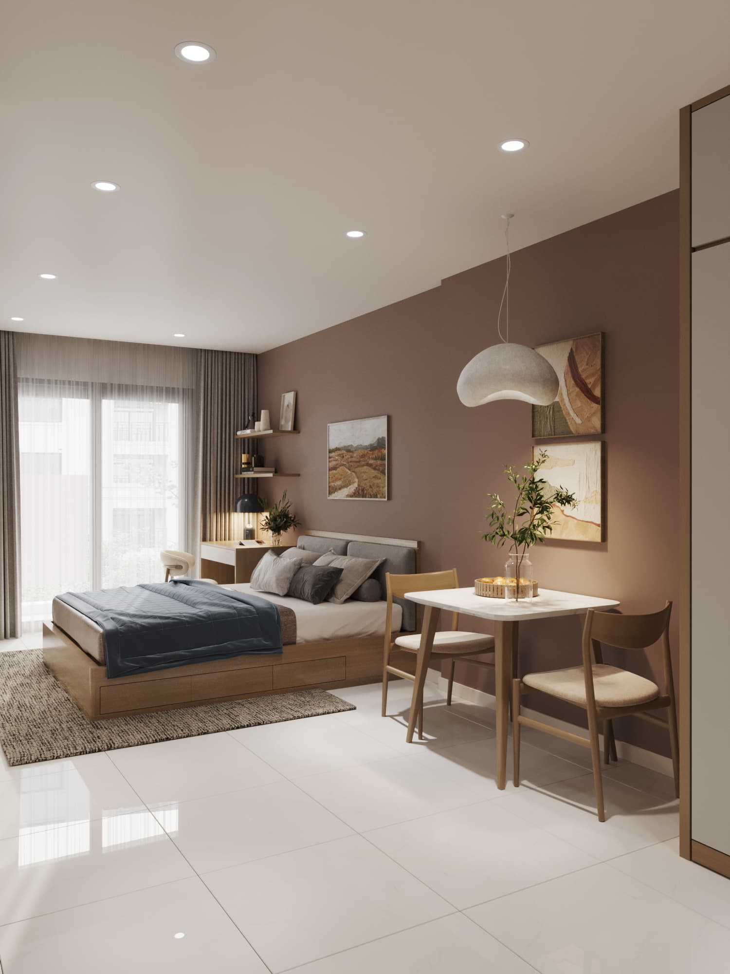 Căn hộ được thiết kế theo phong cách tối giản, nổi bật với gam màu trung tính nhẹ nhàng, đường nét gọn gàng và bố cục hài hòa. Nội thất tinh giản nhưng tiện nghi, kết hợp ánh sáng tự nhiên và vài điểm nhấn trang trí tinh tế, mang lại không gian sống thanh lịch, ấm cúng và thoáng đãng