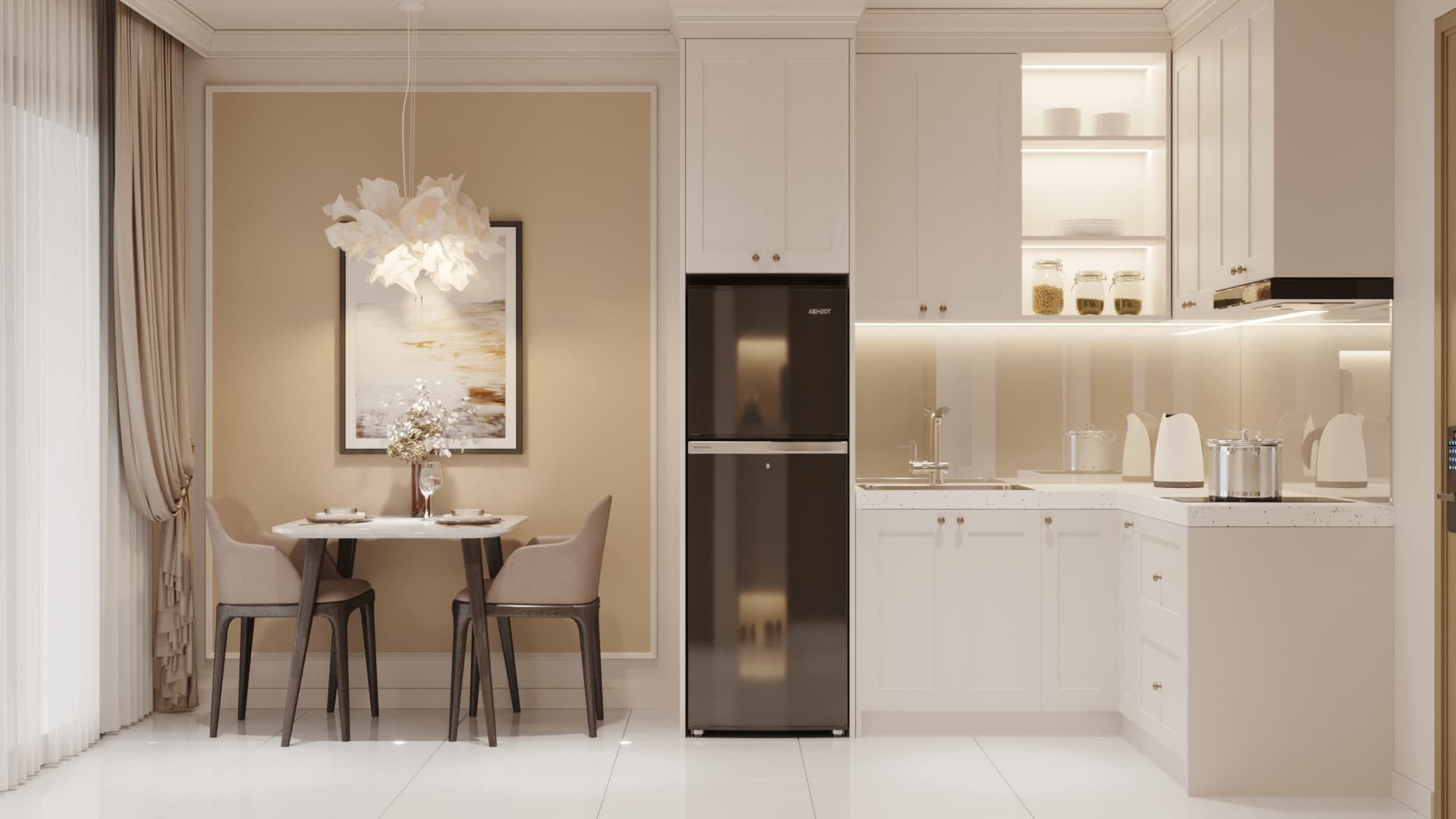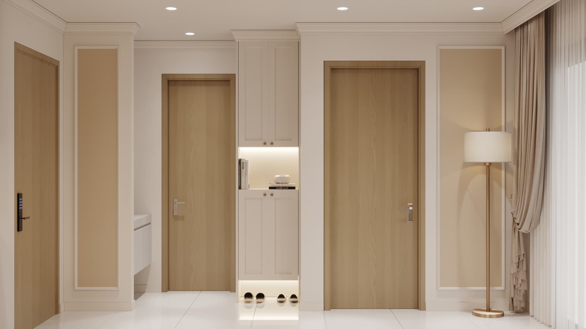 Căn hộ mang phong cách tân cổ điển, nổi bật với gam màu trung tính sang trọng, phào chỉ tinh tế và nội thất hiện đại pha chút cổ điển. Sự kết hợp hài hòa giữa đường nét mềm mại, ánh sáng ấm áp và chất liệu cao cấp tạo nên không gian sống thanh lịch, tinh tế và đầy cuốn hút