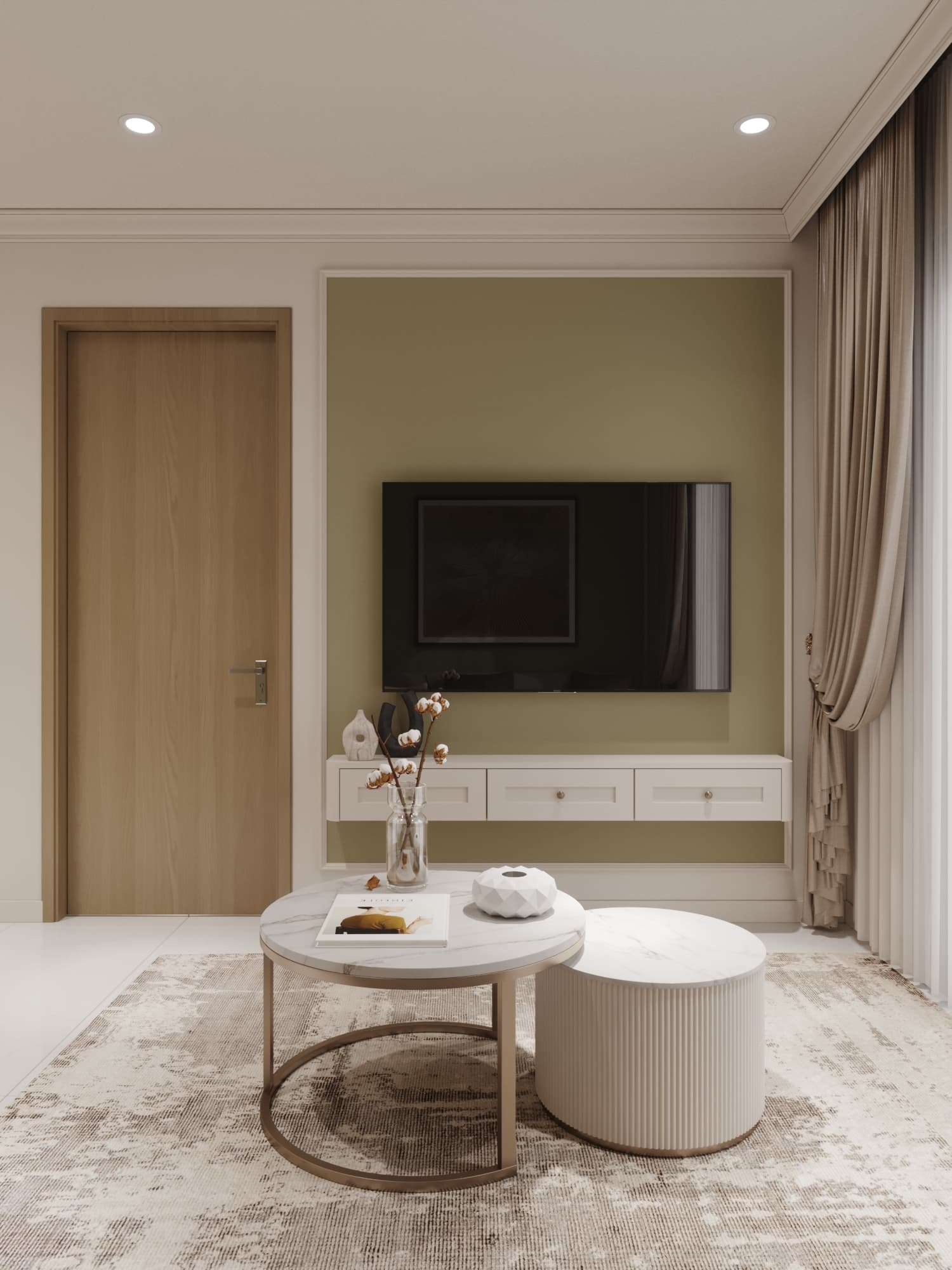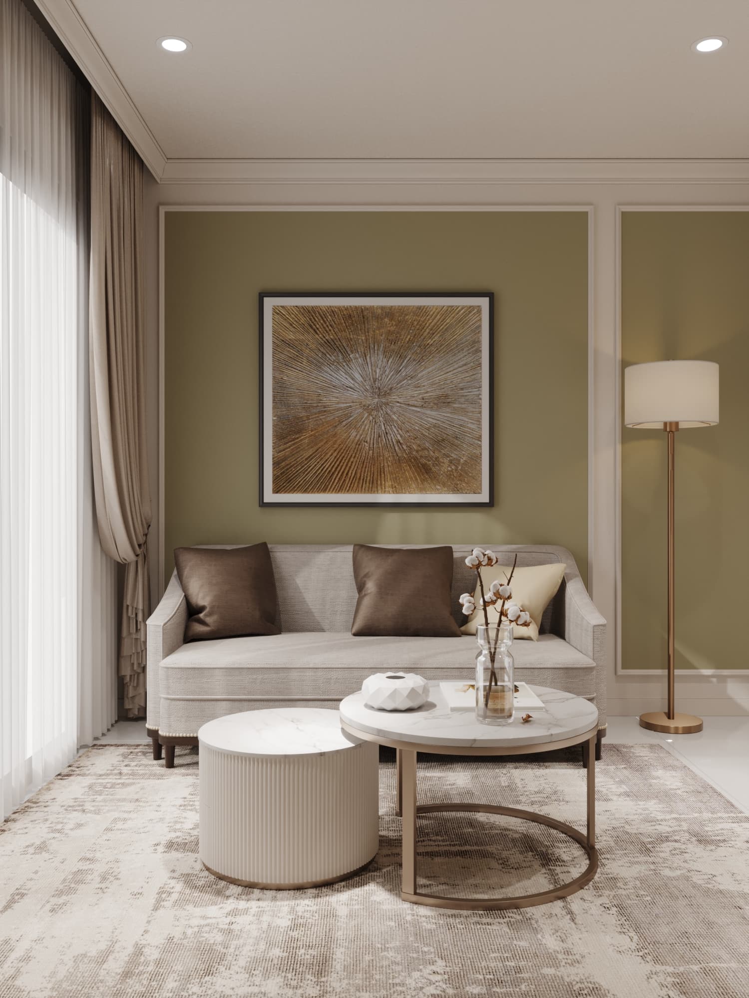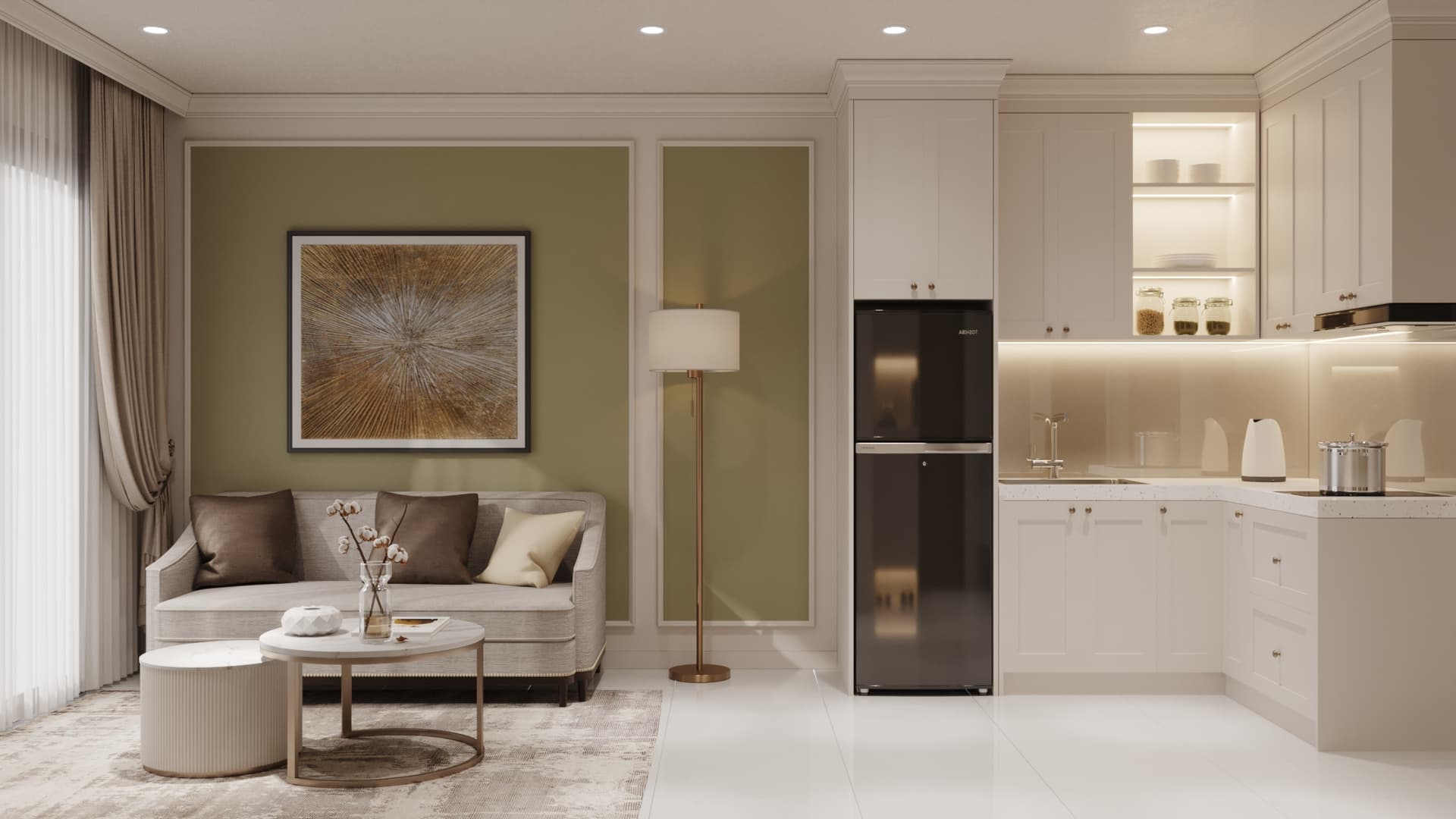 Căn hộ mang phong cách tân cổ điển, nổi bật với gam màu trung tính sang trọng, phào chỉ tinh tế và nội thất hiện đại pha chút cổ điển. Sự kết hợp hài hòa giữa đường nét mềm mại, ánh sáng ấm áp và chất liệu cao cấp tạo nên không gian sống thanh lịch, tinh tế và đầy cuốn hút