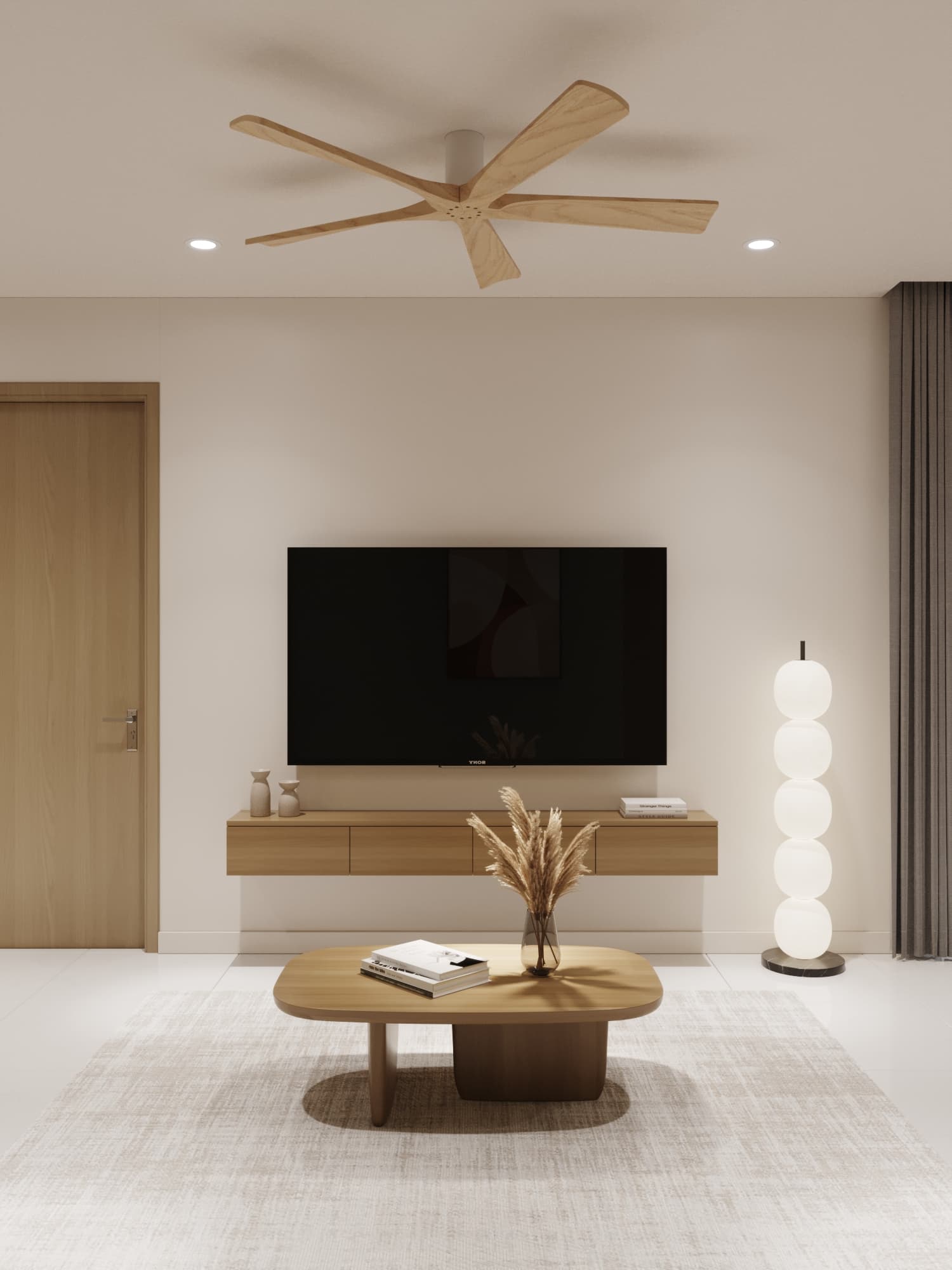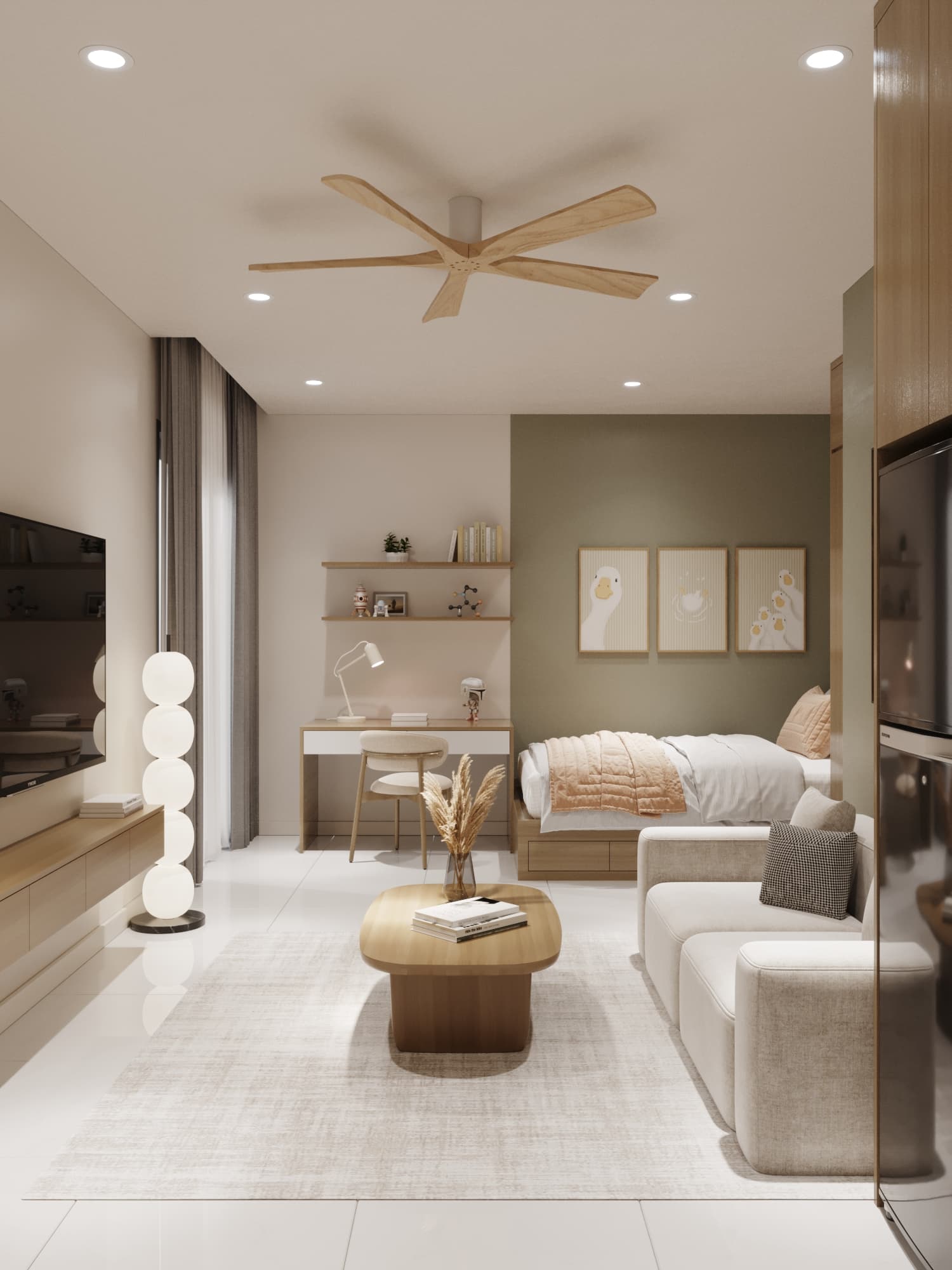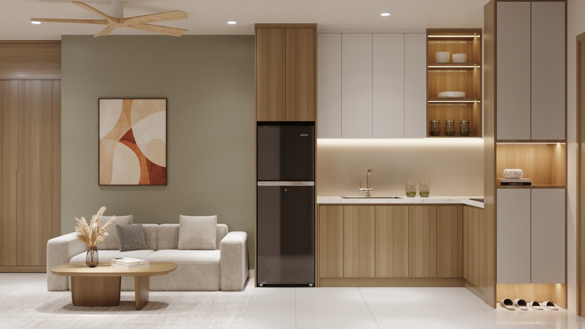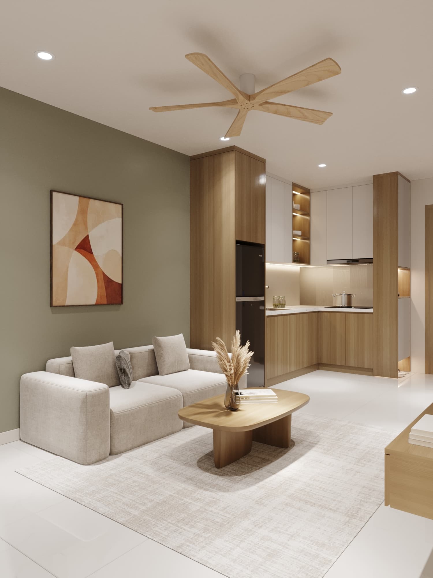 Căn hộ được thiết kế theo phong cách tối giản, nổi bật với gam màu trung tính nhẹ nhàng, đường nét gọn gàng và bố cục hài hòa. Nội thất tinh giản nhưng tiện nghi, kết hợp ánh sáng tự nhiên và vài điểm nhấn trang trí tinh tế, mang lại không gian sống thanh lịch, ấm cúng và thoáng đãng