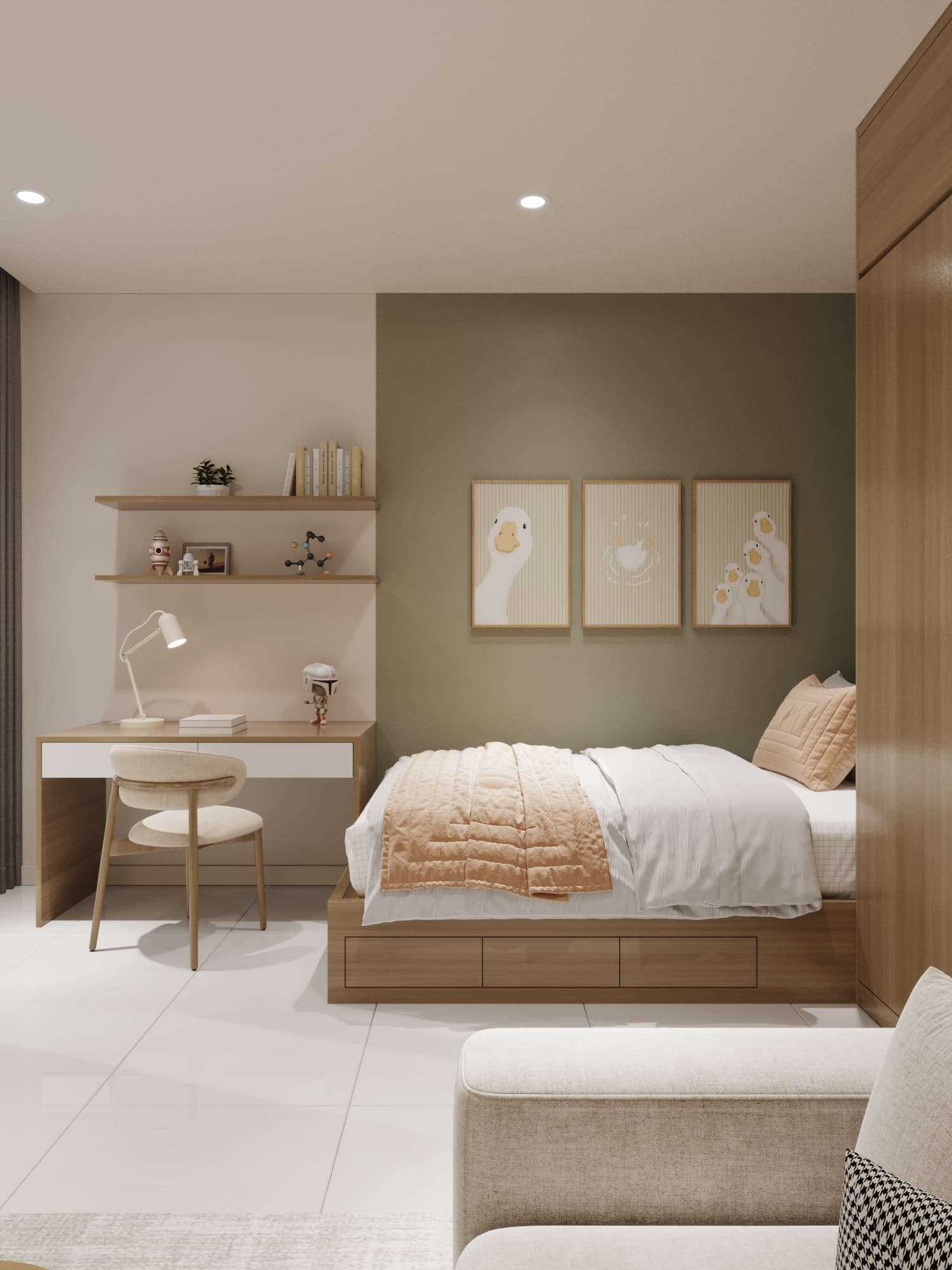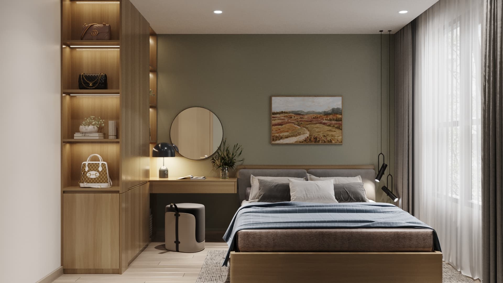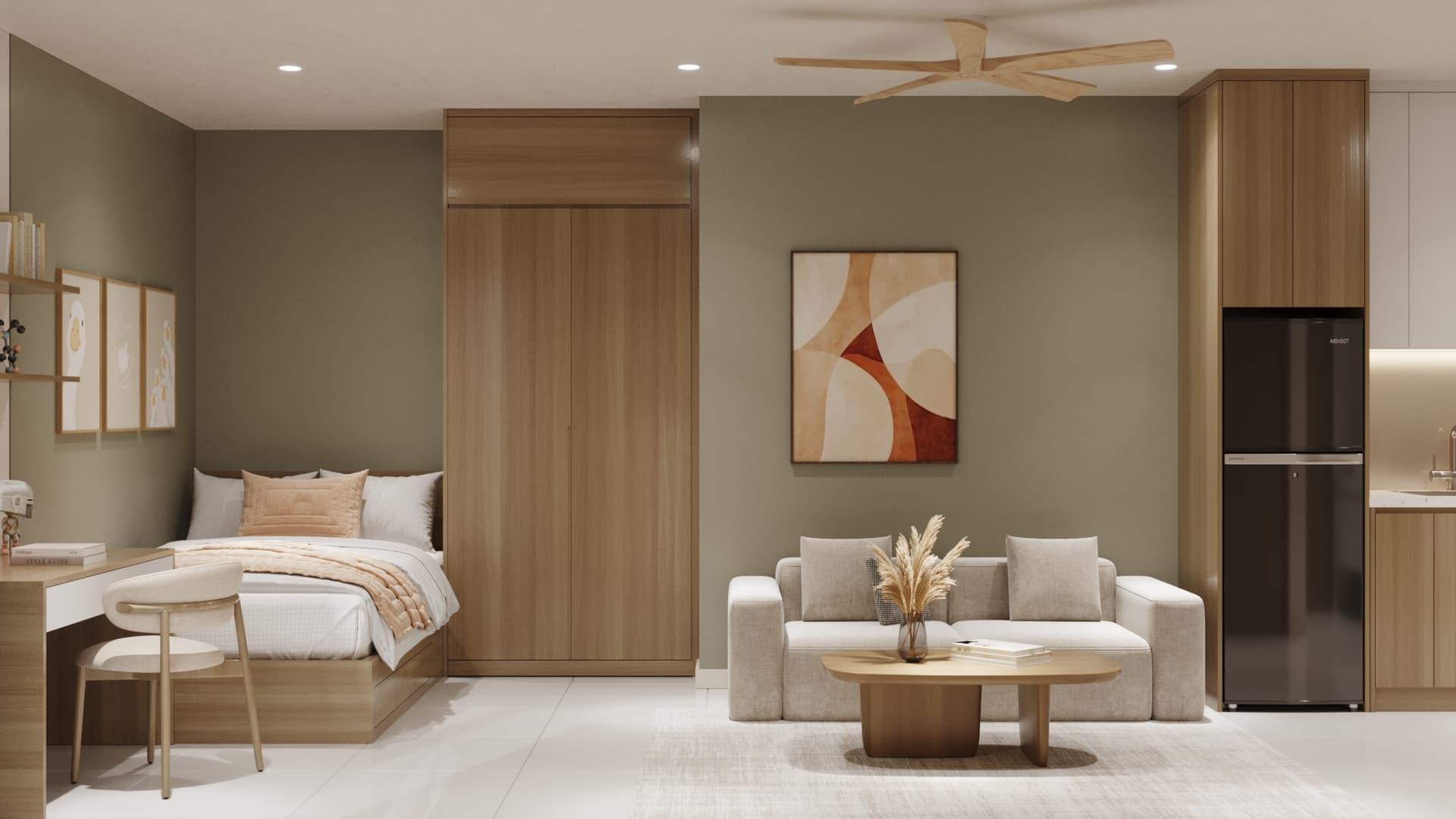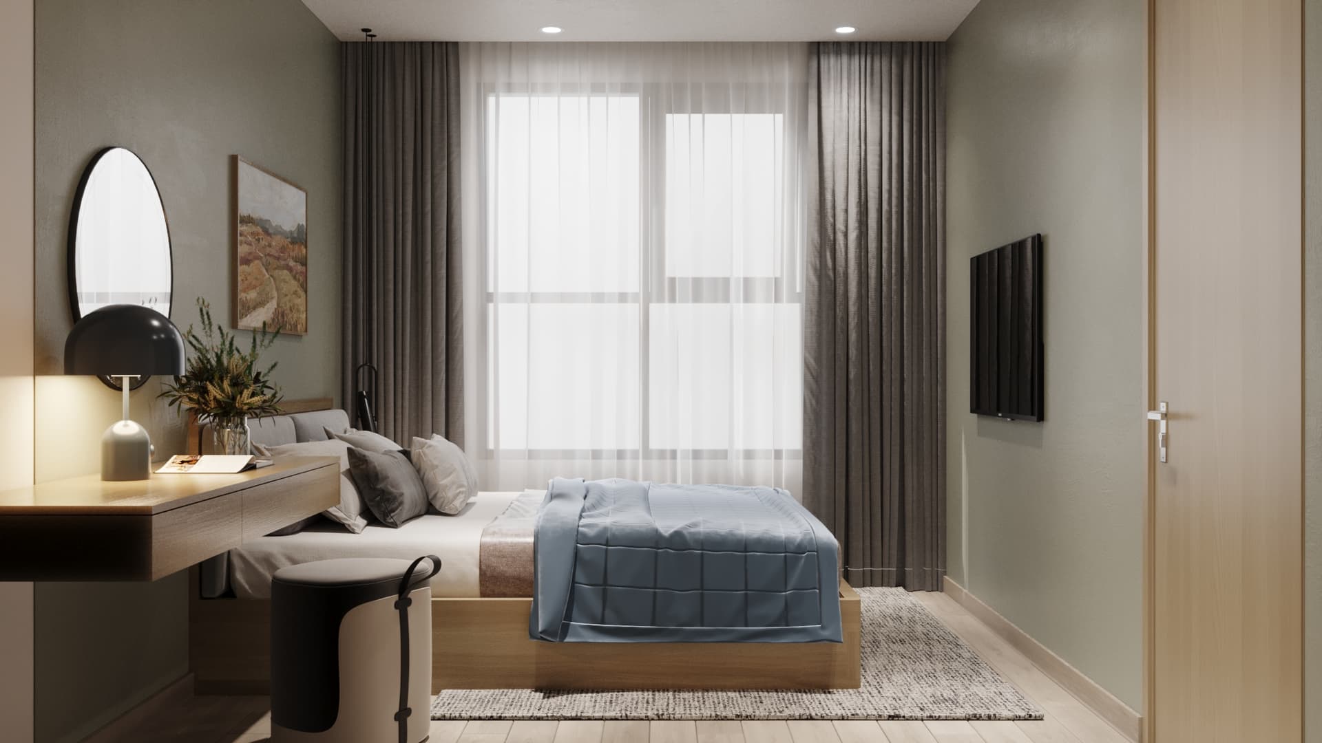 Căn hộ được thiết kế theo phong cách tối giản, nổi bật với gam màu trung tính nhẹ nhàng, đường nét gọn gàng và bố cục hài hòa. Nội thất tinh giản nhưng tiện nghi, kết hợp ánh sáng tự nhiên và vài điểm nhấn trang trí tinh tế, mang lại không gian sống thanh lịch, ấm cúng và thoáng đãng