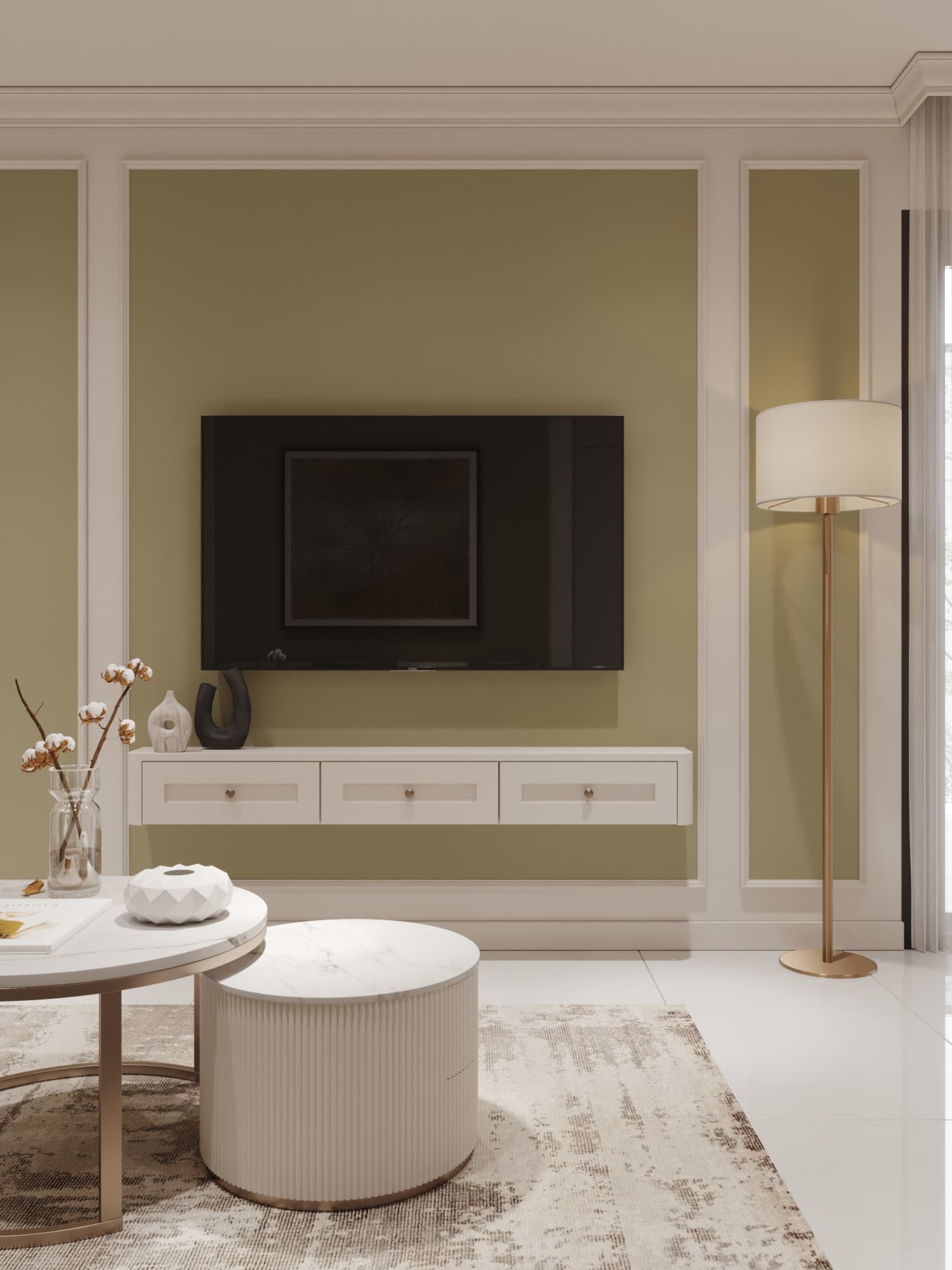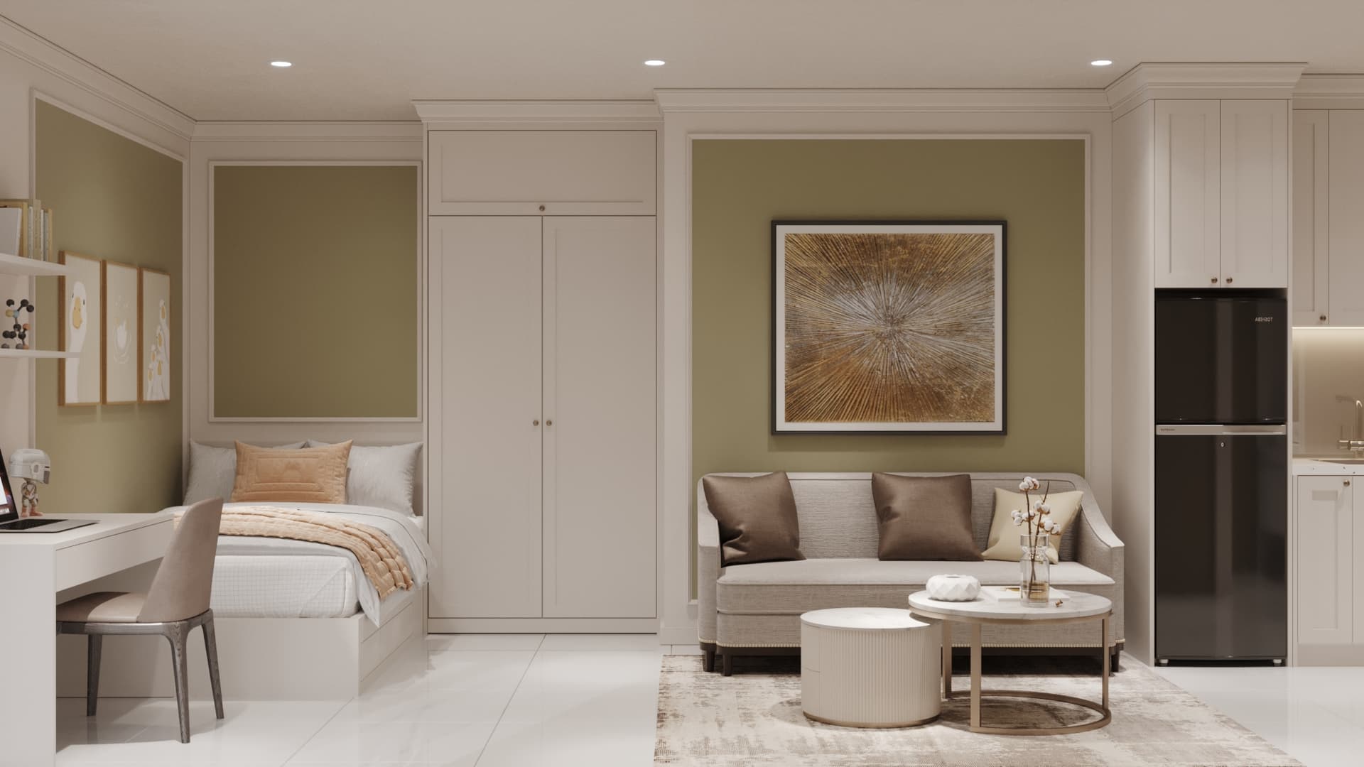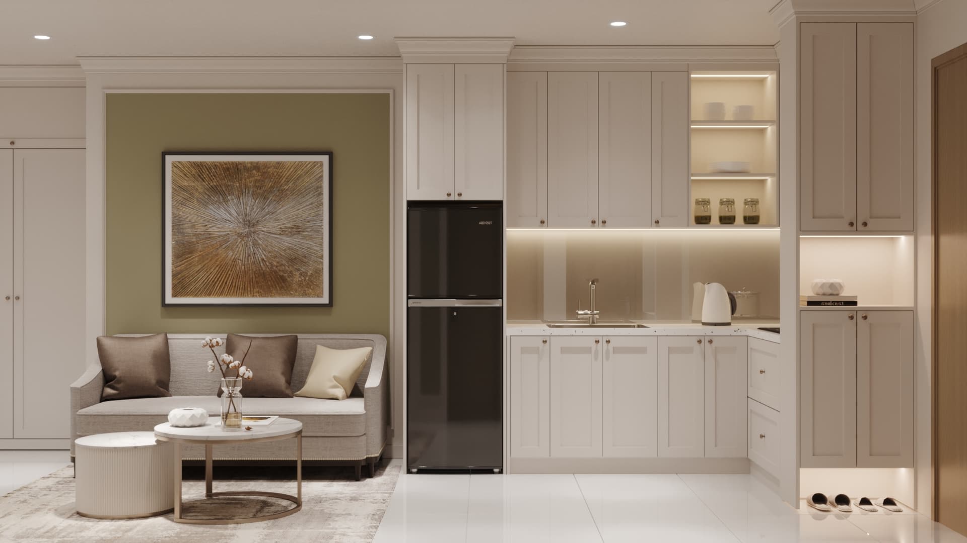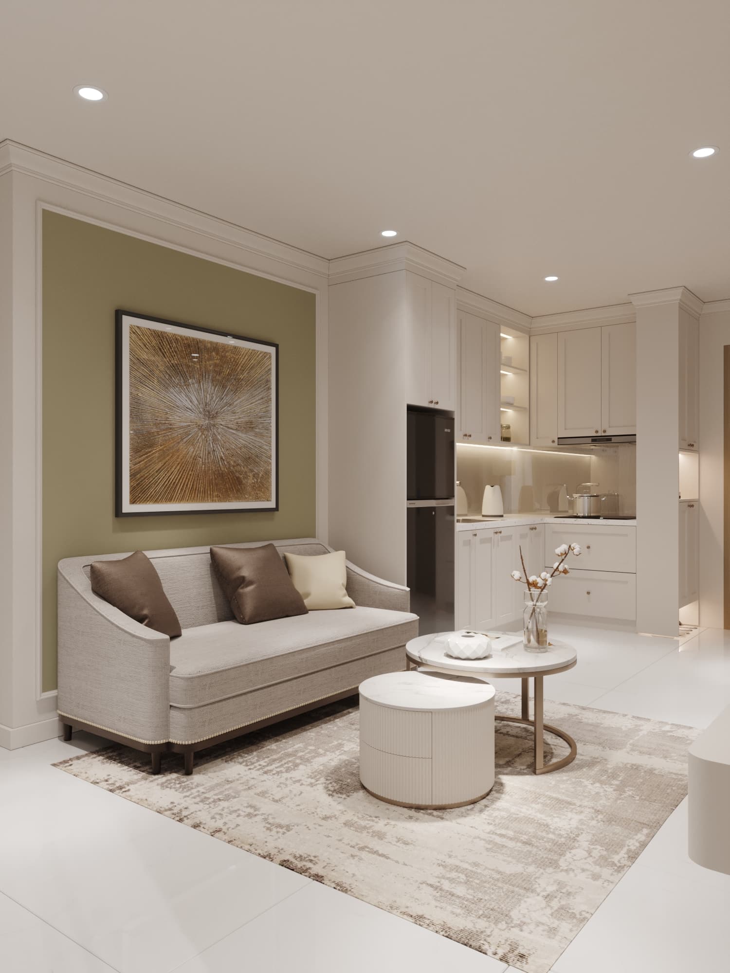 Căn hộ mang phong cách tân cổ điển, nổi bật với gam màu trung tính sang trọng, phào chỉ tinh tế và nội thất hiện đại pha chút cổ điển. Sự kết hợp hài hòa giữa đường nét mềm mại, ánh sáng ấm áp và chất liệu cao cấp tạo nên không gian sống thanh lịch, tinh tế và đầy cuốn hút