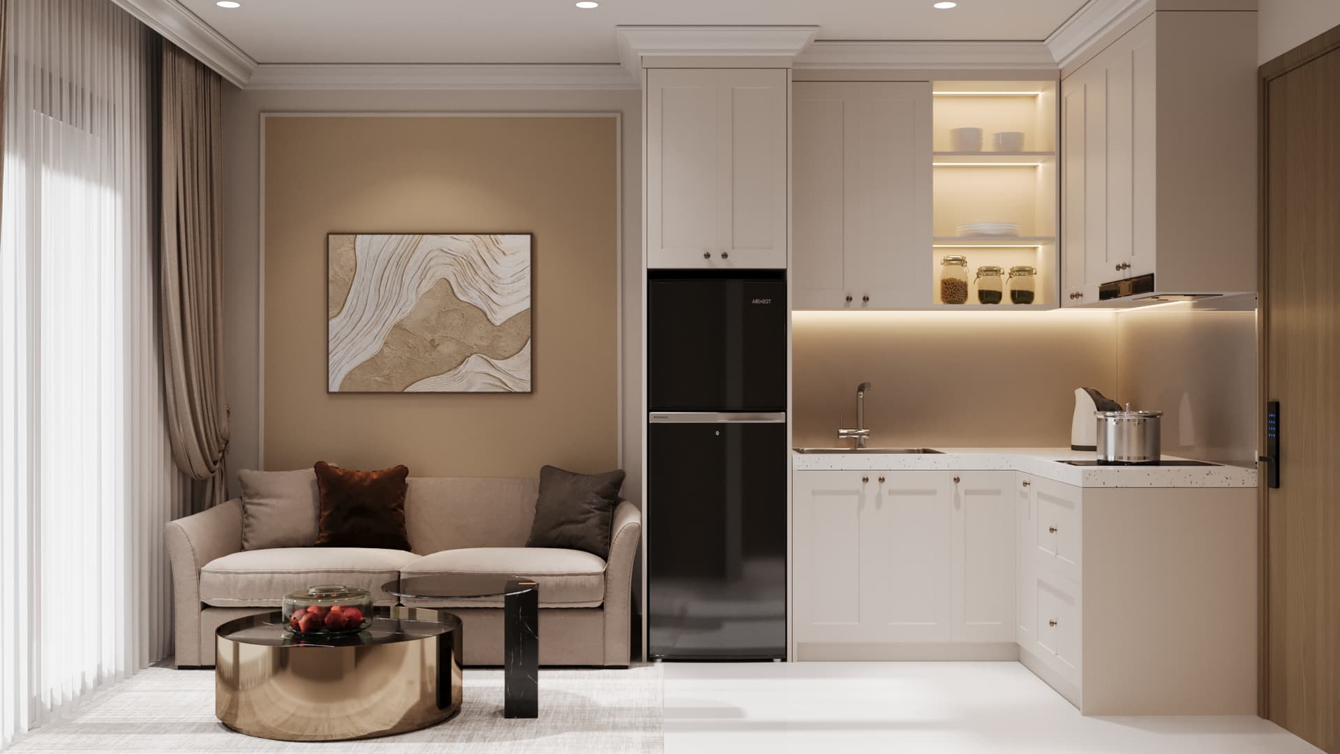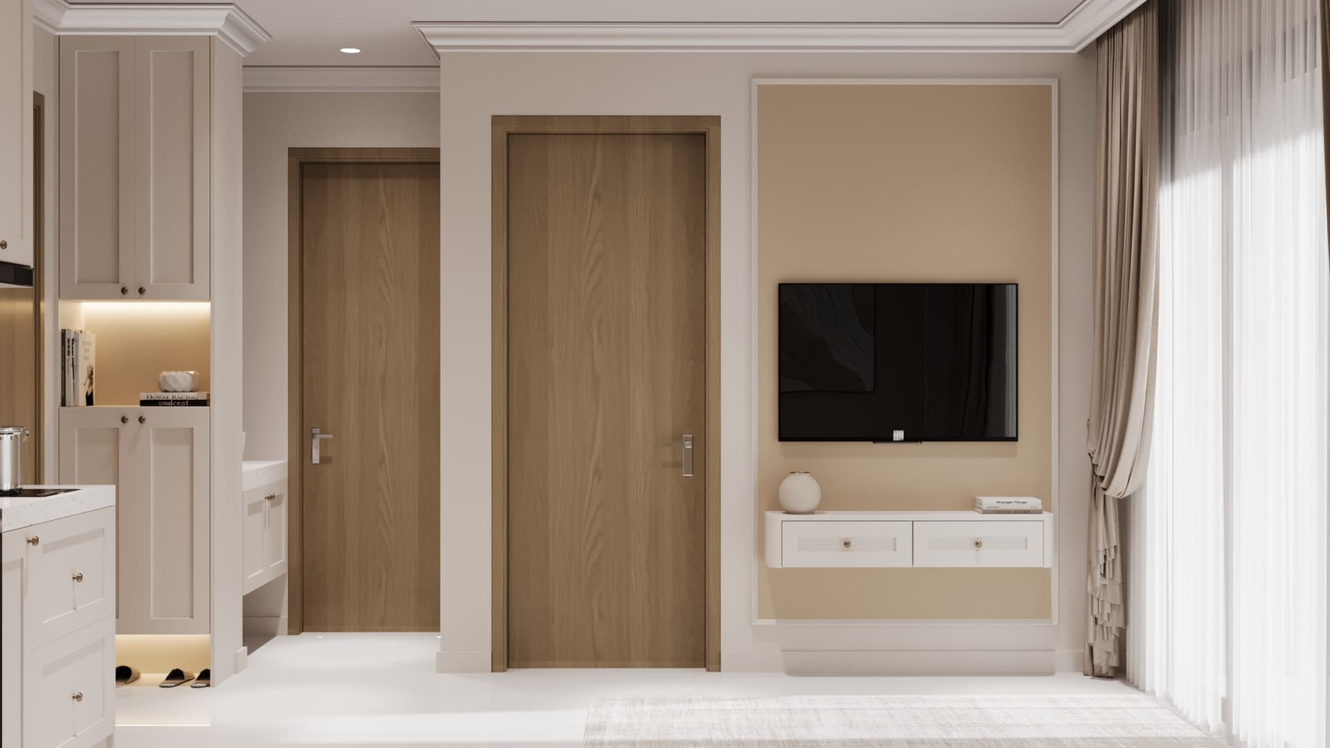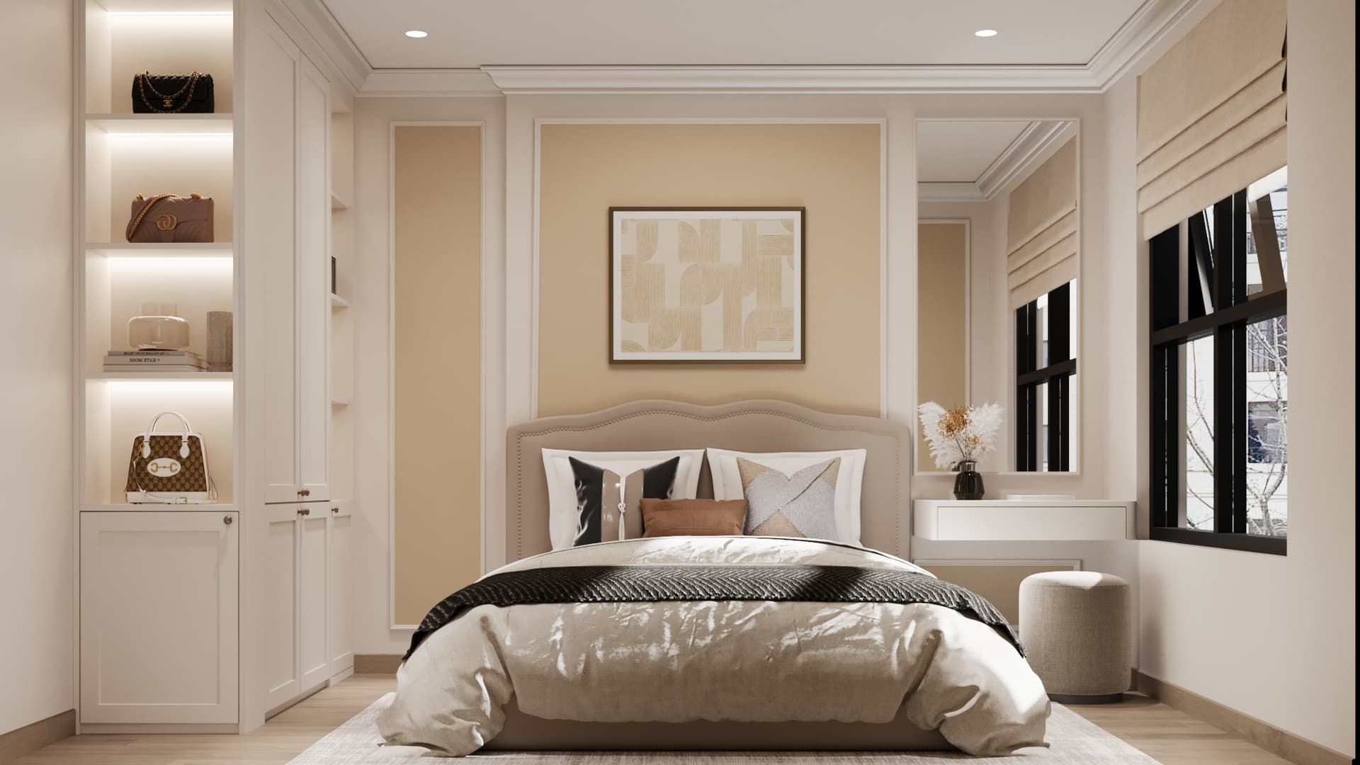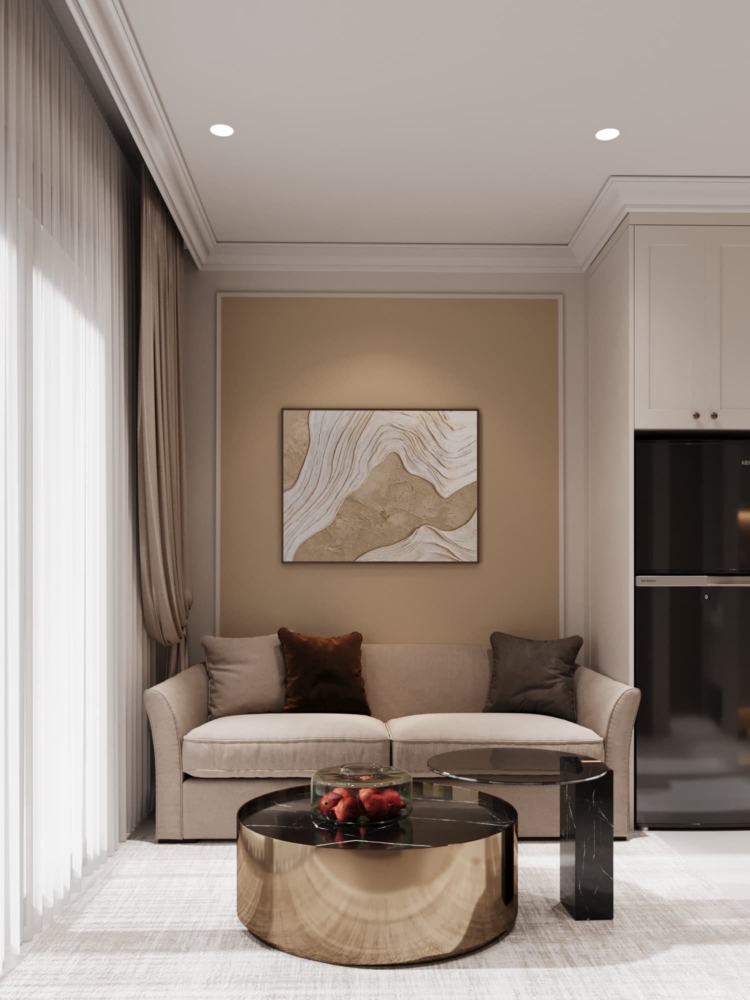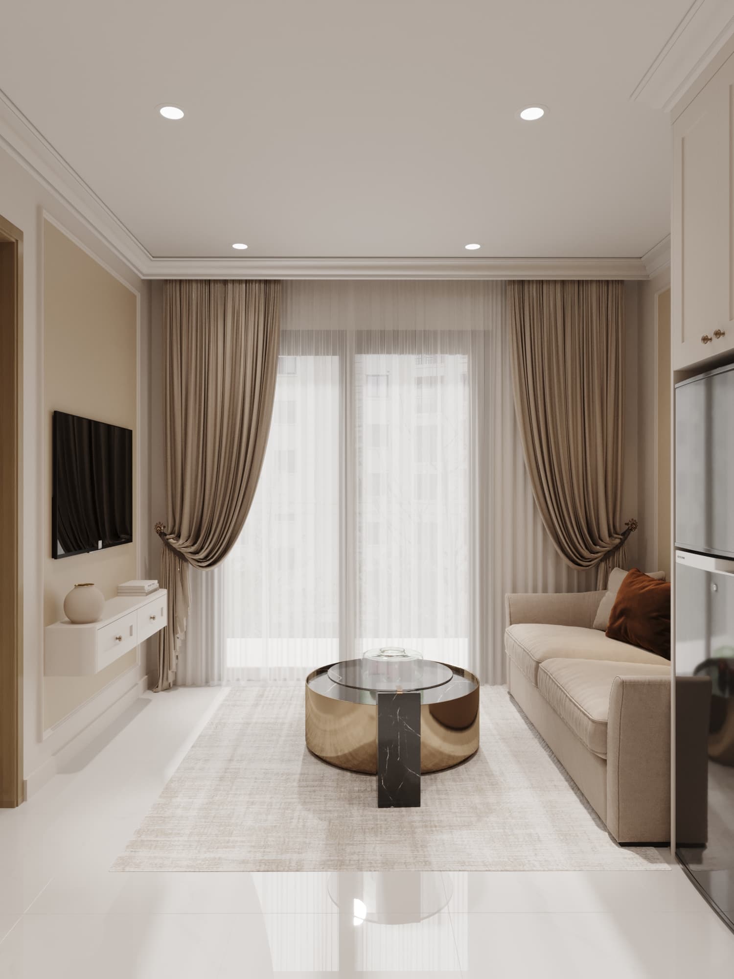 Căn hộ mang phong cách tân cổ điển, nổi bật với gam màu trung tính sang trọng, phào chỉ tinh tế và nội thất hiện đại pha chút cổ điển. Sự kết hợp hài hòa giữa đường nét mềm mại, ánh sáng ấm áp và chất liệu cao cấp tạo nên không gian sống thanh lịch, tinh tế và đầy cuốn hút