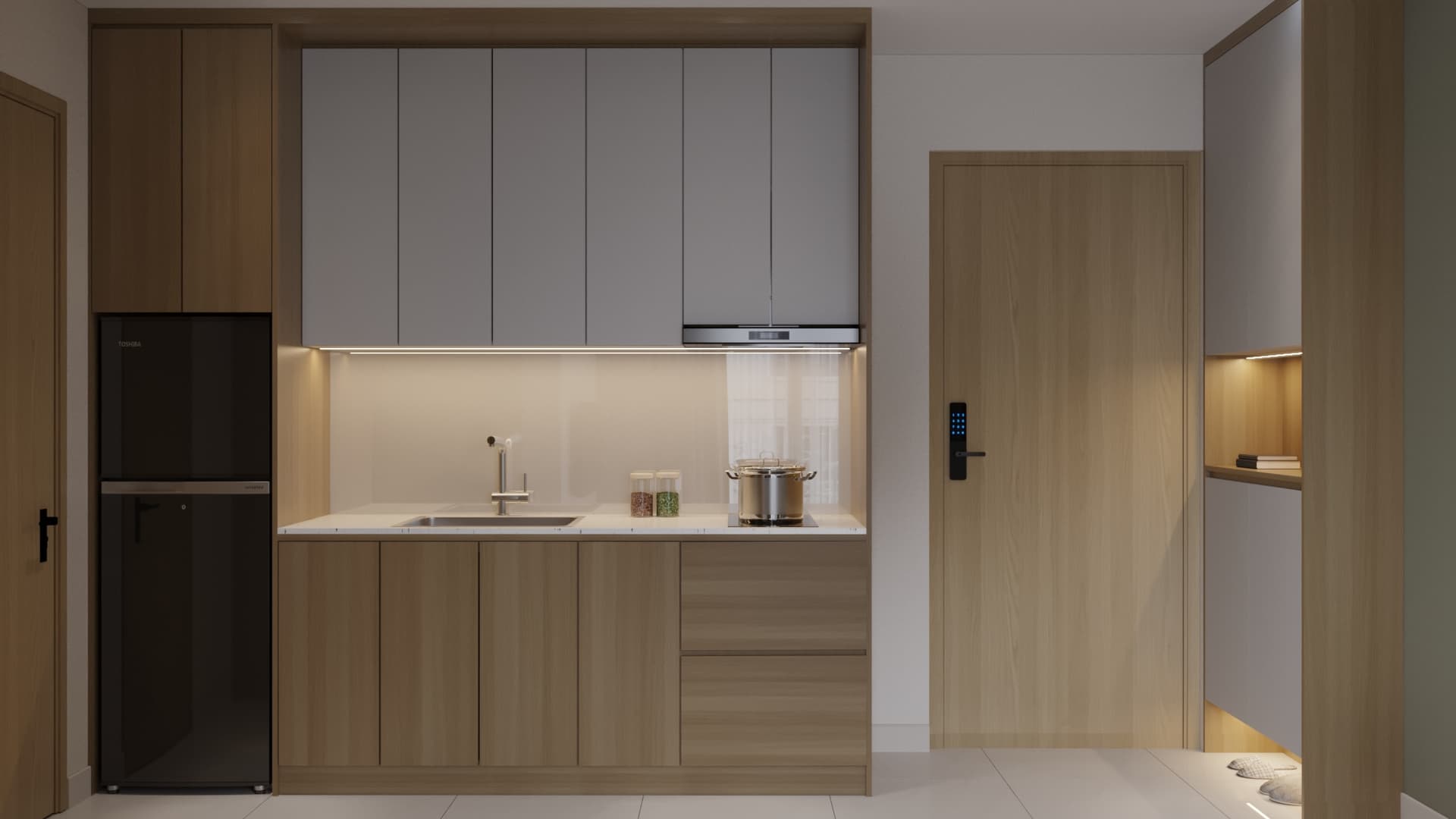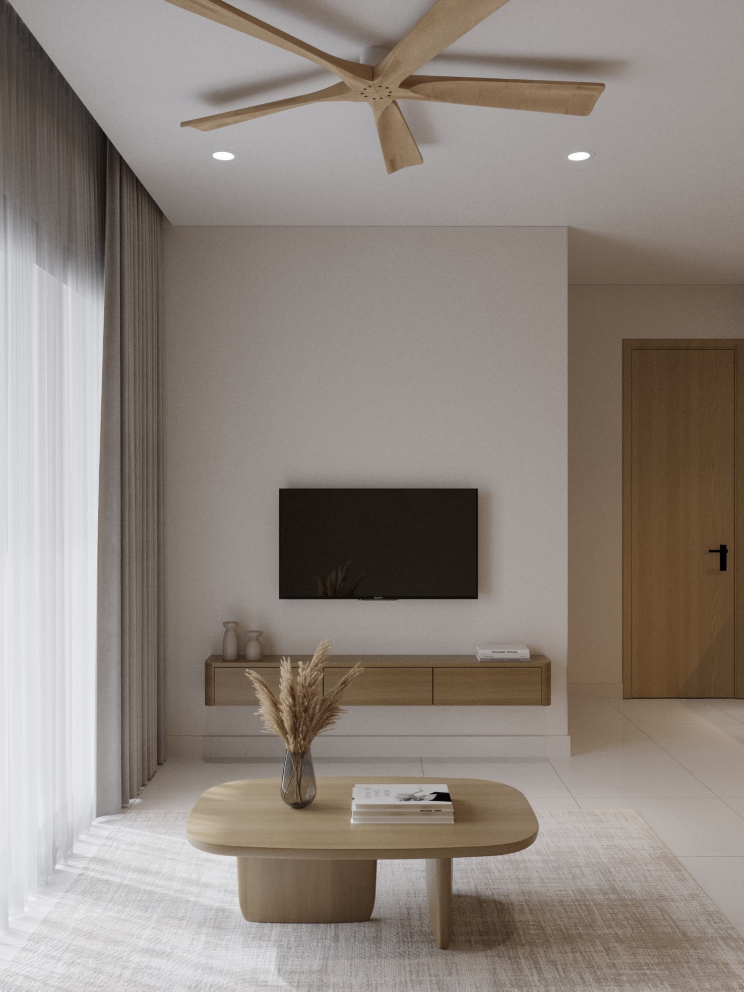 Căn hộ được thiết kế theo phong cách tối giản, nổi bật với gam màu trung tính nhẹ nhàng, đường nét gọn gàng và bố cục hài hòa. Nội thất tinh giản nhưng tiện nghi, kết hợp ánh sáng tự nhiên và vài điểm nhấn trang trí tinh tế, mang lại không gian sống thanh lịch, ấm cúng và thoáng đãng