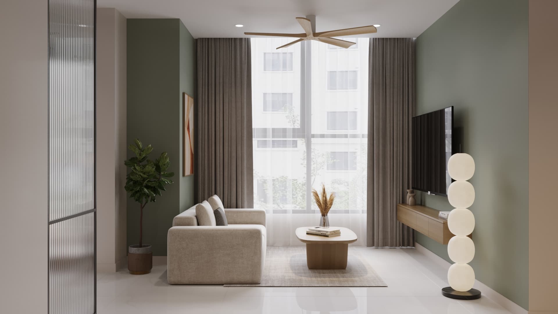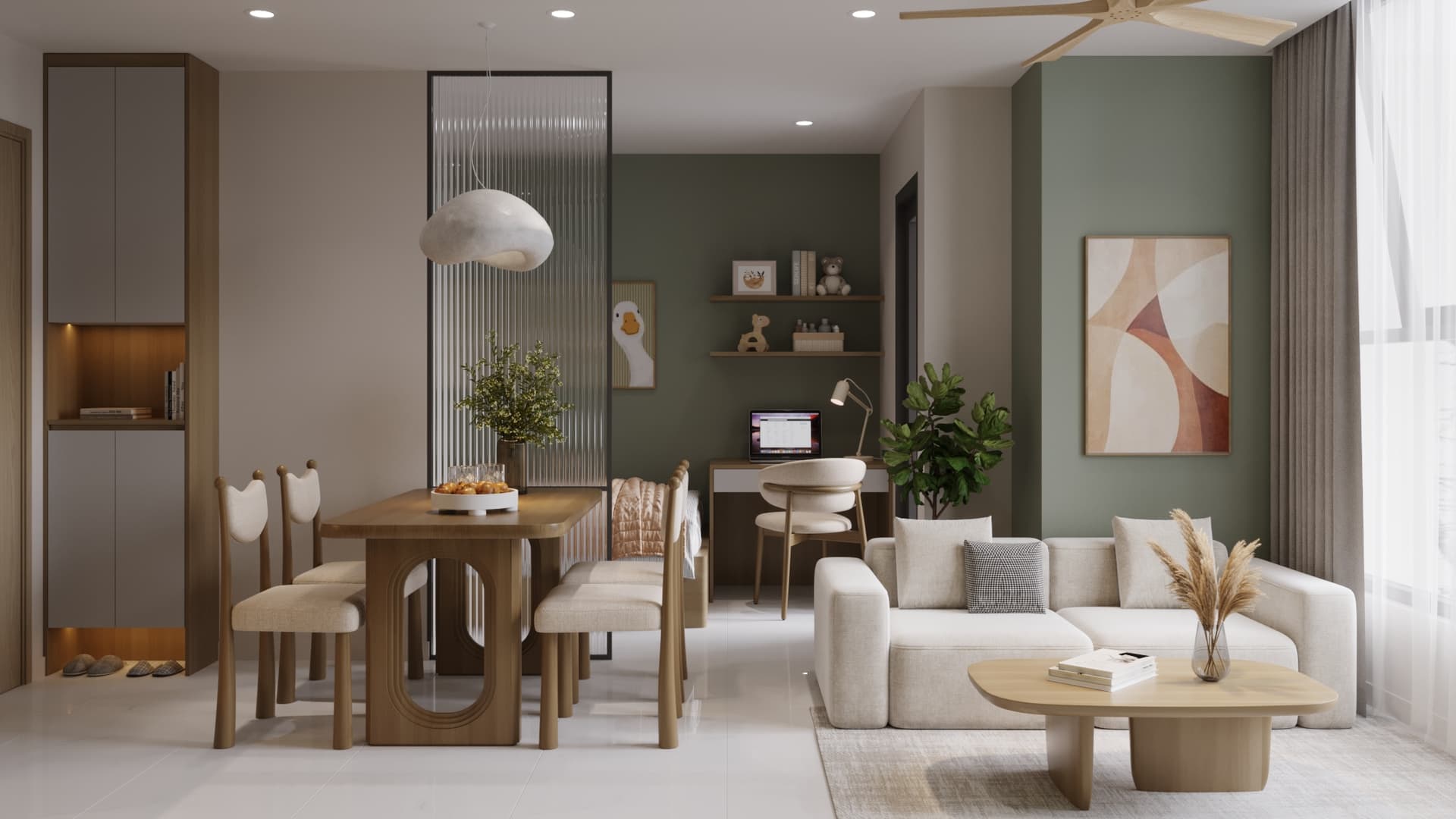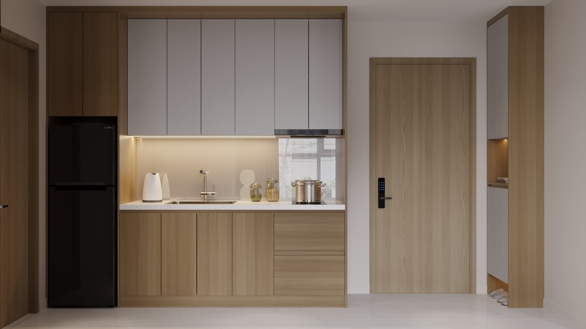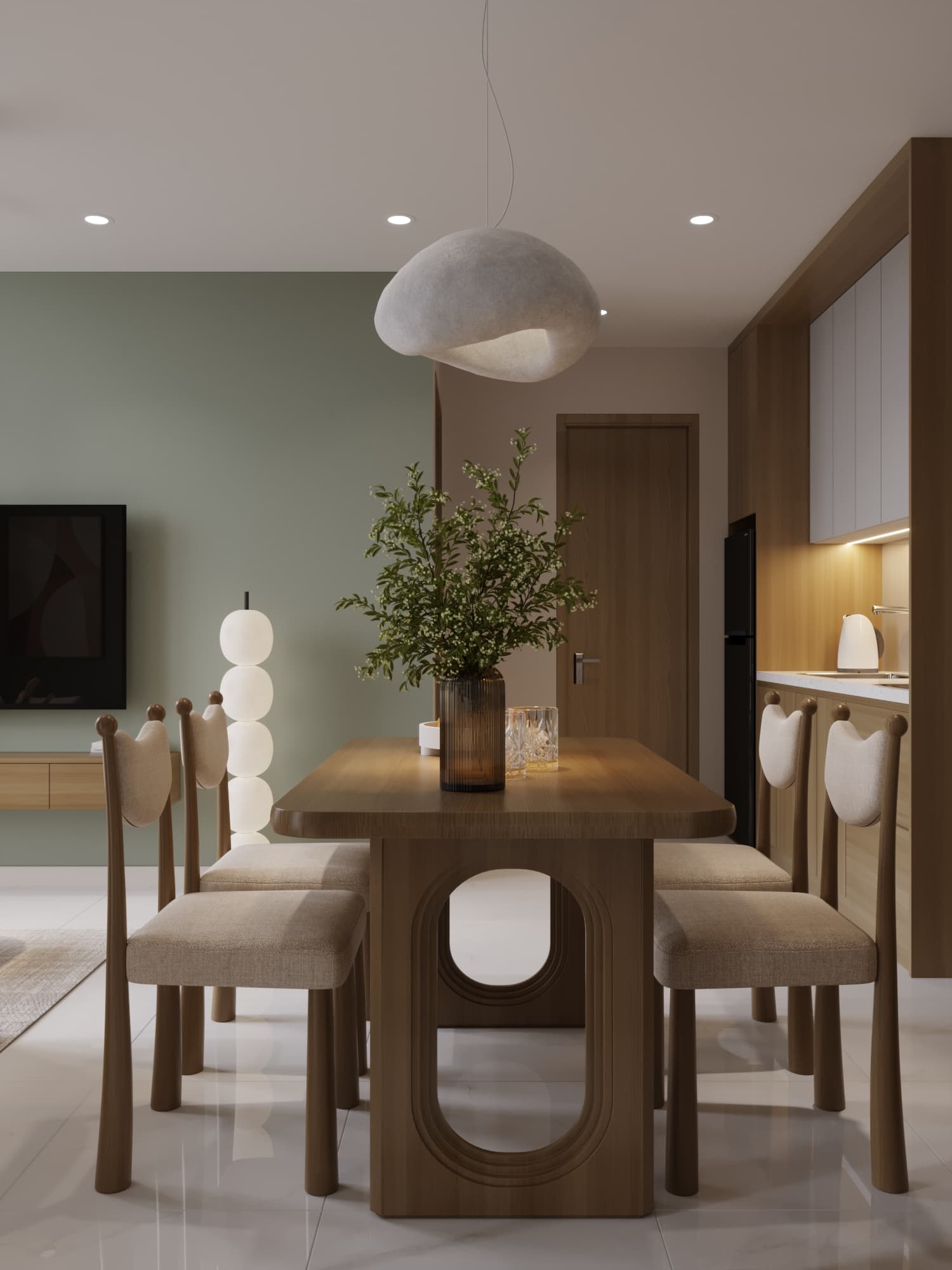 Căn hộ được thiết kế theo phong cách tối giản, nổi bật với gam màu trung tính nhẹ nhàng, đường nét gọn gàng và bố cục hài hòa. Nội thất tinh giản nhưng tiện nghi, kết hợp ánh sáng tự nhiên và vài điểm nhấn trang trí tinh tế, mang lại không gian sống thanh lịch, ấm cúng và thoáng đãng