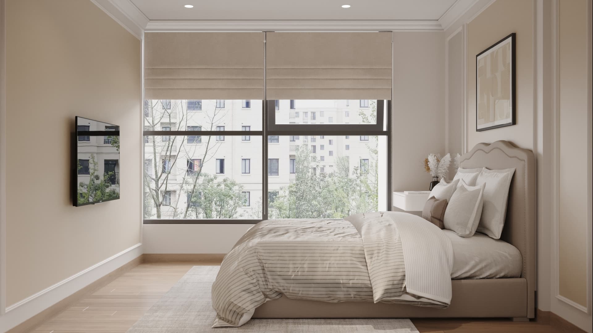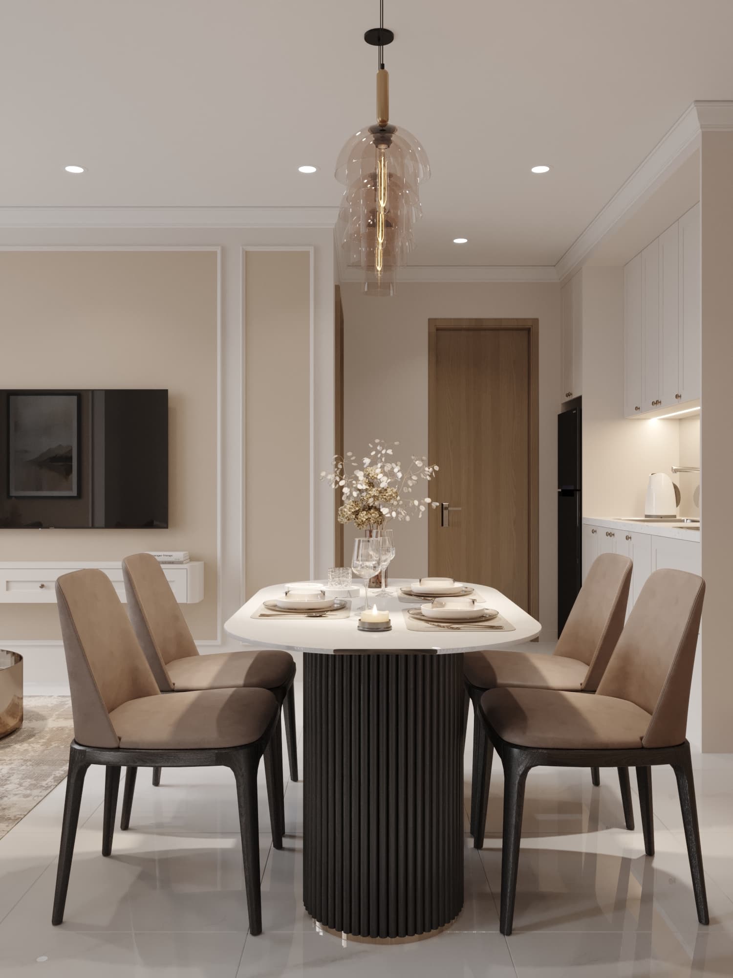 Căn hộ mang phong cách tân cổ điển, nổi bật với gam màu trung tính sang trọng, phào chỉ tinh tế và nội thất hiện đại pha chút cổ điển. Sự kết hợp hài hòa giữa đường nét mềm mại, ánh sáng ấm áp và chất liệu cao cấp tạo nên không gian sống thanh lịch, tinh tế và đầy cuốn hút