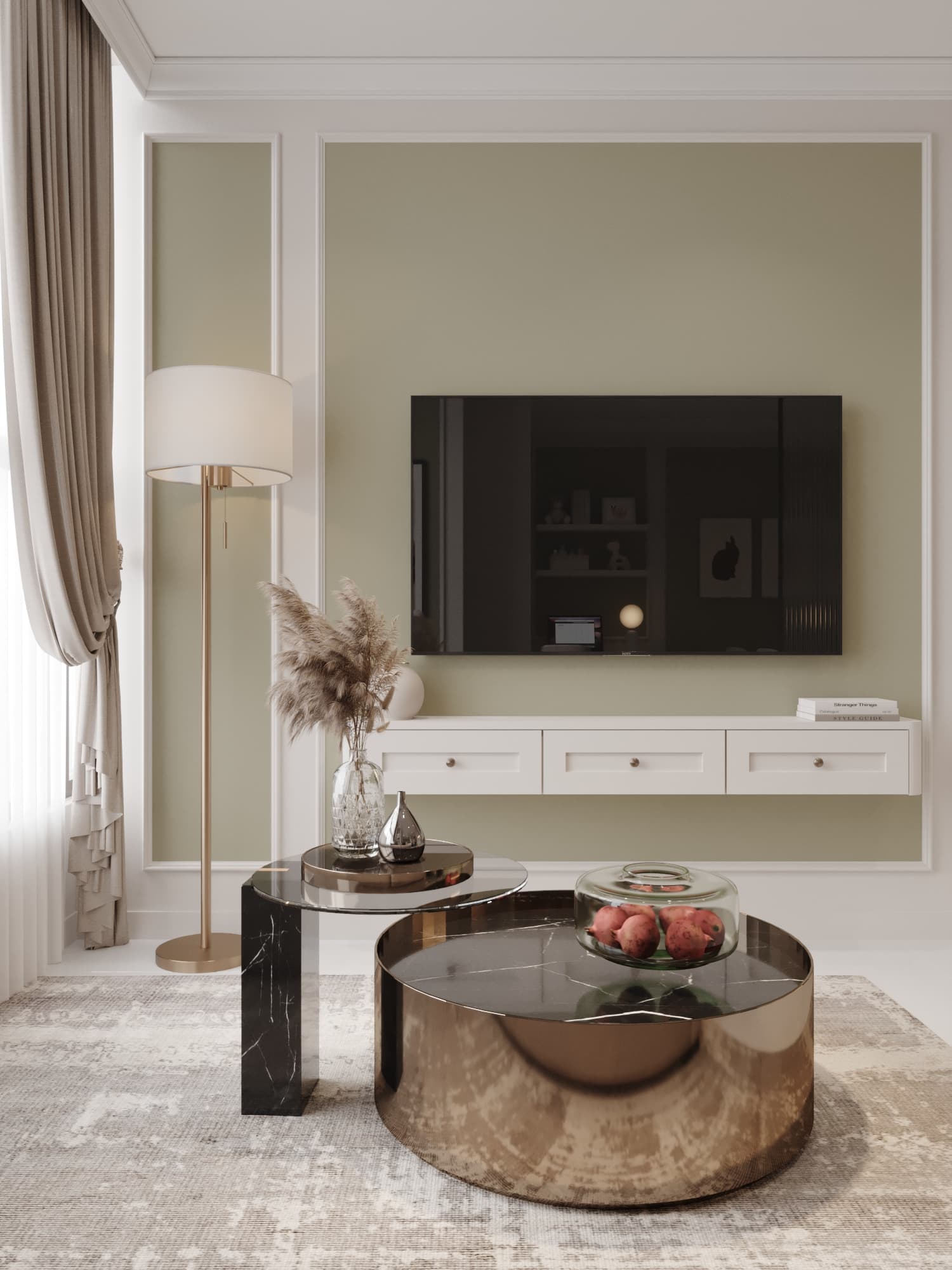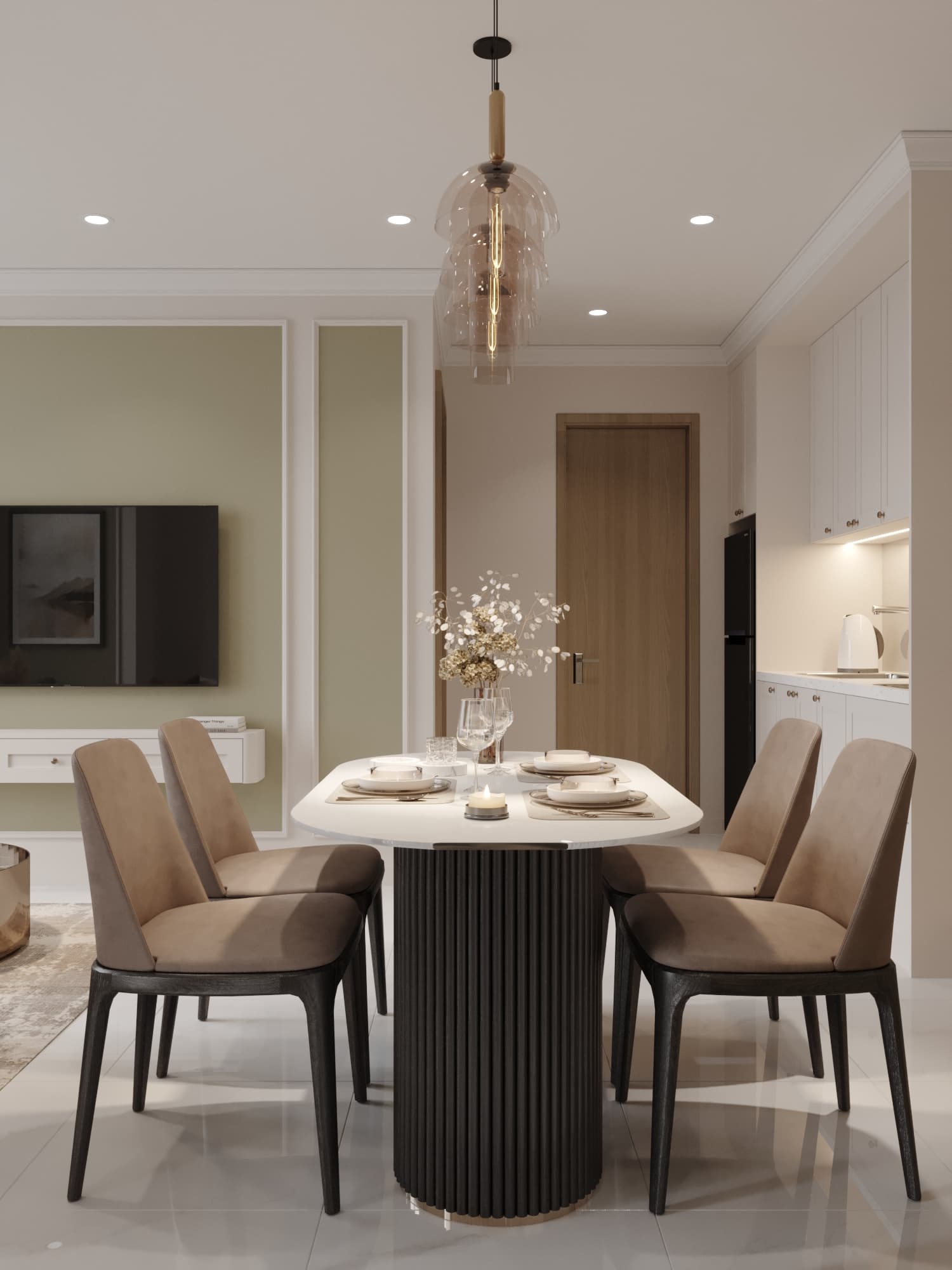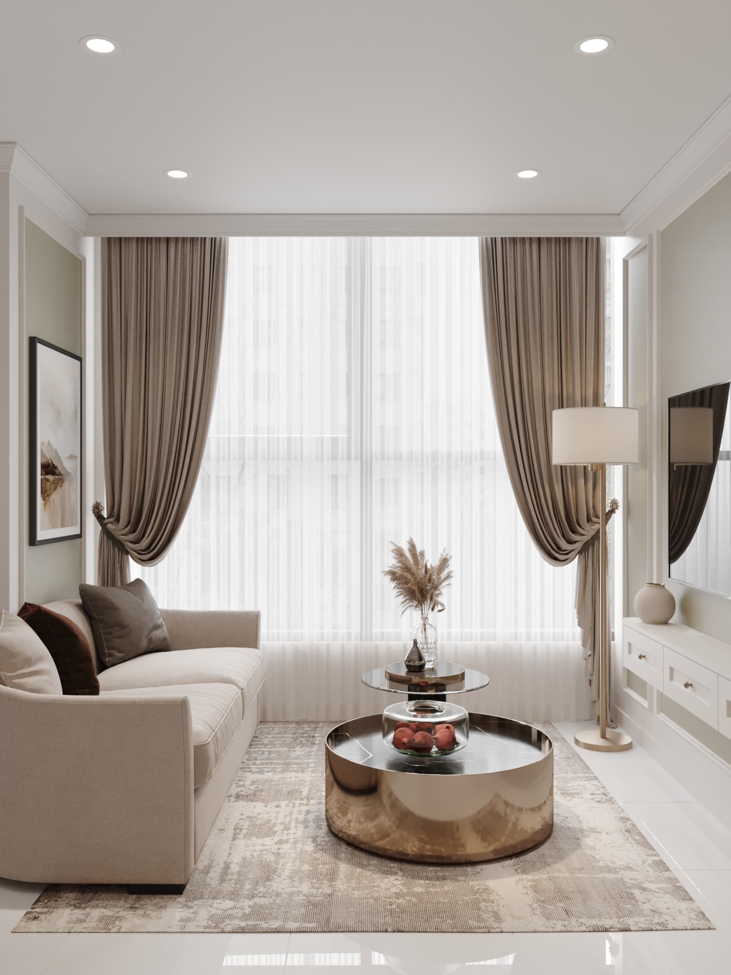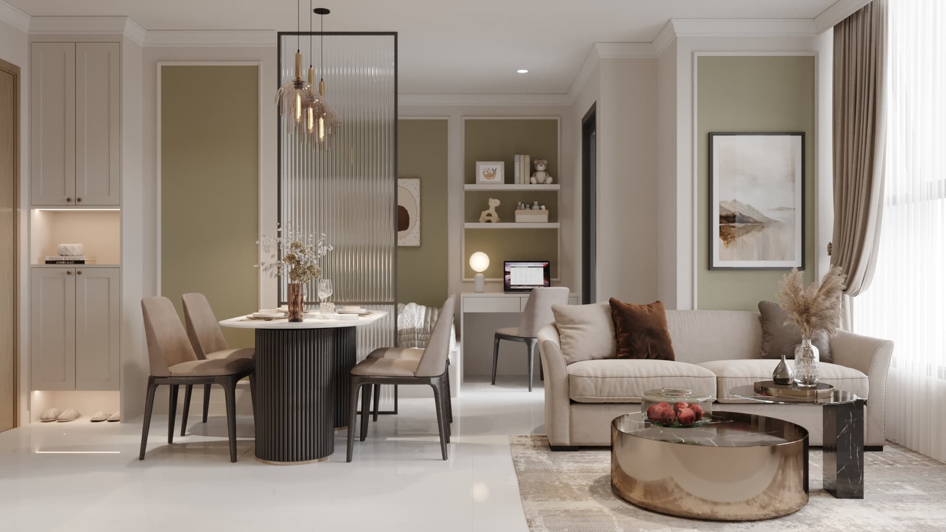 Căn hộ mang phong cách tân cổ điển, nổi bật với gam màu trung tính sang trọng, phào chỉ tinh tế và nội thất hiện đại pha chút cổ điển. Sự kết hợp hài hòa giữa đường nét mềm mại, ánh sáng ấm áp và chất liệu cao cấp tạo nên không gian sống thanh lịch, tinh tế và đầy cuốn hút