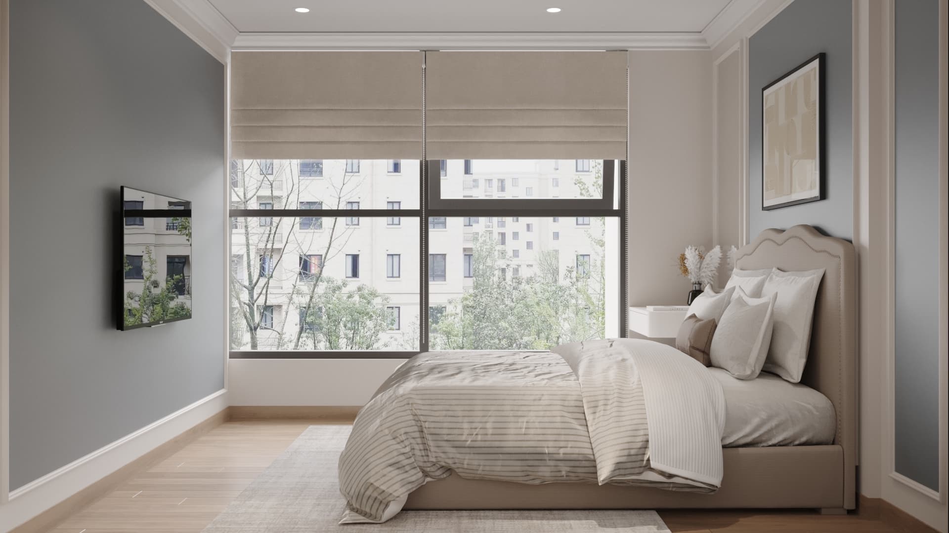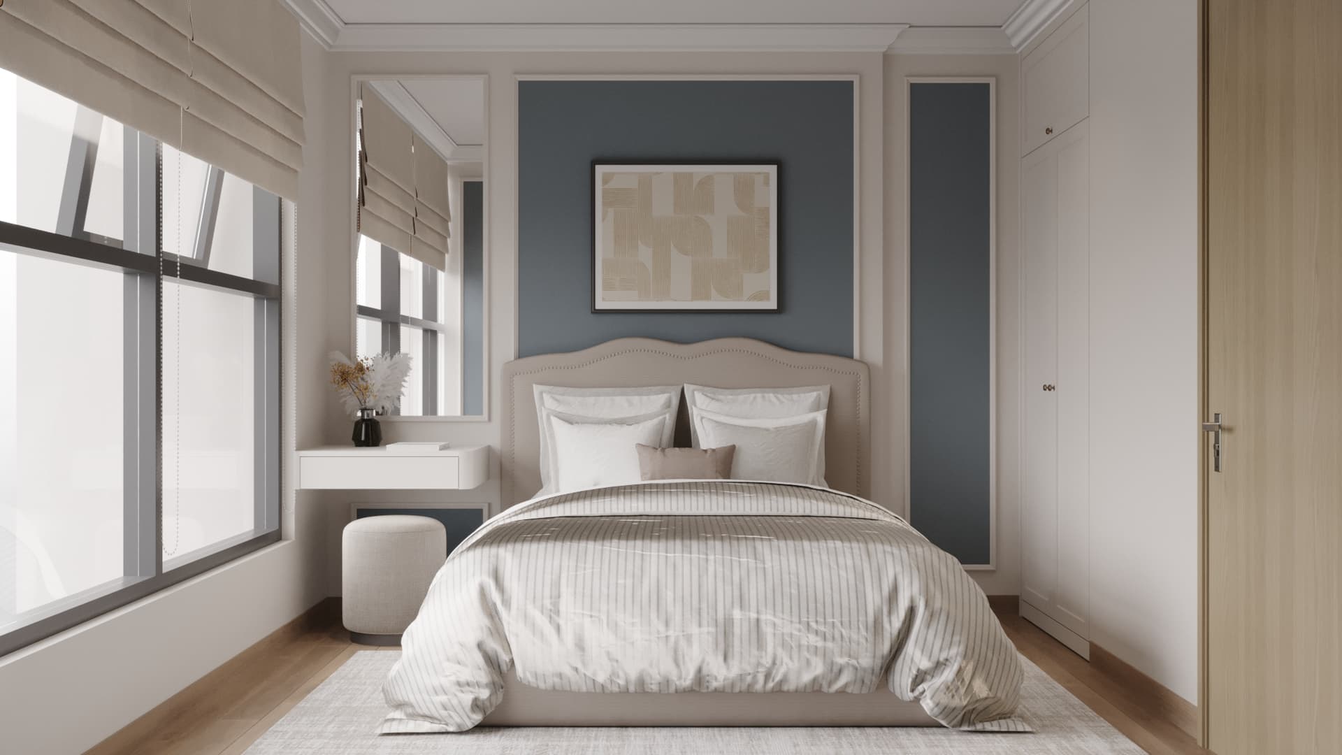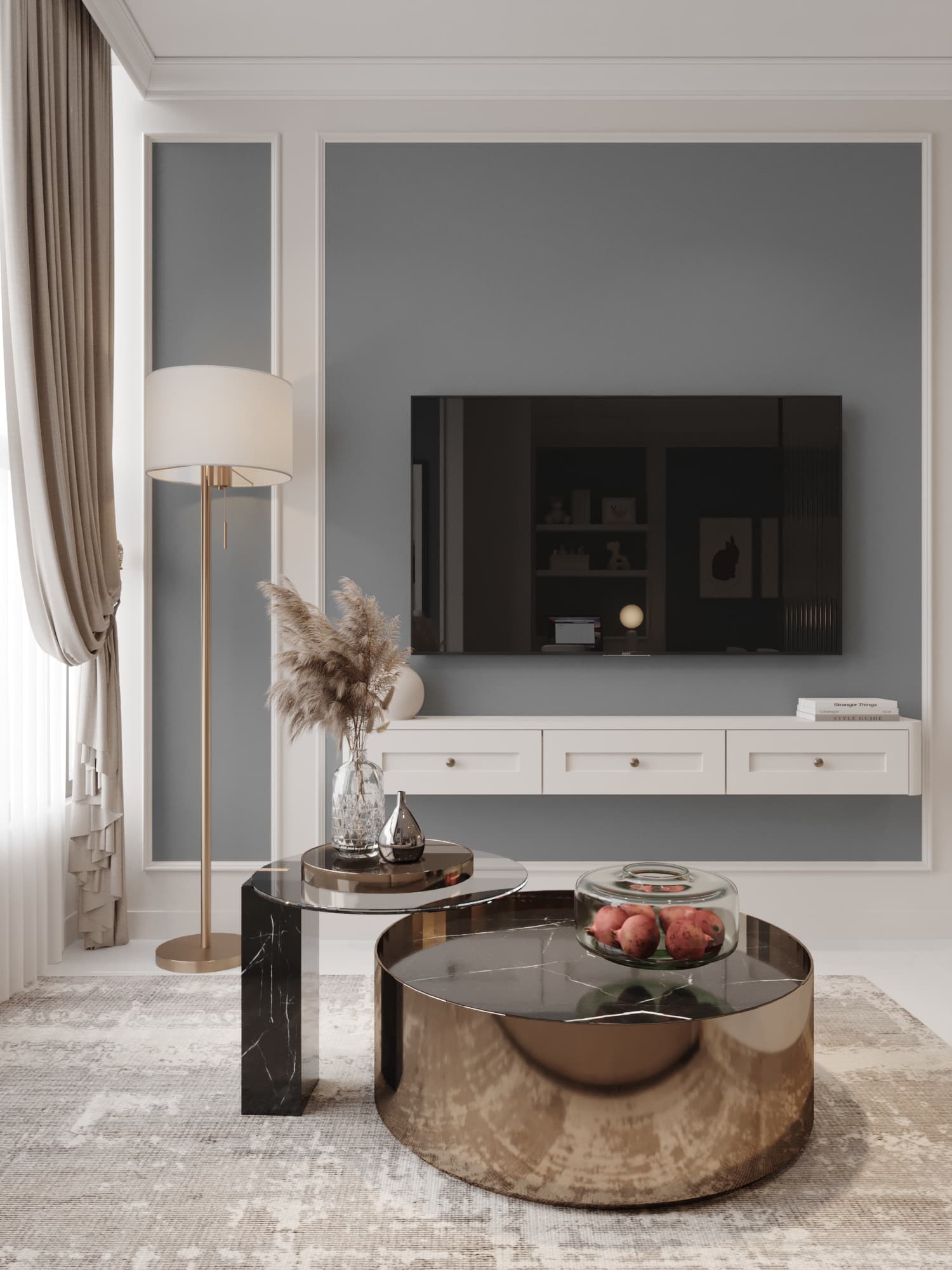 Căn hộ mang phong cách tân cổ điển, nổi bật với gam màu trung tính sang trọng, phào chỉ tinh tế và nội thất hiện đại pha chút cổ điển. Sự kết hợp hài hòa giữa đường nét mềm mại, ánh sáng ấm áp và chất liệu cao cấp tạo nên không gian sống thanh lịch, tinh tế và đầy cuốn hút
