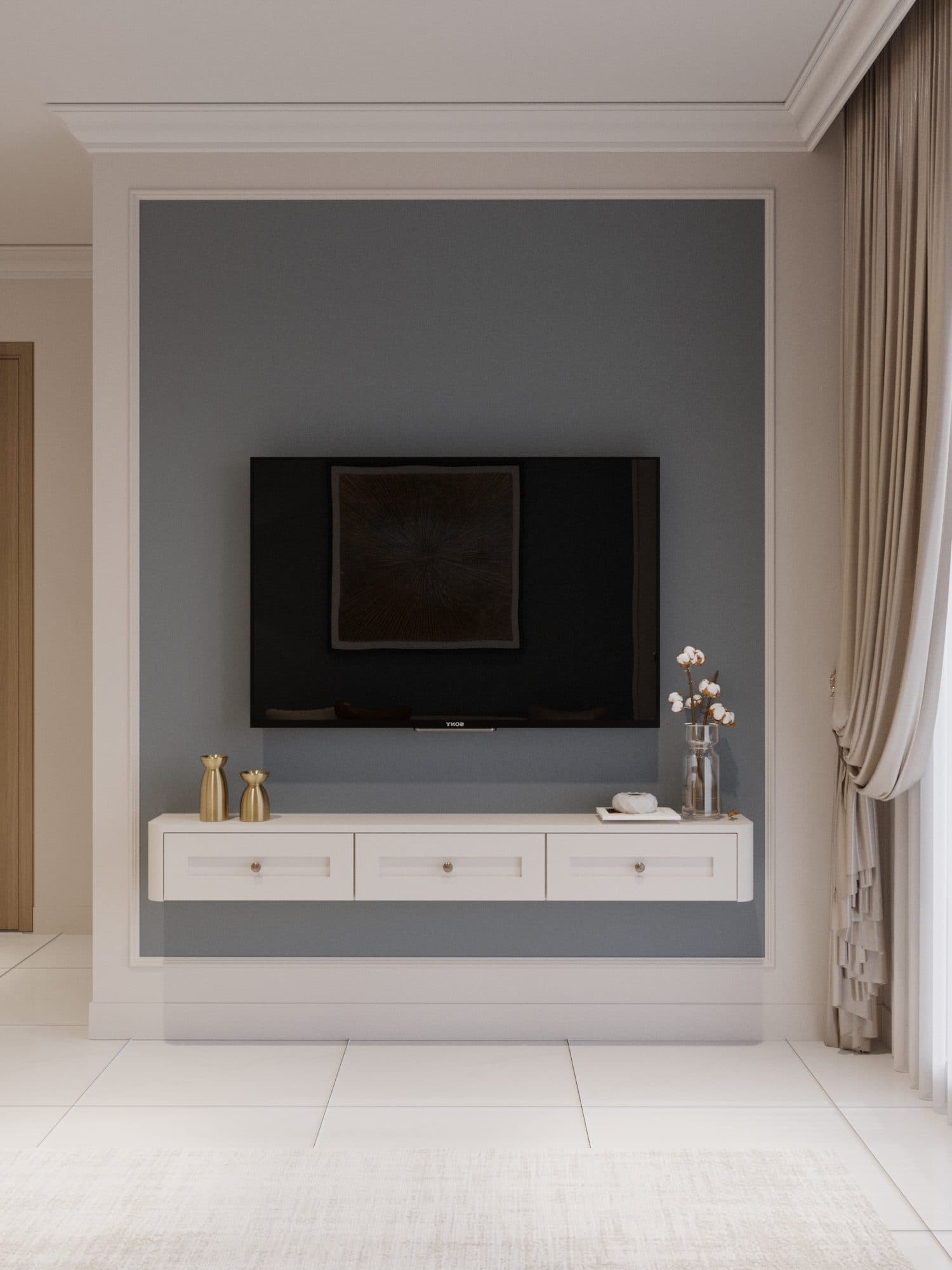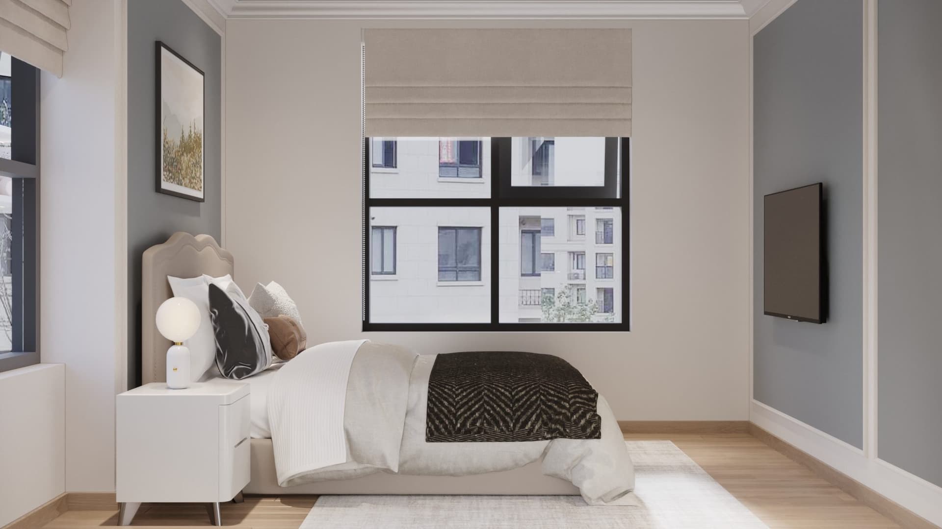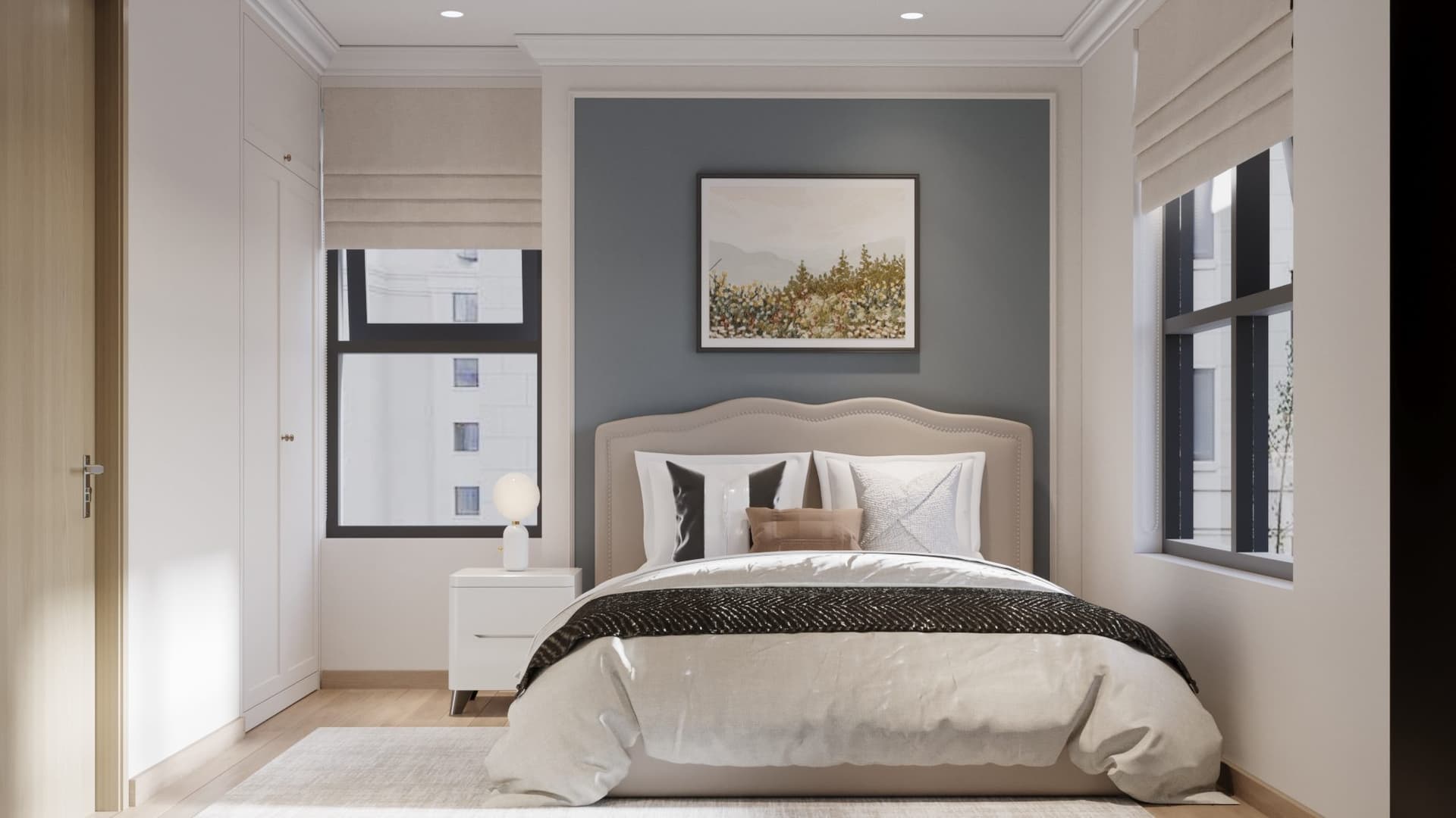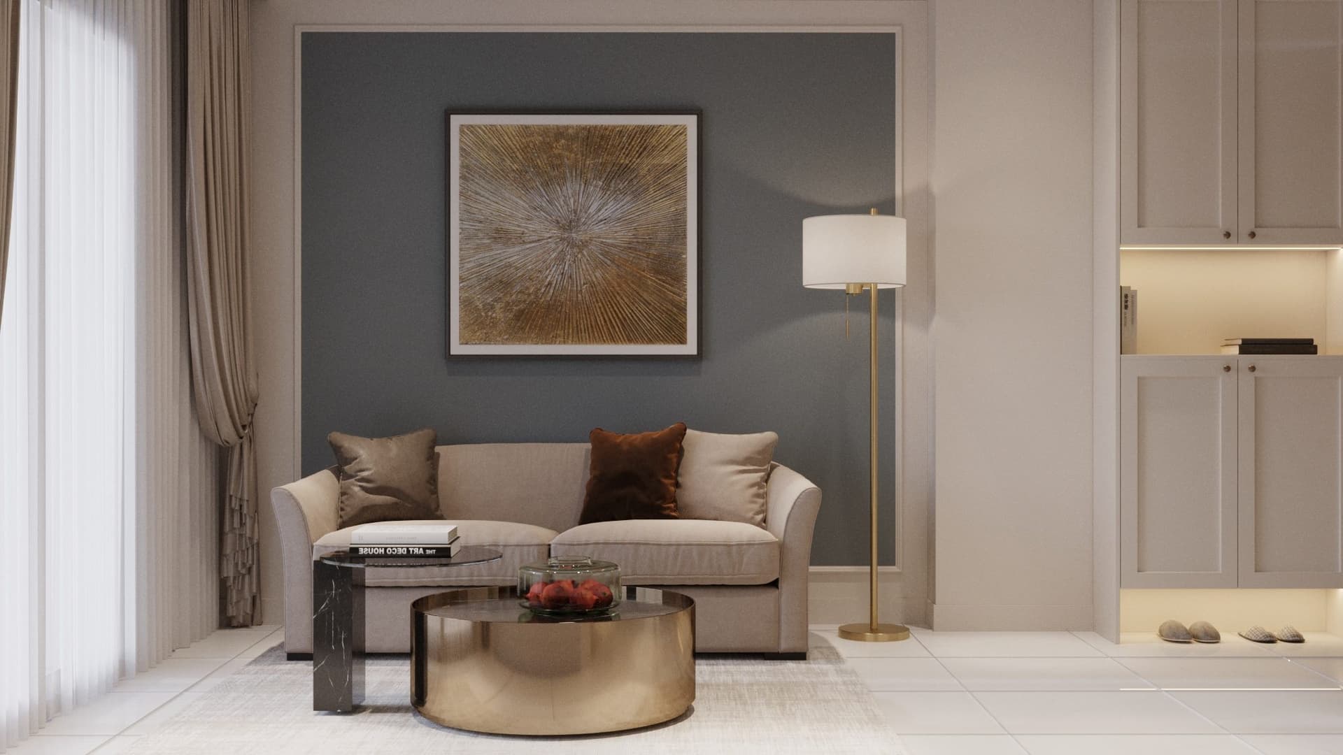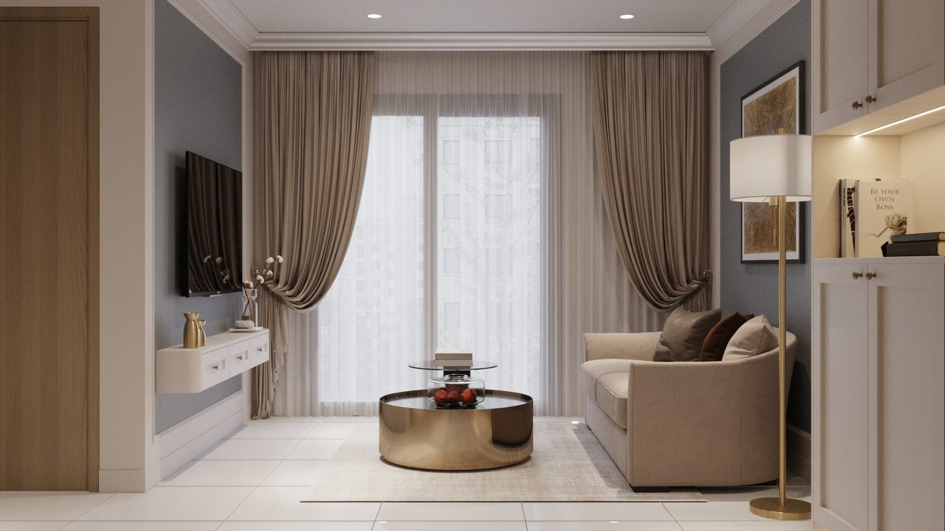 Căn hộ mang phong cách tân cổ điển, nổi bật với gam màu trung tính sang trọng, phào chỉ tinh tế và nội thất hiện đại pha chút cổ điển. Sự kết hợp hài hòa giữa đường nét mềm mại, ánh sáng ấm áp và chất liệu cao cấp tạo nên không gian sống thanh lịch, tinh tế và đầy cuốn hút