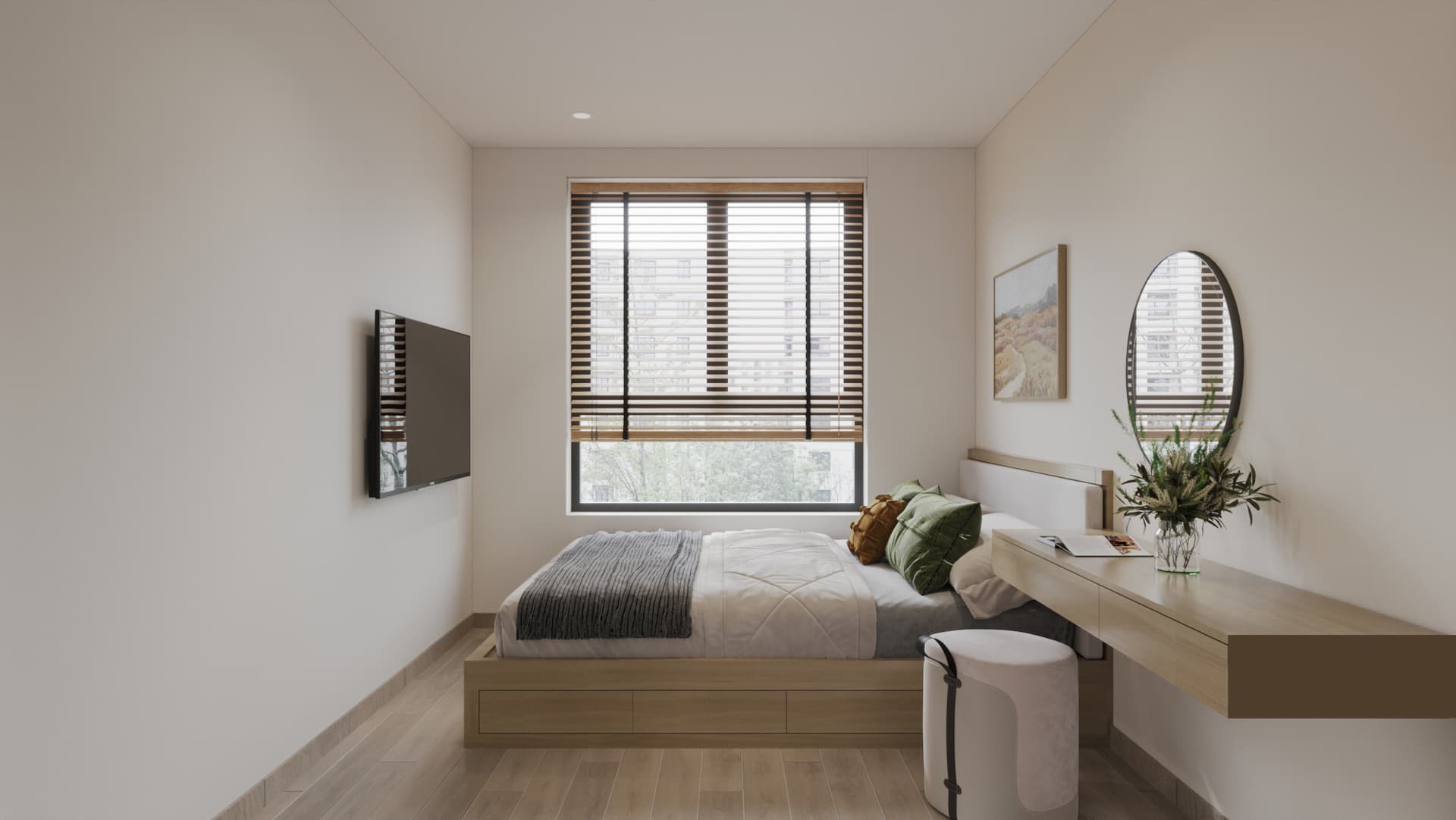 Căn hộ được thiết kế theo phong cách tối giản, nổi bật với gam màu trung tính nhẹ nhàng, đường nét gọn gàng và bố cục hài hòa. Nội thất tinh giản nhưng tiện nghi, kết hợp ánh sáng tự nhiên và vài điểm nhấn trang trí tinh tế, mang lại không gian sống thanh lịch, ấm cúng và thoáng đãng