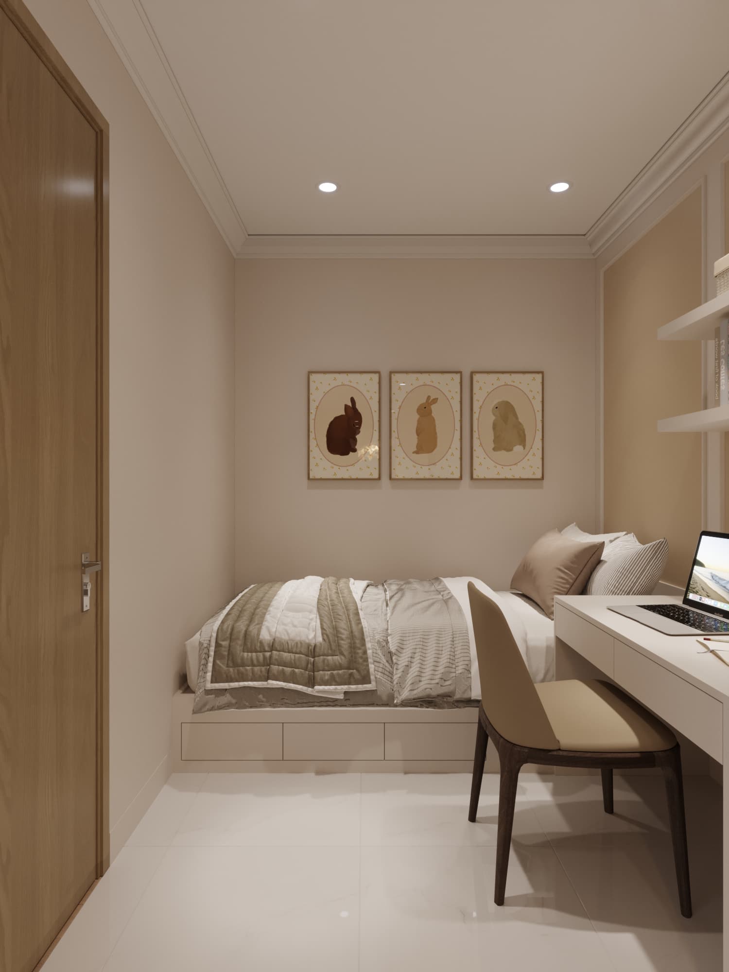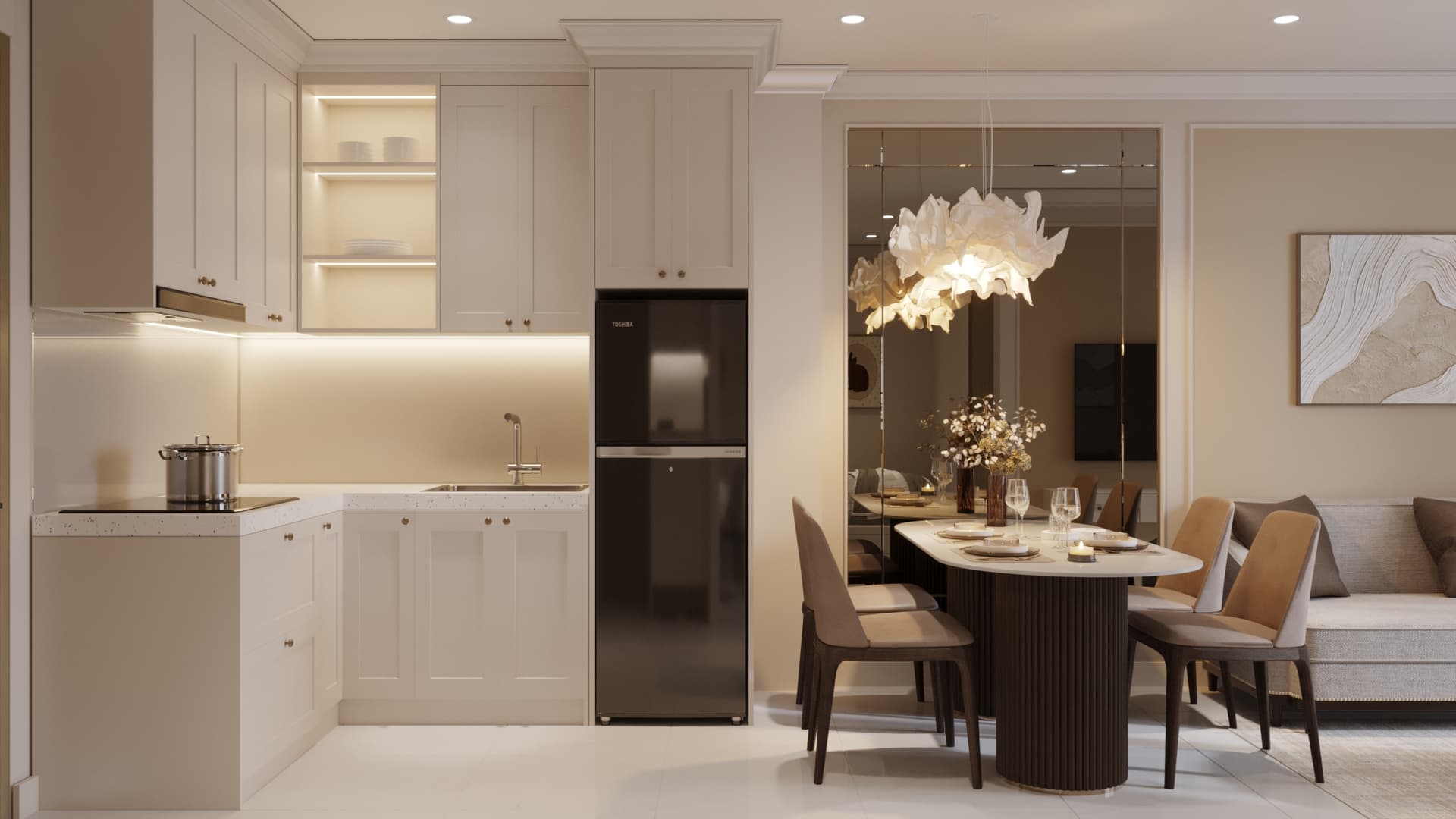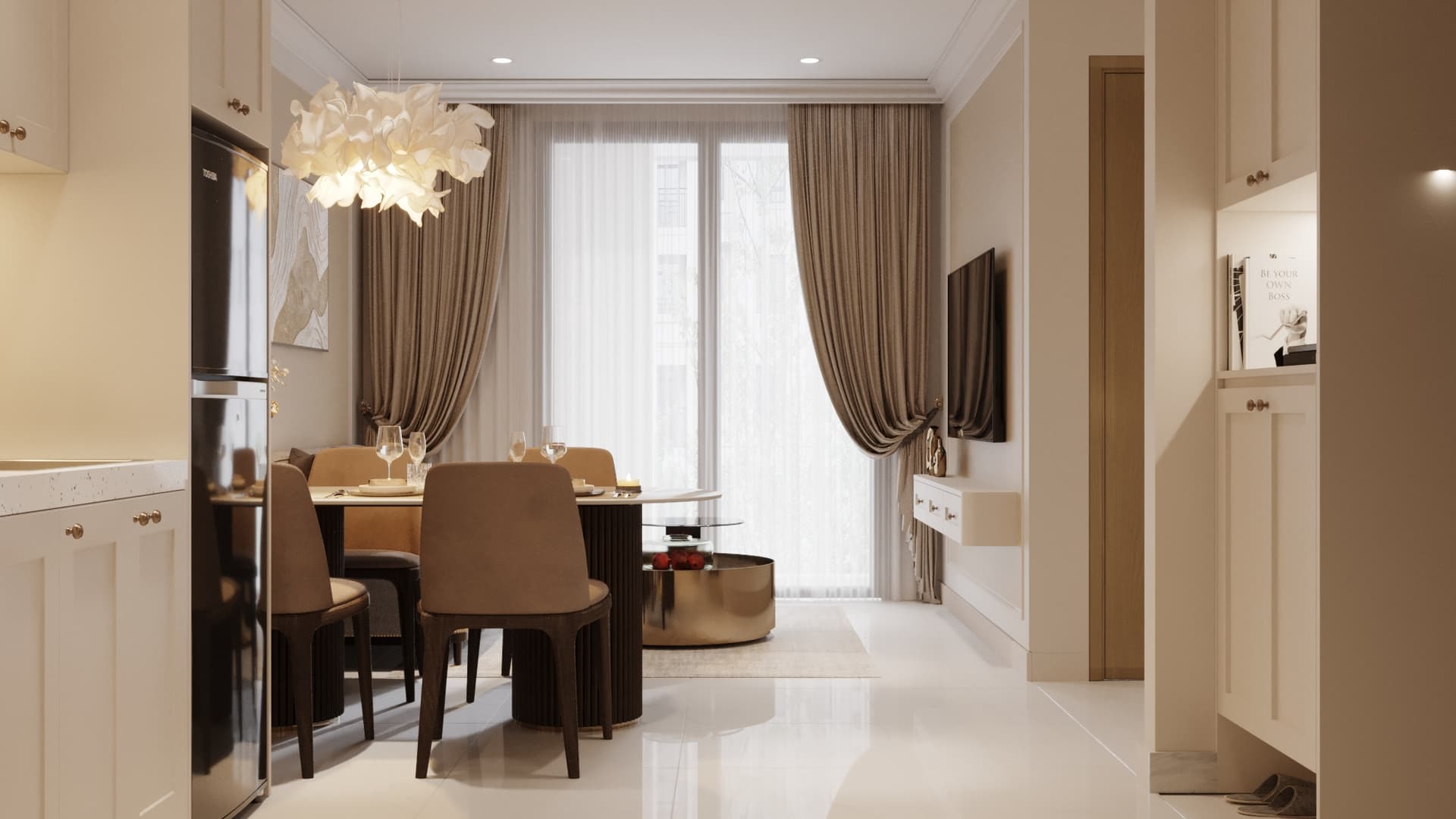 Căn hộ mang phong cách tân cổ điển, nổi bật với gam màu trung tính sang trọng, phào chỉ tinh tế và nội thất hiện đại pha chút cổ điển. Sự kết hợp hài hòa giữa đường nét mềm mại, ánh sáng ấm áp và chất liệu cao cấp tạo nên không gian sống thanh lịch, tinh tế và đầy cuốn hút
