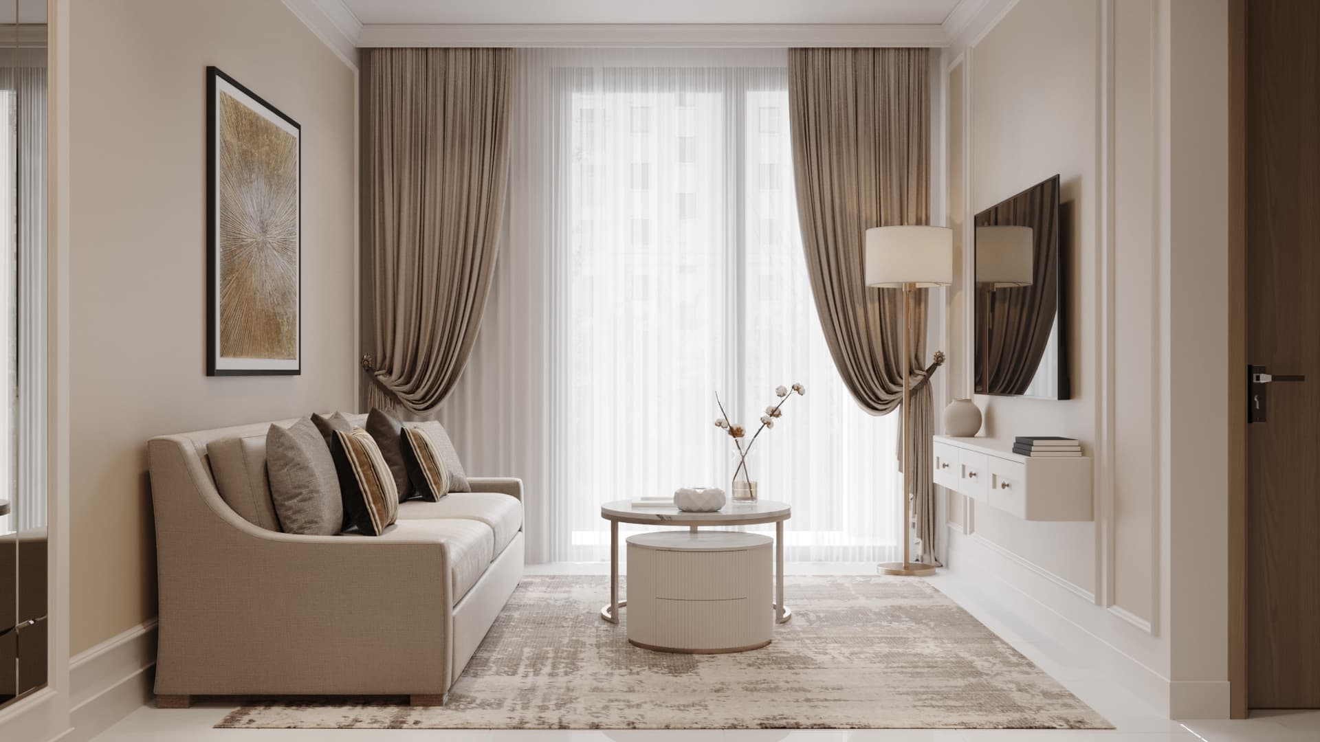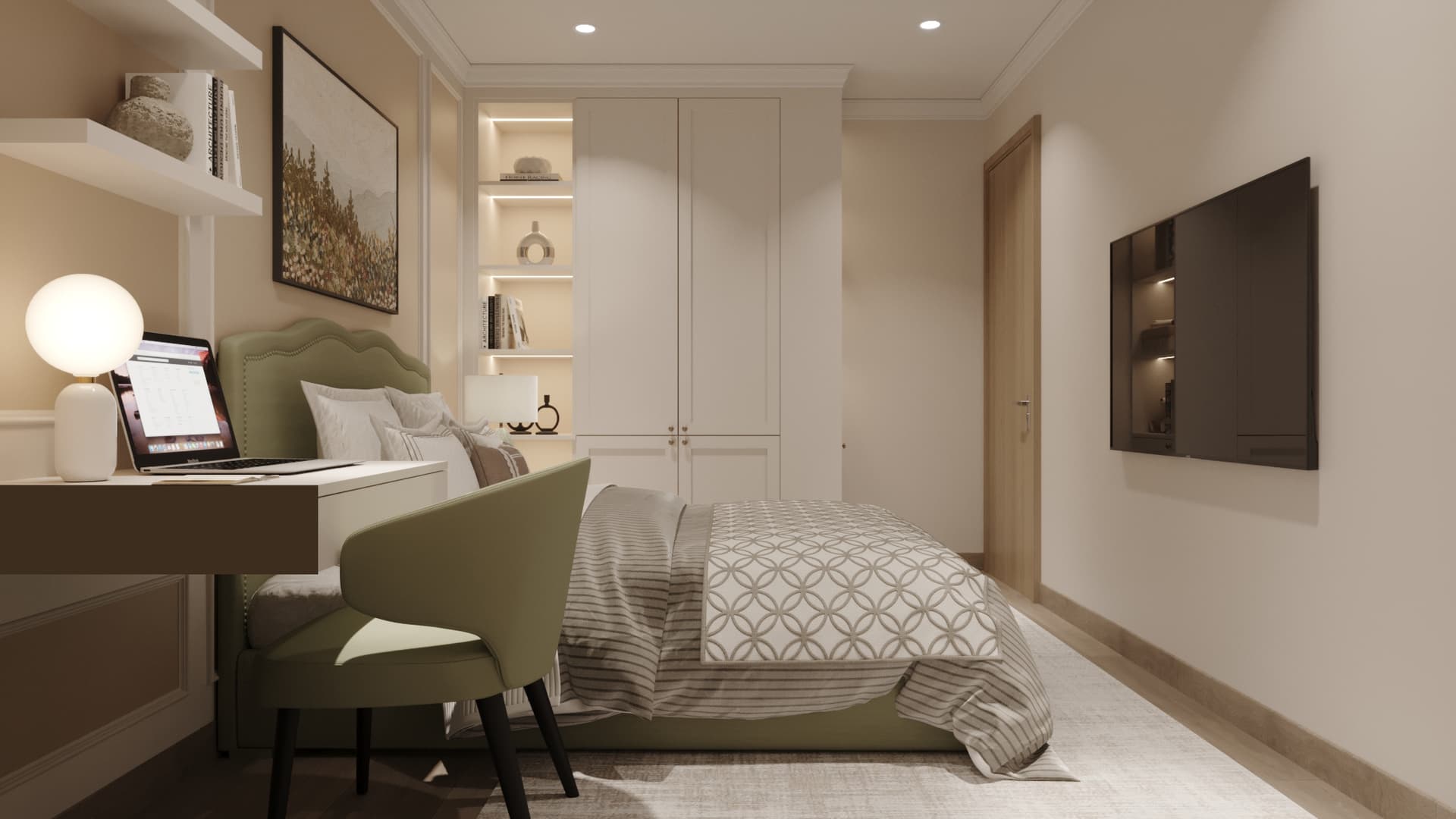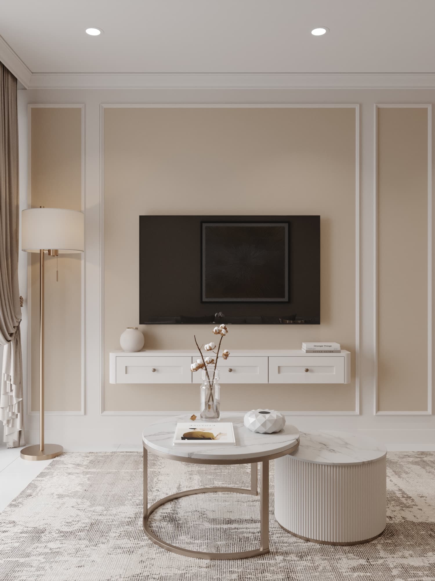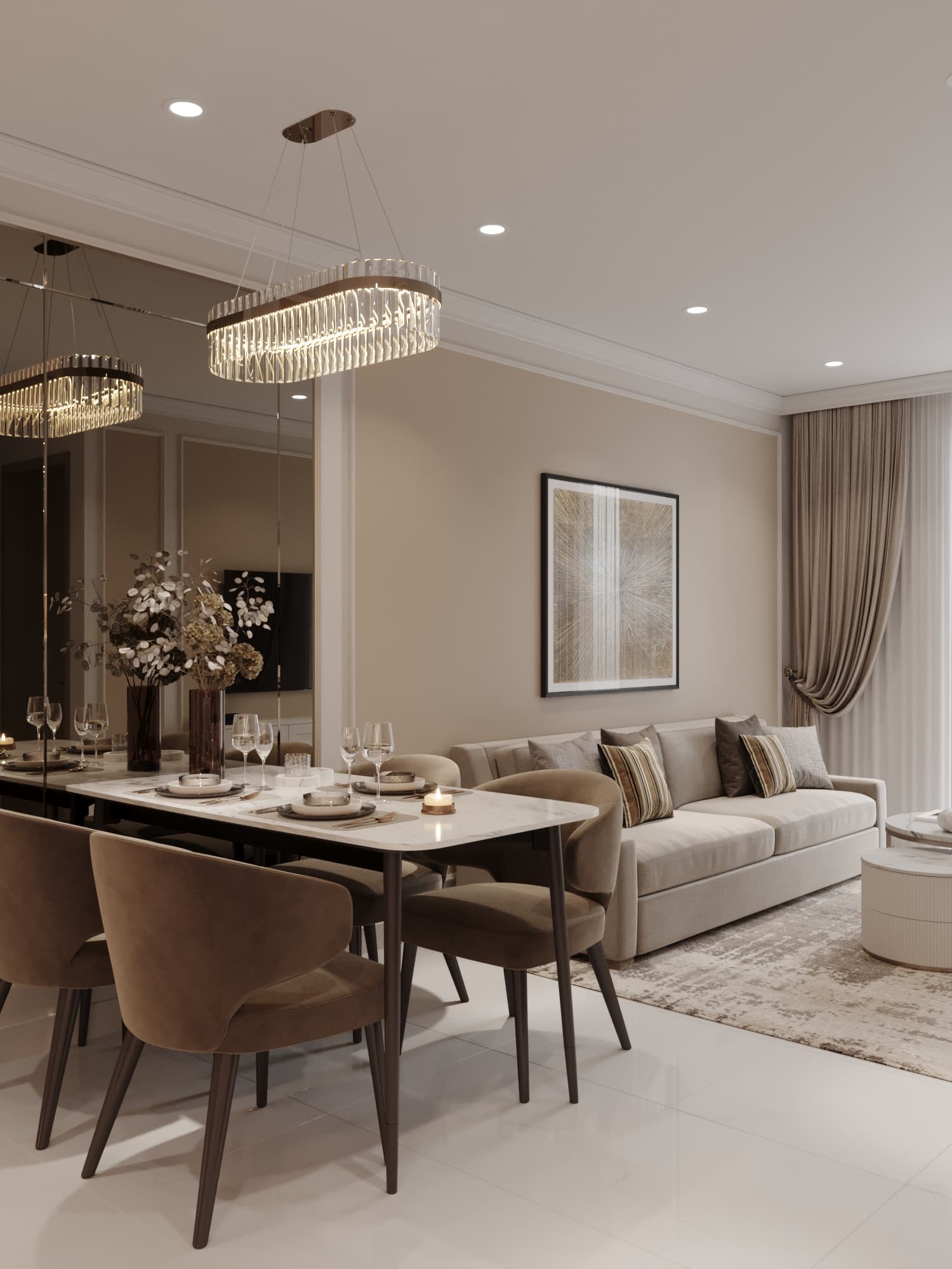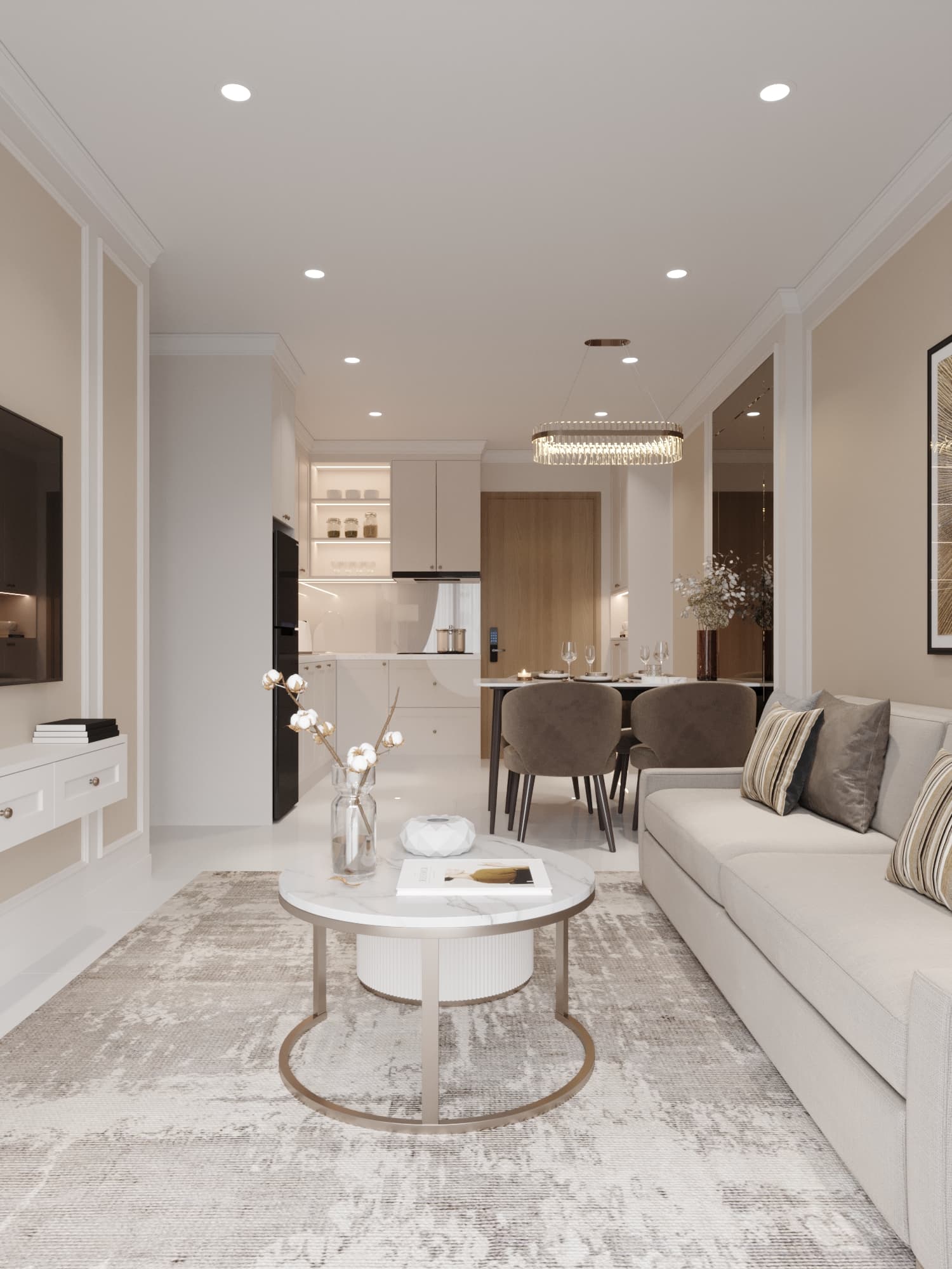 Căn hộ mang phong cách tân cổ điển, nổi bật với gam màu trung tính sang trọng, phào chỉ tinh tế và nội thất hiện đại pha chút cổ điển. Sự kết hợp hài hòa giữa đường nét mềm mại, ánh sáng ấm áp và chất liệu cao cấp tạo nên không gian sống thanh lịch, tinh tế và đầy cuốn hút