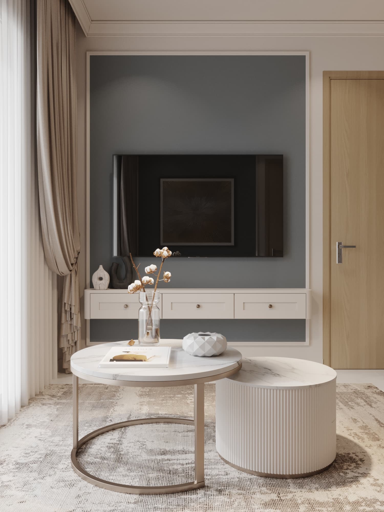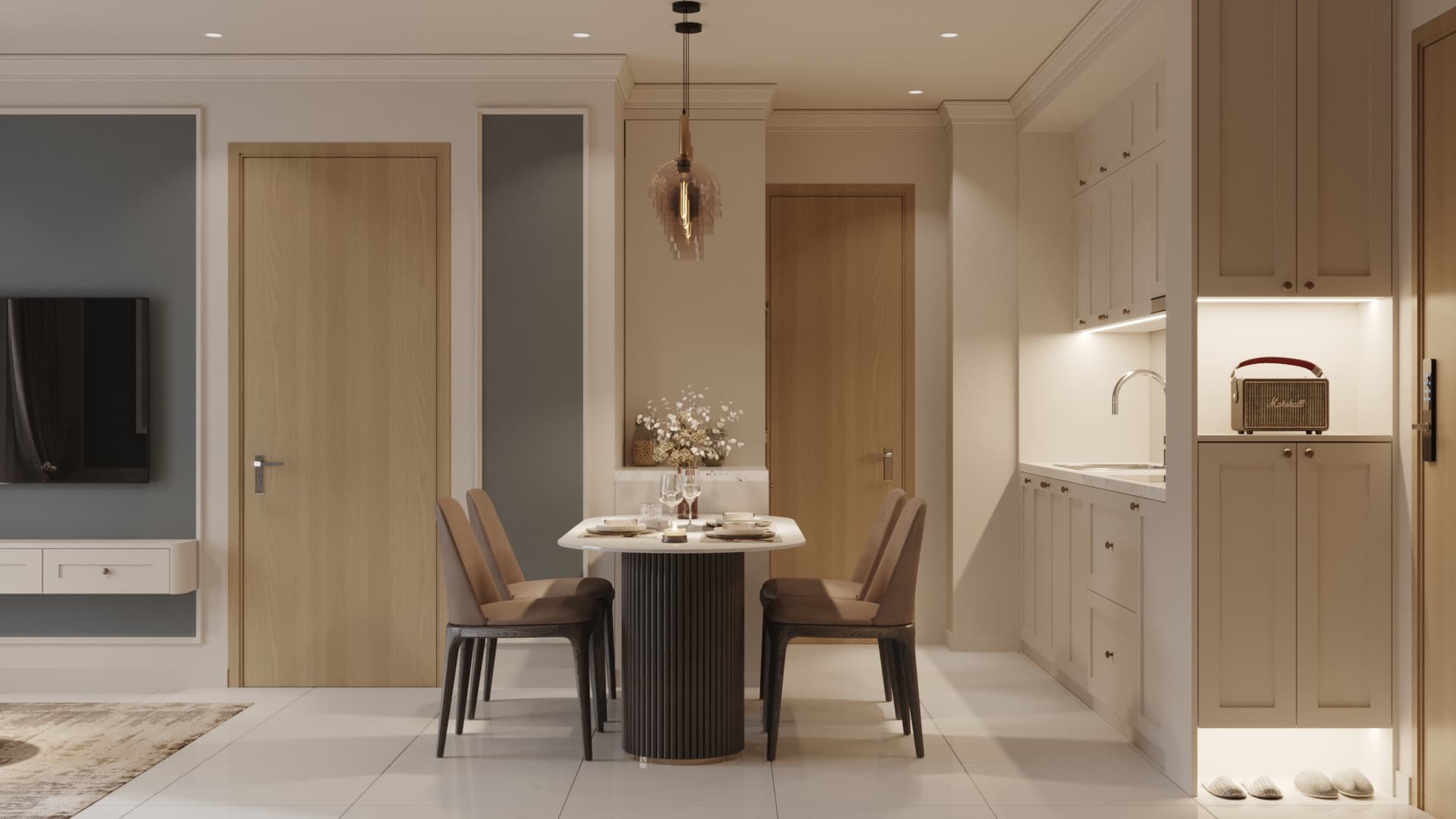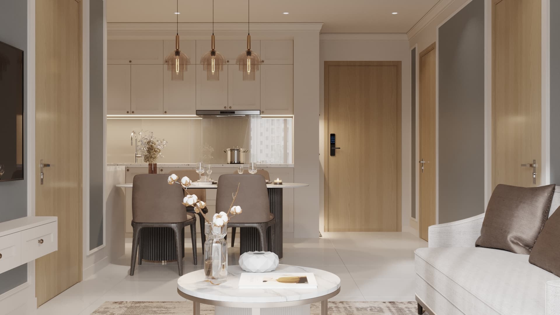 Căn hộ mang phong cách tân cổ điển, nổi bật với gam màu trung tính sang trọng, phào chỉ tinh tế và nội thất hiện đại pha chút cổ điển. Sự kết hợp hài hòa giữa đường nét mềm mại, ánh sáng ấm áp và chất liệu cao cấp tạo nên không gian sống thanh lịch, tinh tế và đầy cuốn hút