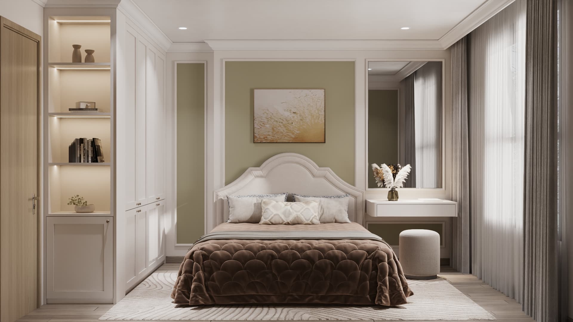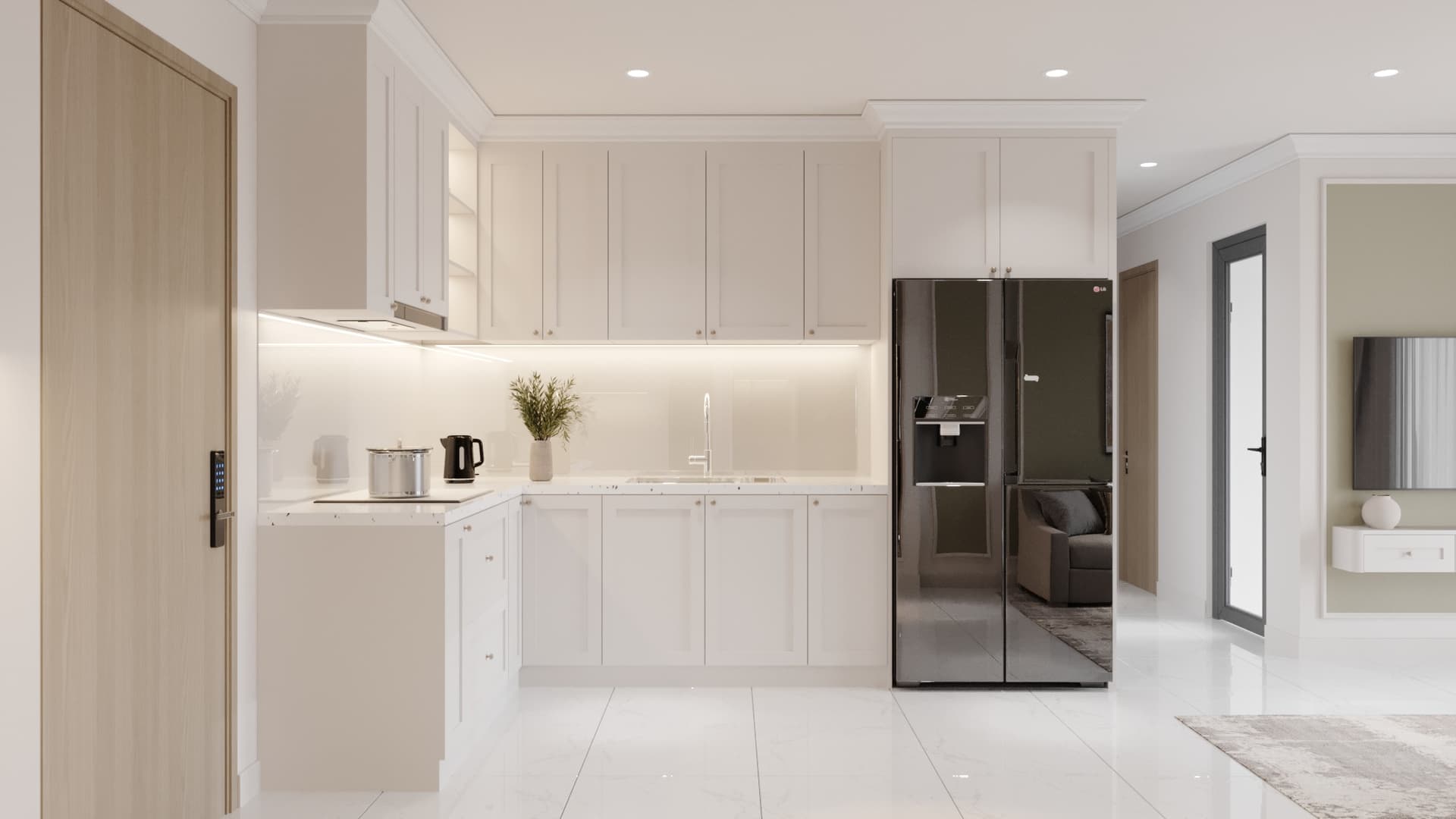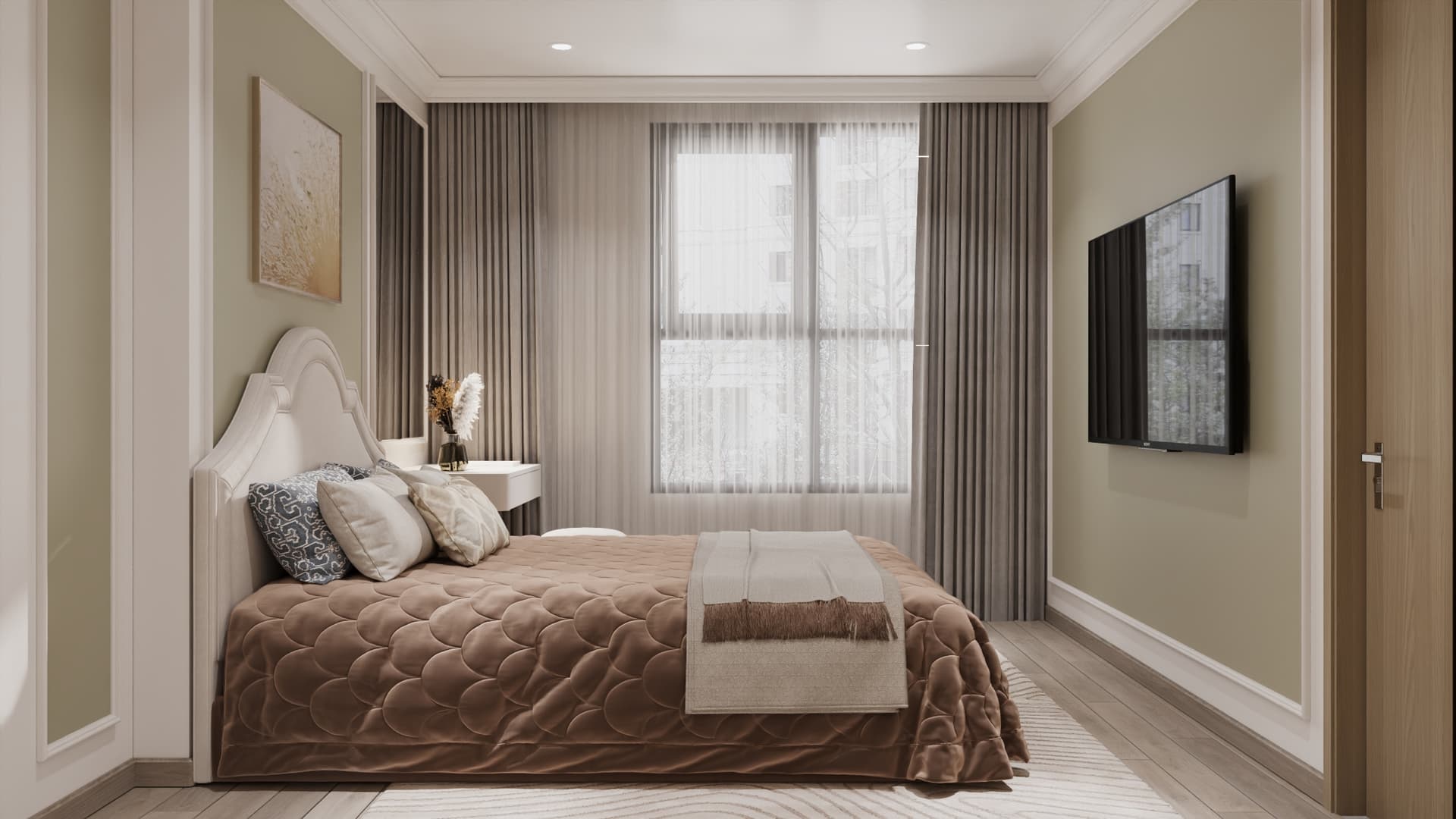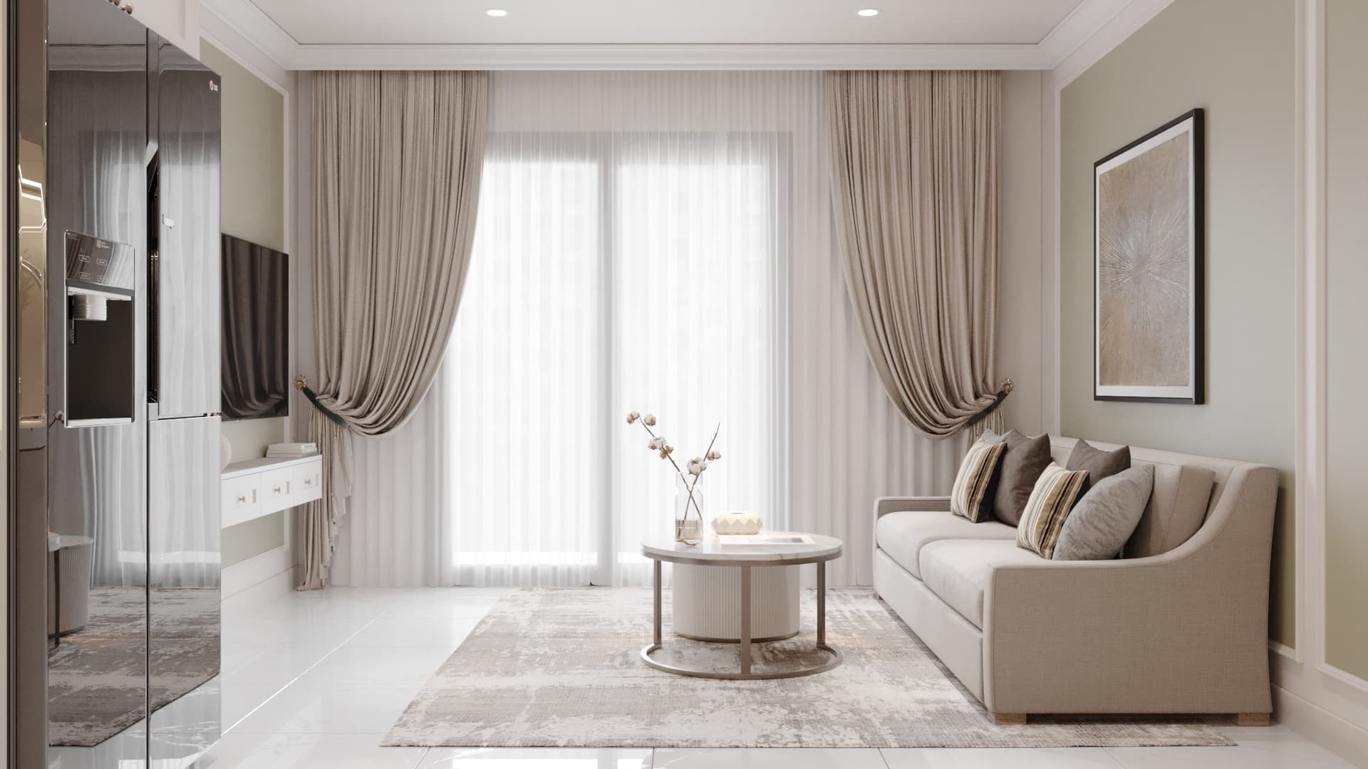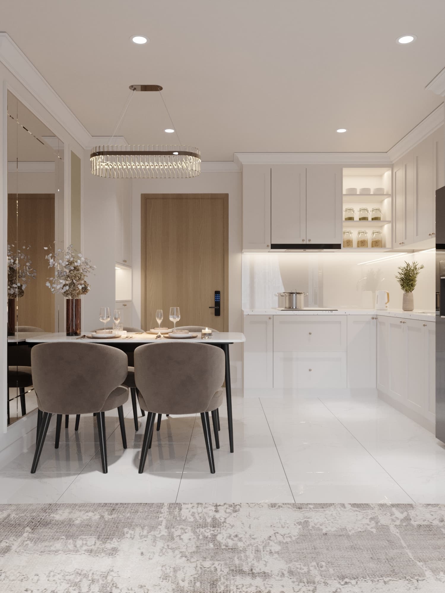 Căn hộ mang phong cách tân cổ điển, nổi bật với gam màu trung tính sang trọng, phào chỉ tinh tế và nội thất hiện đại pha chút cổ điển. Sự kết hợp hài hòa giữa đường nét mềm mại, ánh sáng ấm áp và chất liệu cao cấp tạo nên không gian sống thanh lịch, tinh tế và đầy cuốn hút