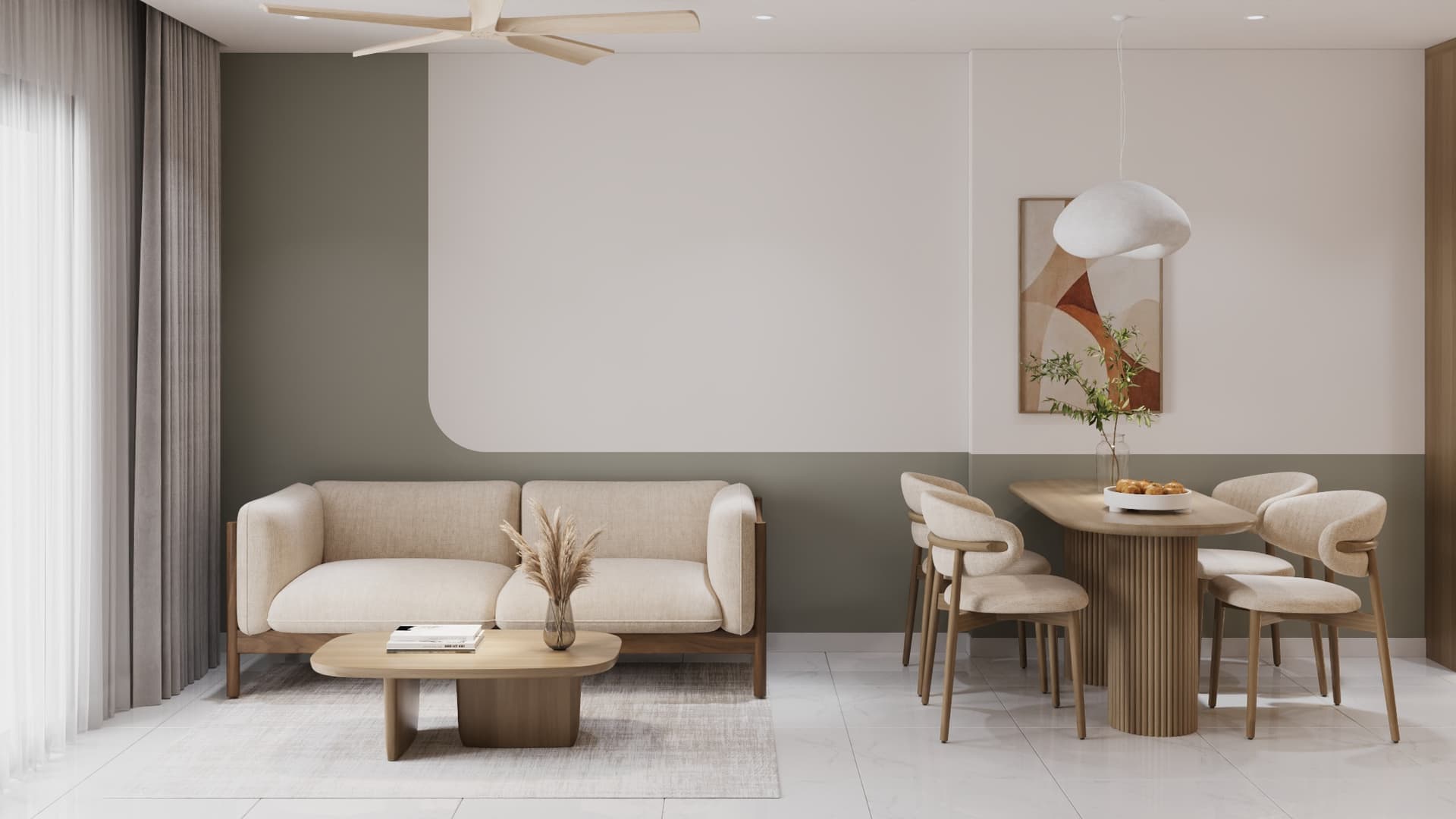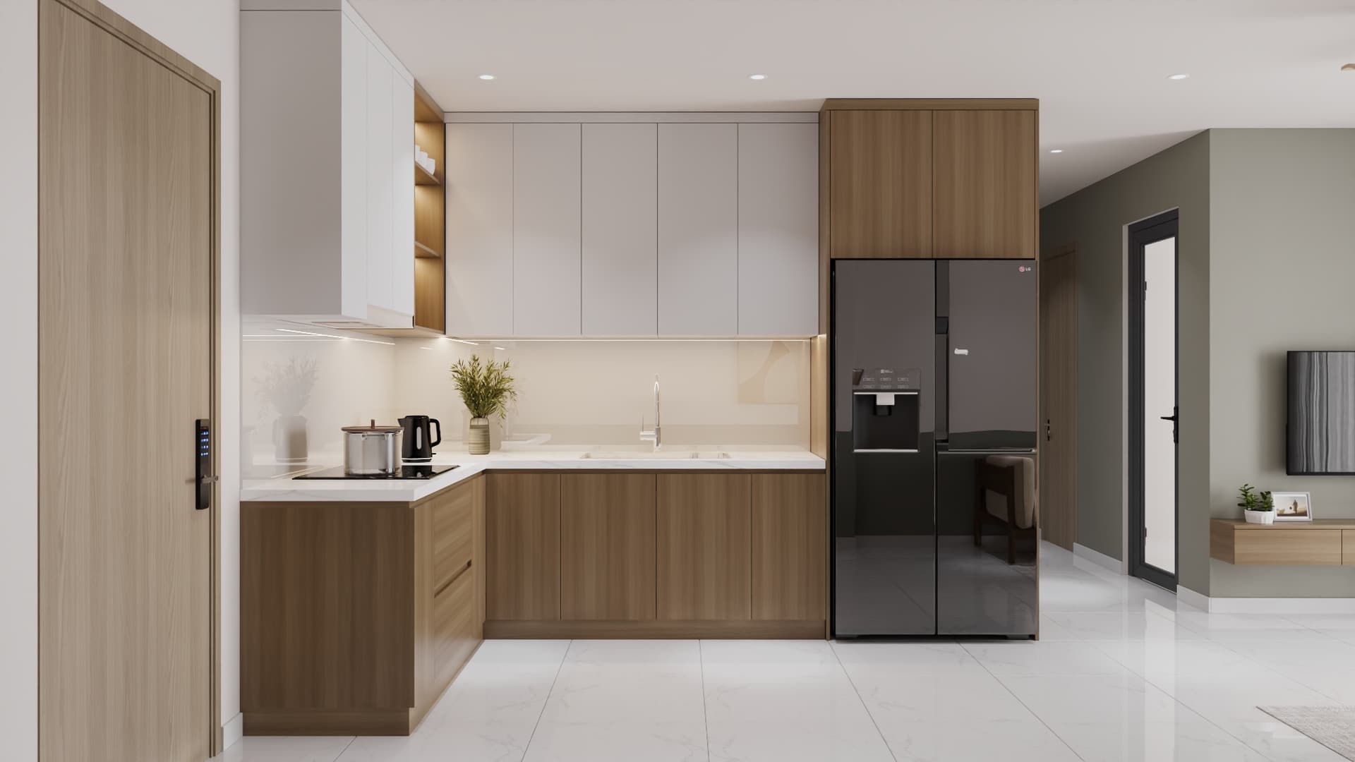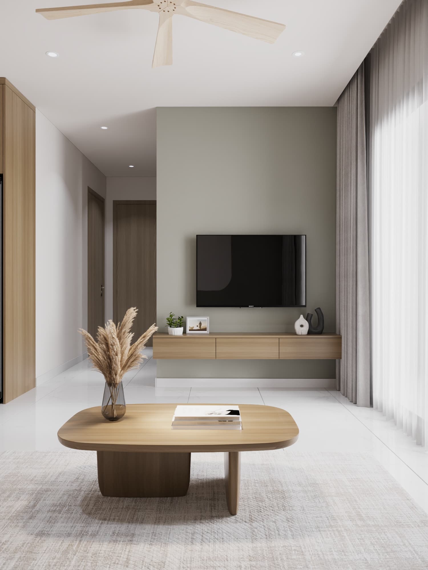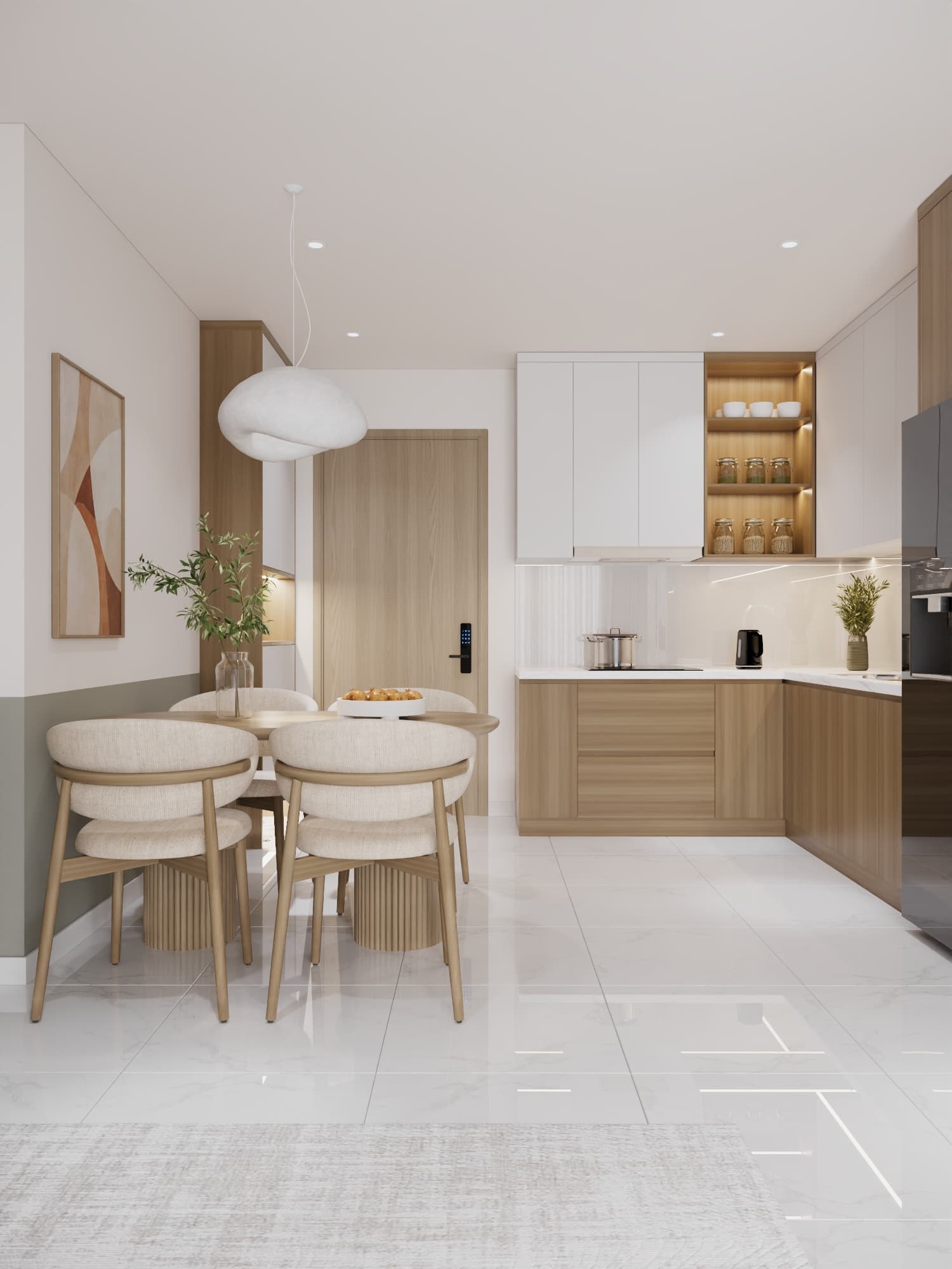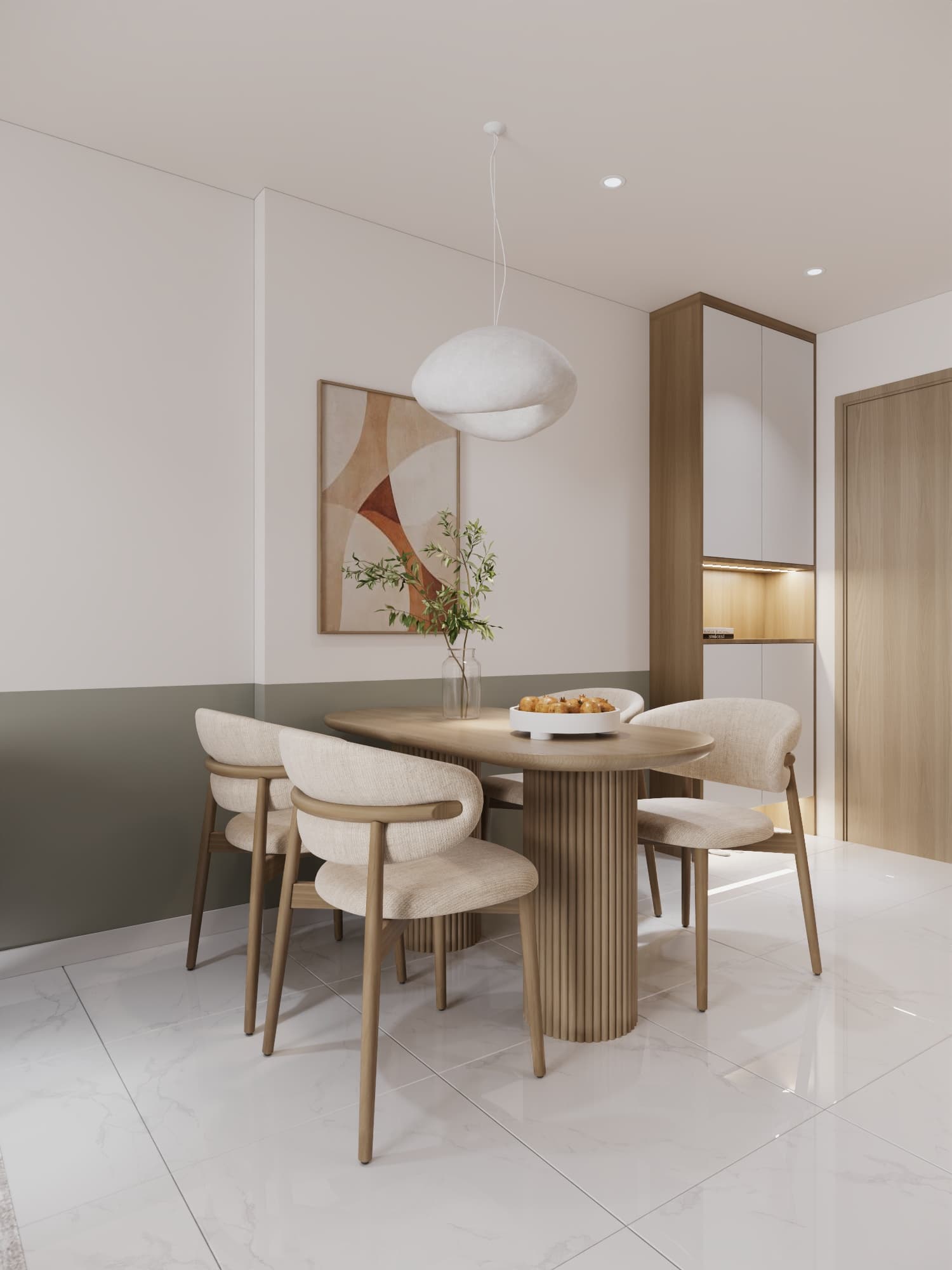 Căn hộ được thiết kế theo phong cách tối giản, nổi bật với gam màu trung tính nhẹ nhàng, đường nét gọn gàng và bố cục hài hòa. Nội thất tinh giản nhưng tiện nghi, kết hợp ánh sáng tự nhiên và vài điểm nhấn trang trí tinh tế, mang lại không gian sống thanh lịch, ấm cúng và thoáng đãng